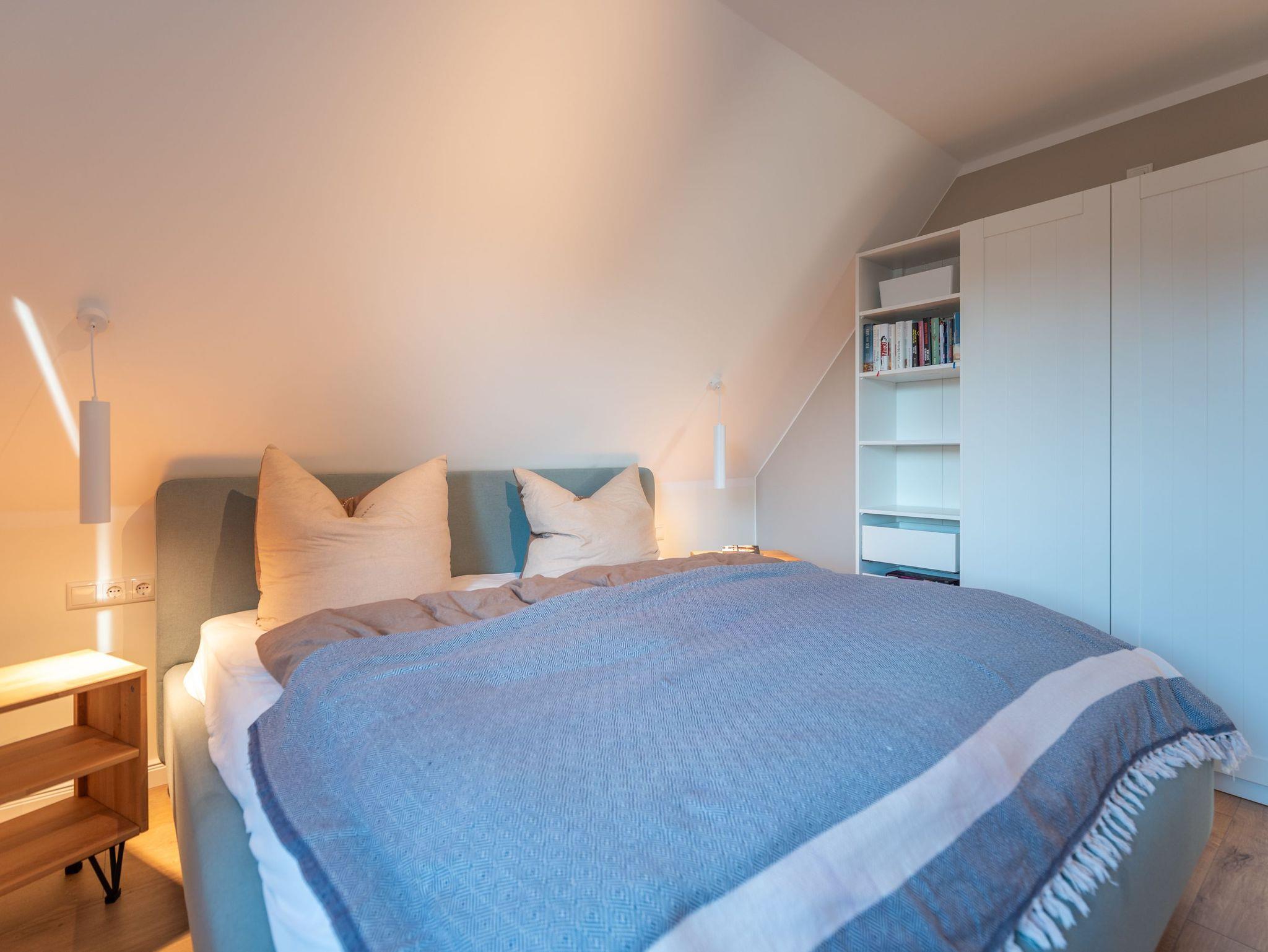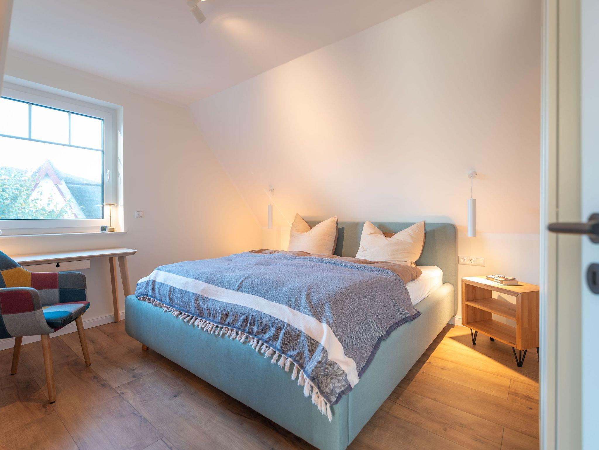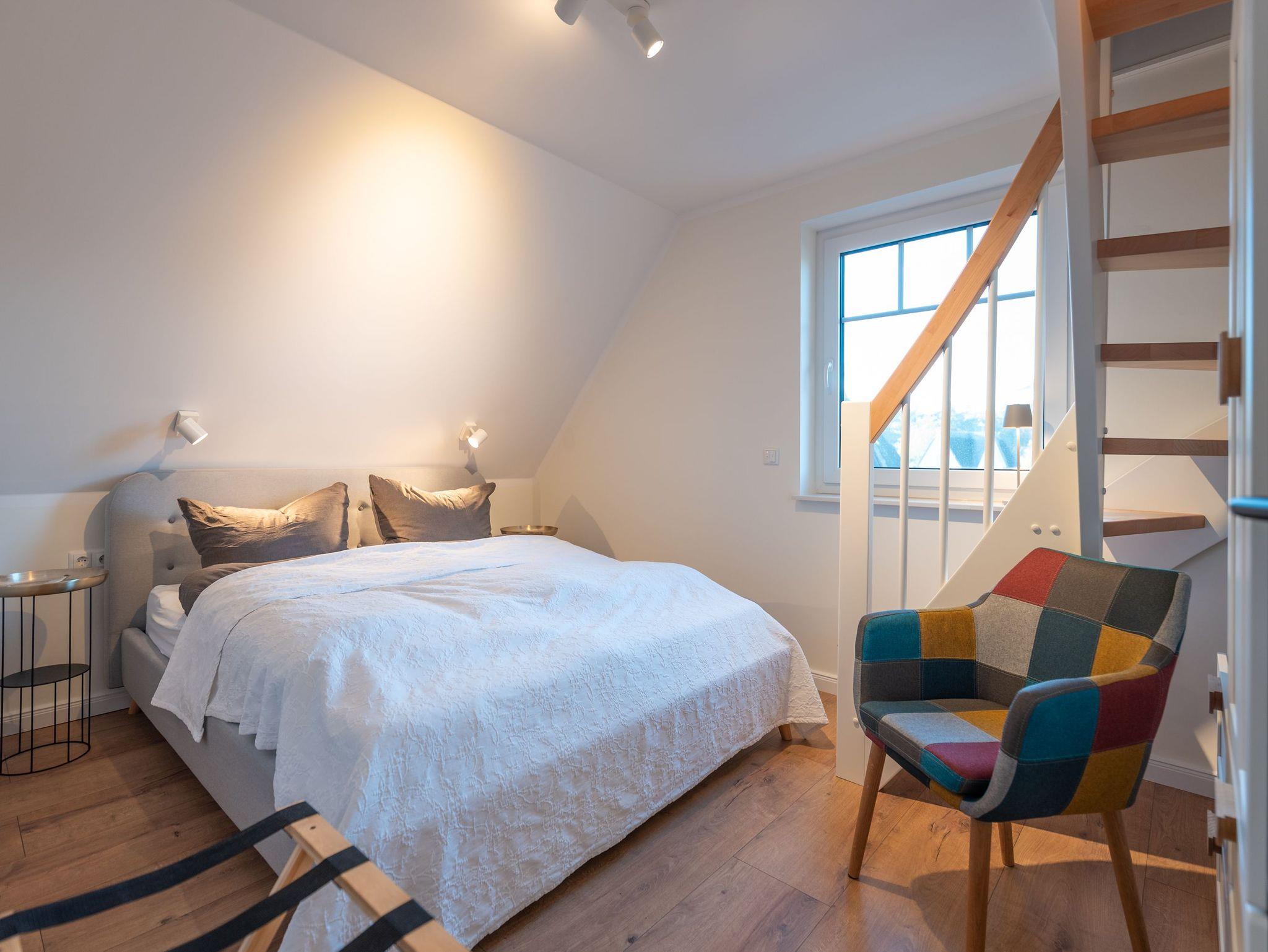 Im Obergeschoss sorgen zwei behagliche Schlafzimmer ? jeweils mit komfortablen Doppelbetten ? für erholsame Nächte. Ausreichend Stauraum für Ihre Urlaubsgarderobe ist ebenfalls vorhanden. Das moderne Badezimmer mit großer Walk-In Dusche, Waschbecken und WC lädt nach einem Strandtag zum Entspannen ein.
