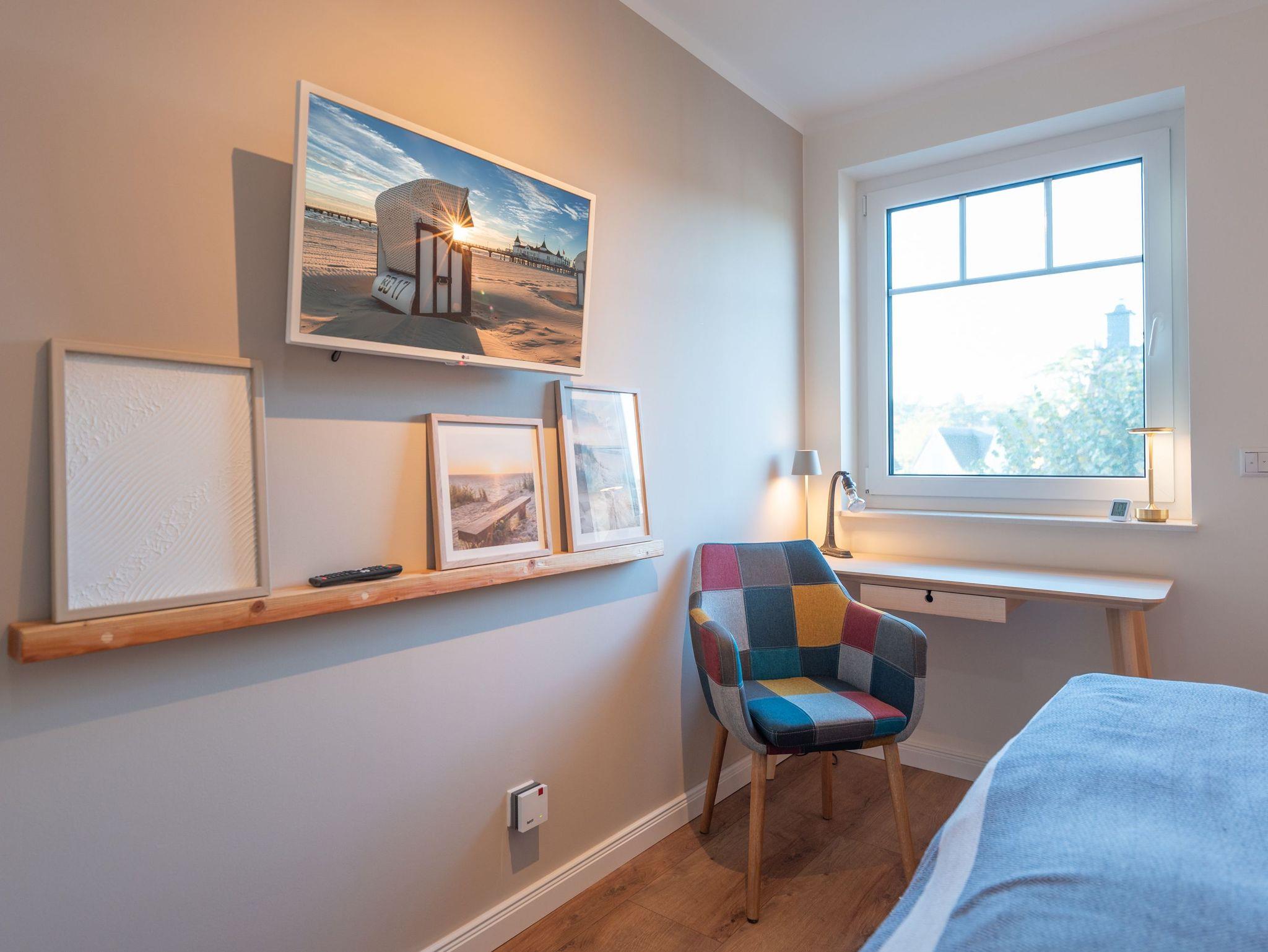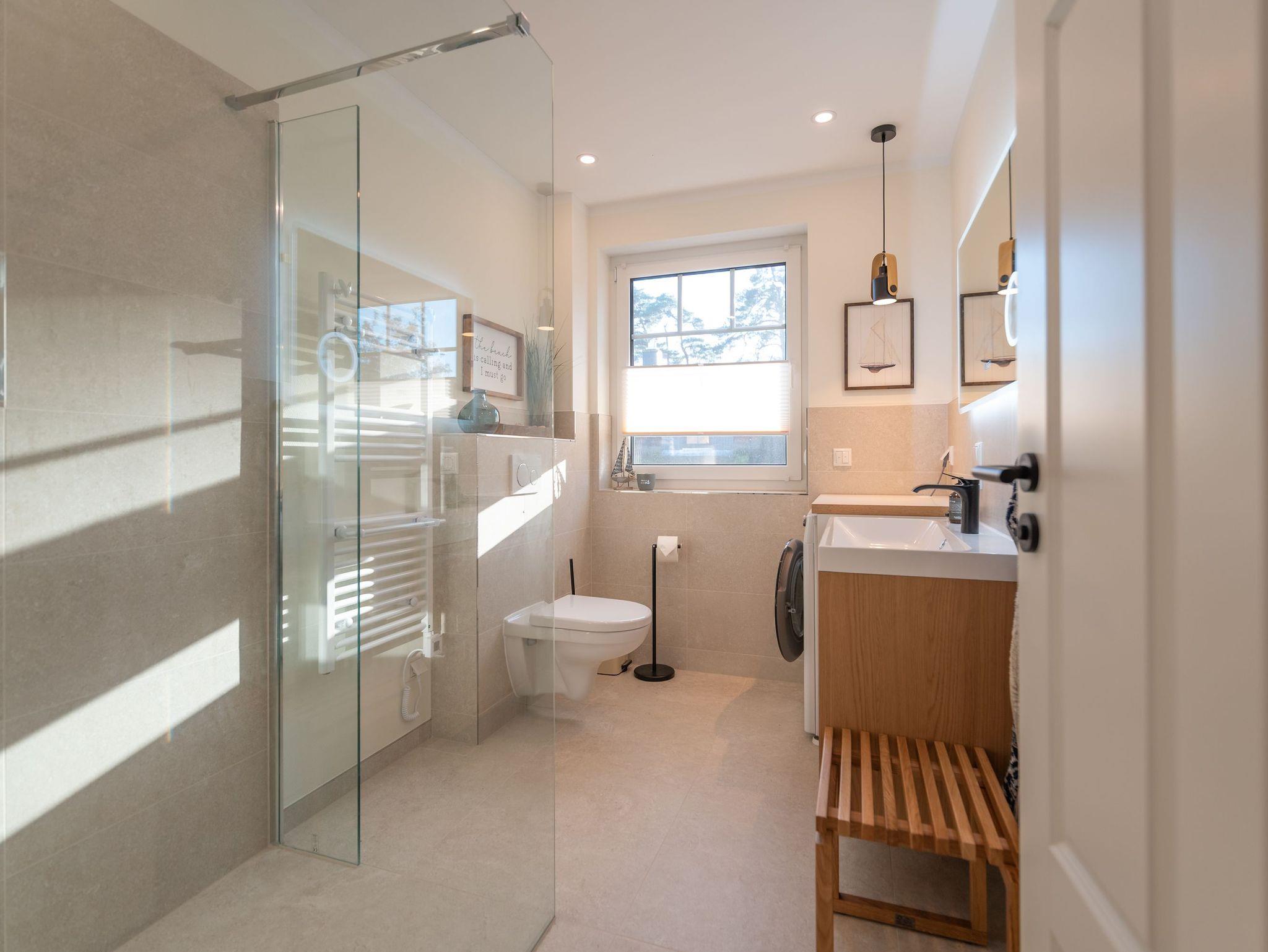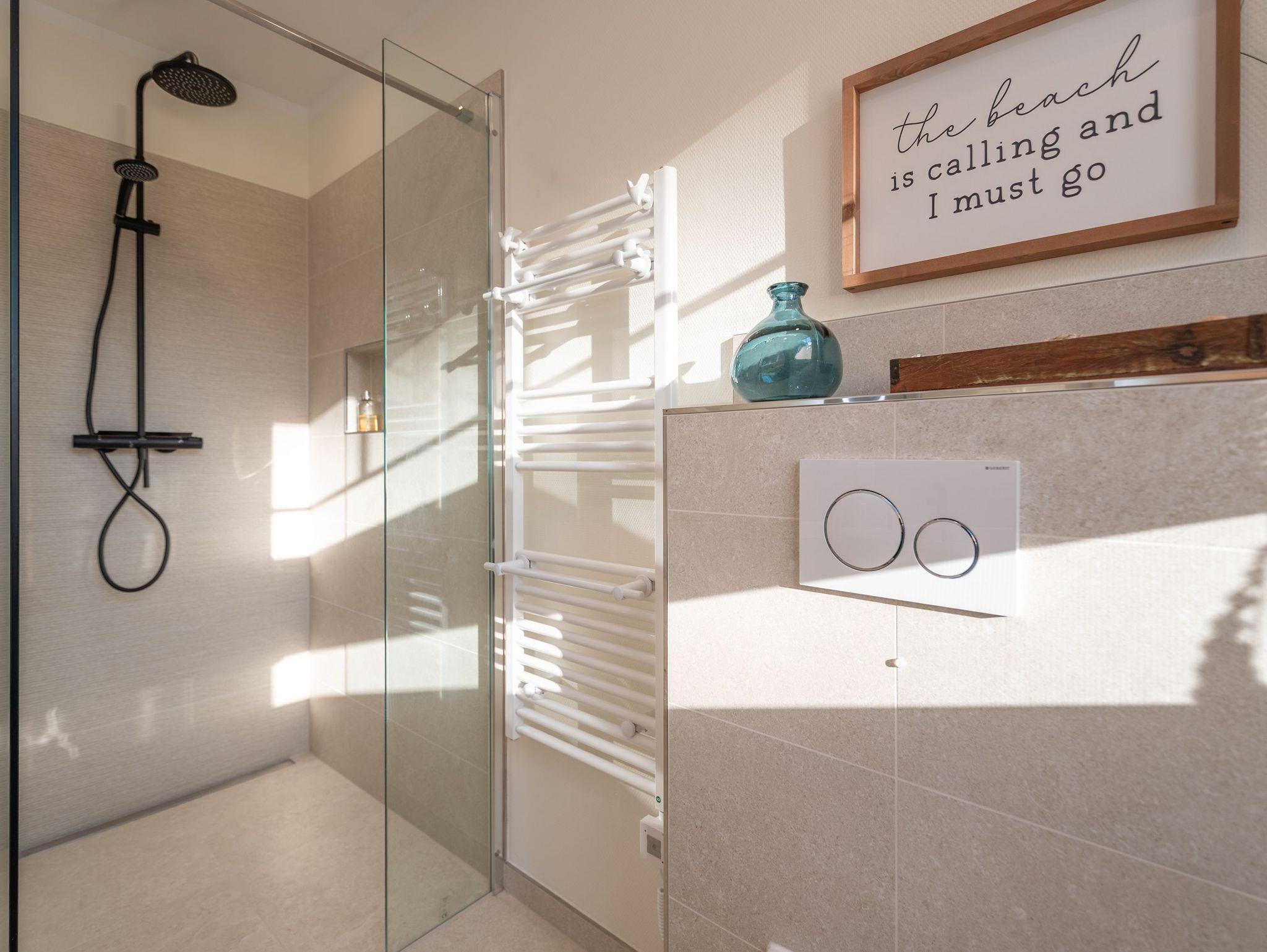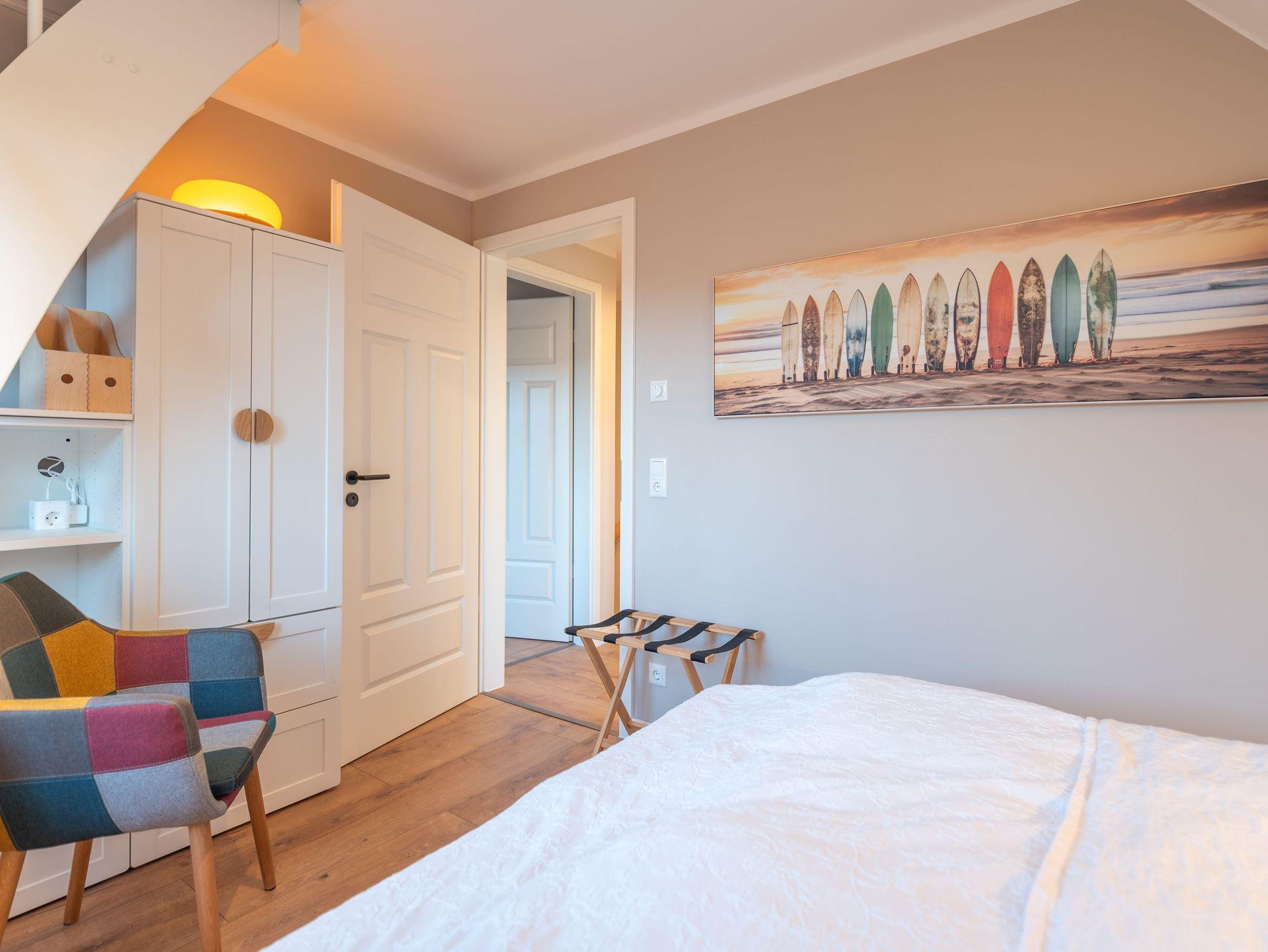 Im Obergeschoss sorgen zwei behagliche Schlafzimmer ? jeweils mit komfortablen Doppelbetten ? für erholsame Nächte. Ausreichend Stauraum für Ihre Urlaubsgarderobe ist ebenfalls vorhanden. Das moderne Badezimmer mit großer Walk-In Dusche, Waschbecken und WC lädt nach einem Strandtag zum Entspannen ein.