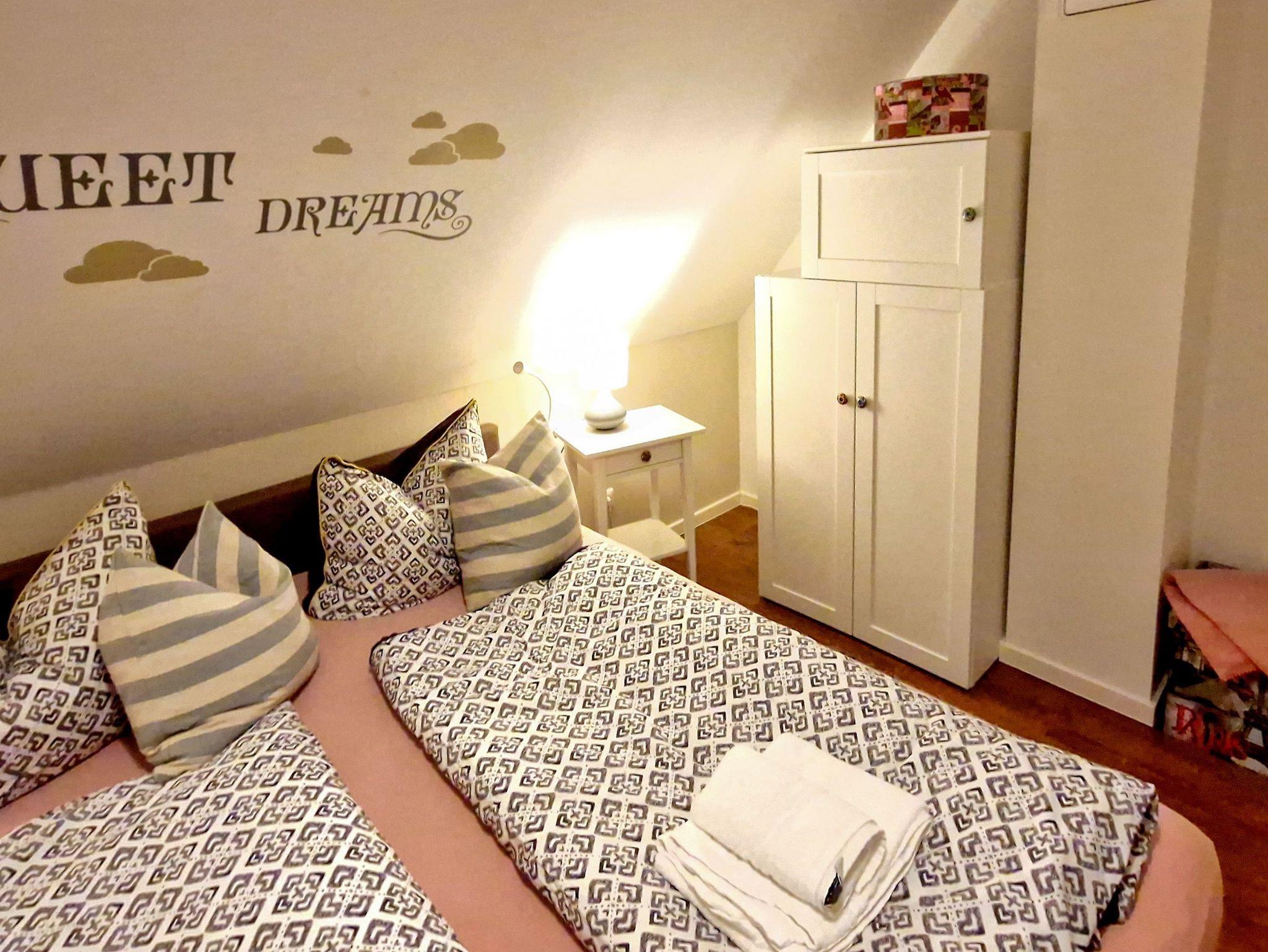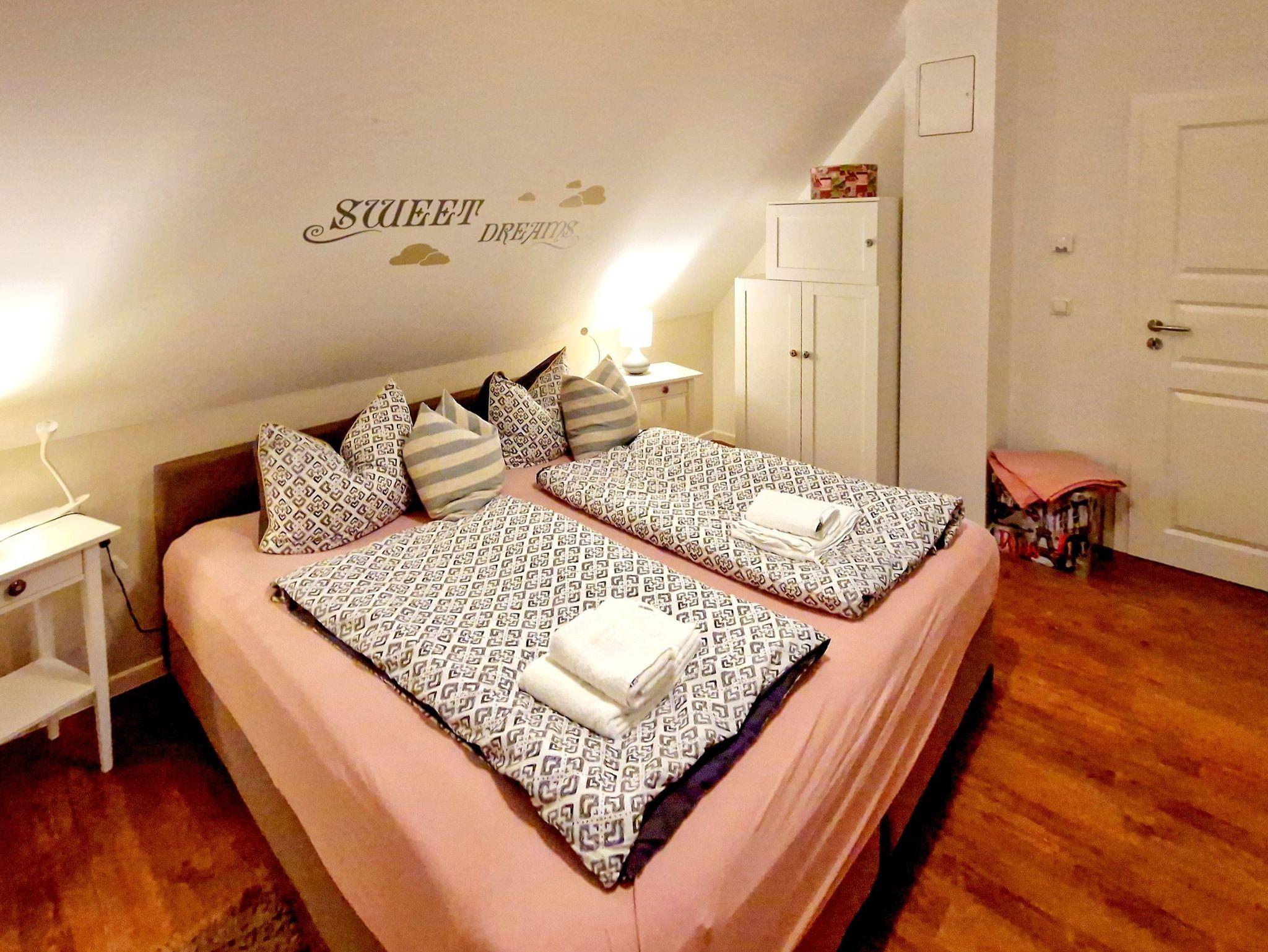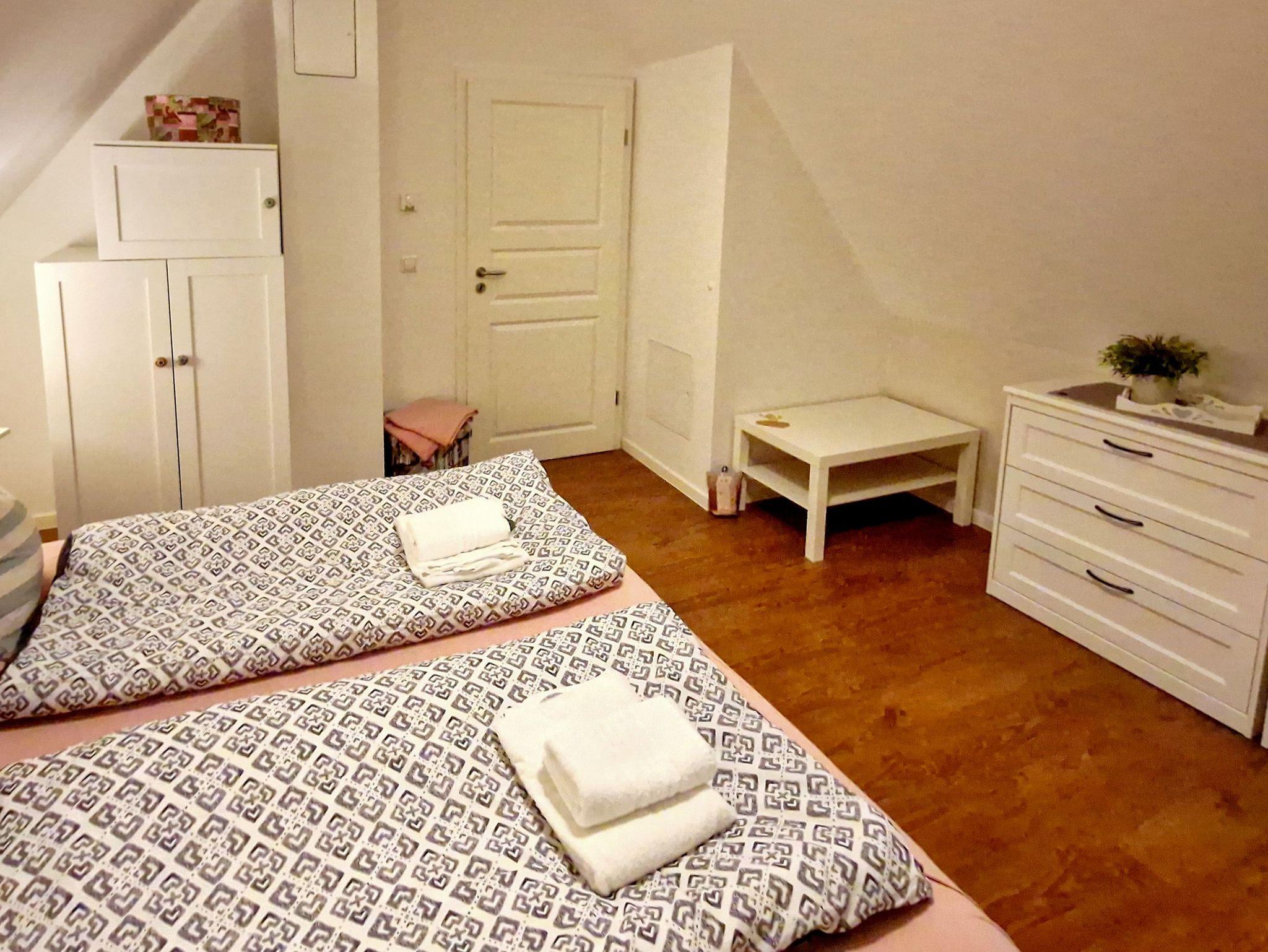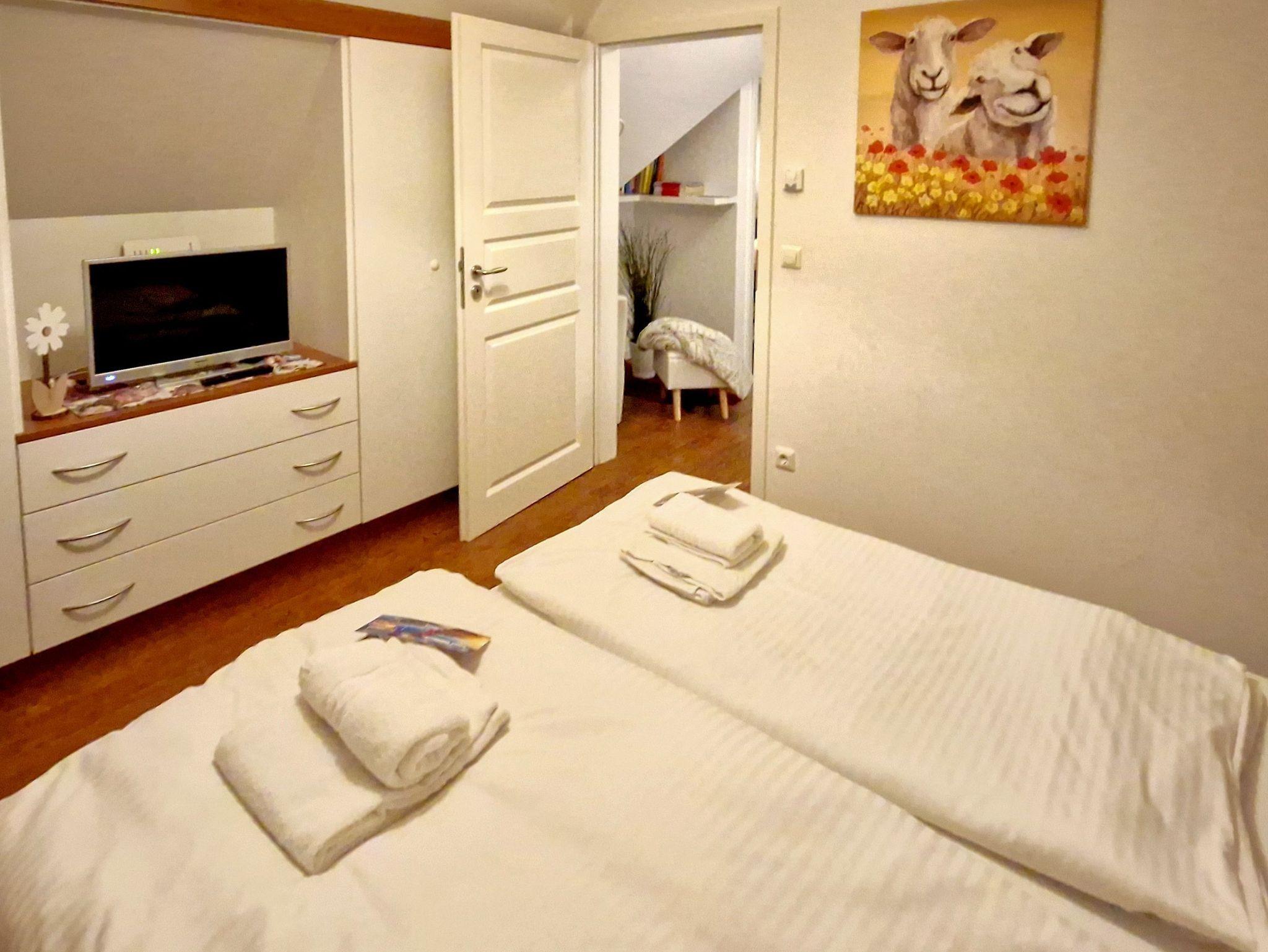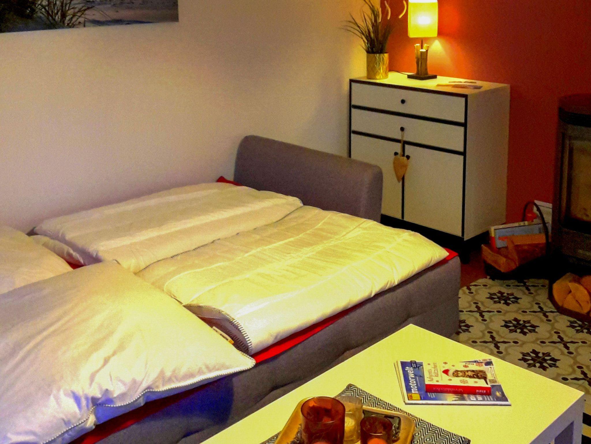 Zwei gemütliche Schlafzimmer mit Doppelbetten bieten erholsame Nächte. Das Bett im zweiten Schlafzimmer lässt sich bei Bedarf in zwei Einzelbetten umwandeln. Zusätzlich bietet das Schlafsofa im Wohnzimmer Platz für zwei weitere Gäste.