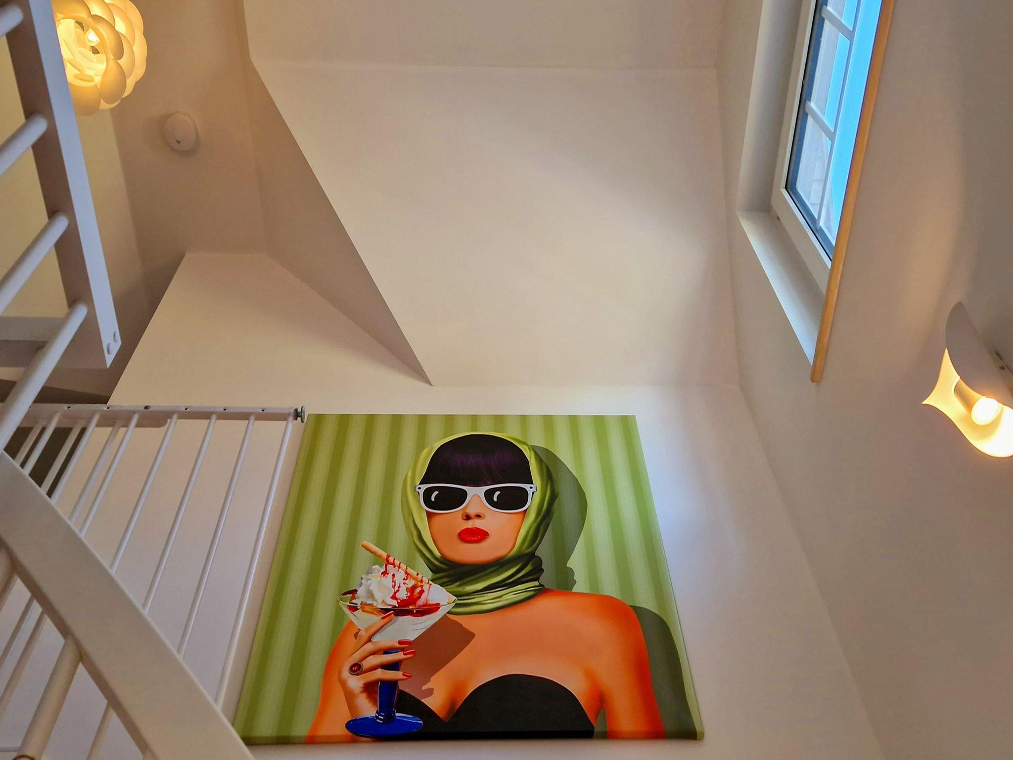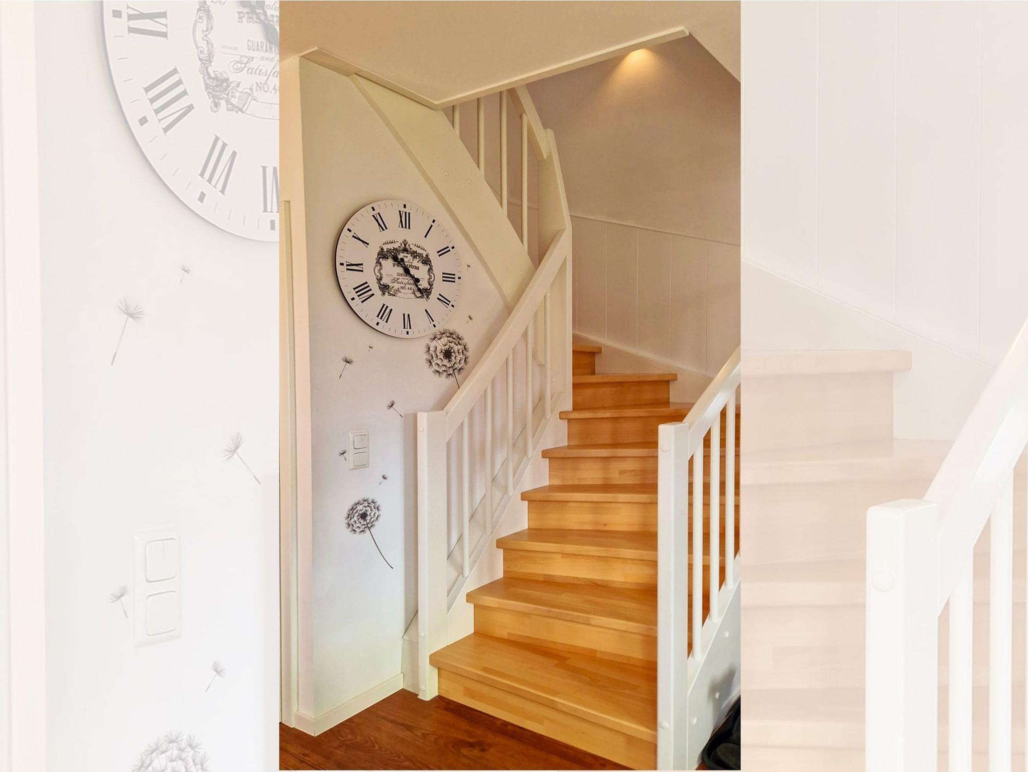 Über eine Treppe erreichen Sie das Obergeschoss, wo sich ein weiteres Badezimmer mit einer großen Eck-Badewanne und einem Waschtrockner befindet.