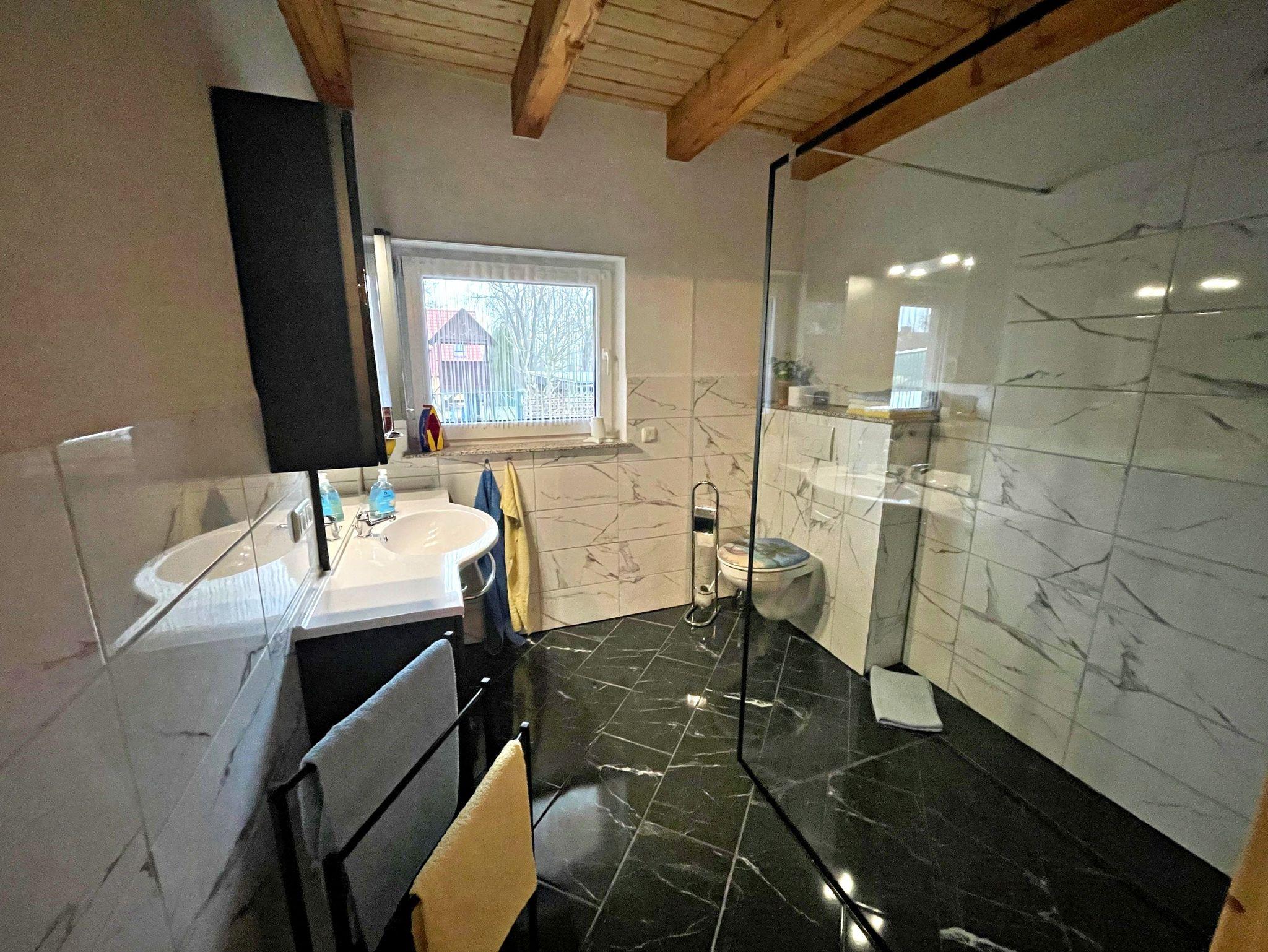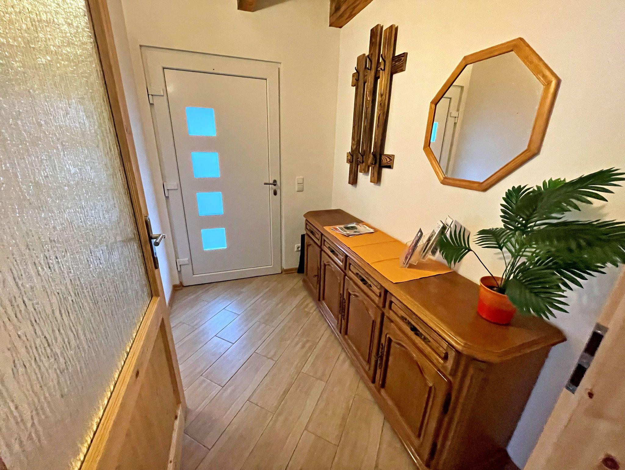 Die im Erdgeschoss gelegene 2 Raum Ferienwohnung ist ca. 56 m² groß. Durch den stufenlosen Eingang und der ebenerdigen Dusche ist die Ferienwohnung für behinderte Personen sehr gut geeignet. Die Ferienwohnung verfügt über ein separates Schlafzimmer mit Doppelbett. Selbstversorger finden eine rundum gut ausgestattete separate Küche vor, die alle Wünsche erfüllt. Eine Spülmaschine ist leider nicht vorhanden. Einen separaten Essplatz gibt es im Wohnbereich. Der Wohnbereich ist weiterhin mit einer großen bequemen Sitzgarnitur und Flach Bild Fernseher eingerichtet. Eine Terrasse mit Sitzmöbeln und Blick ins Grüne ist vorhanden. Hier können Sie morgens Ihren Kaffee genießen oder den Abend bei einem Glas Wein ausklingen lassen. Der Pkw-Stellplatz befindet sich auf dem Grundstück. Die Erstausstattung Bettwäsche und Handtücher sind im Preis enthalten.