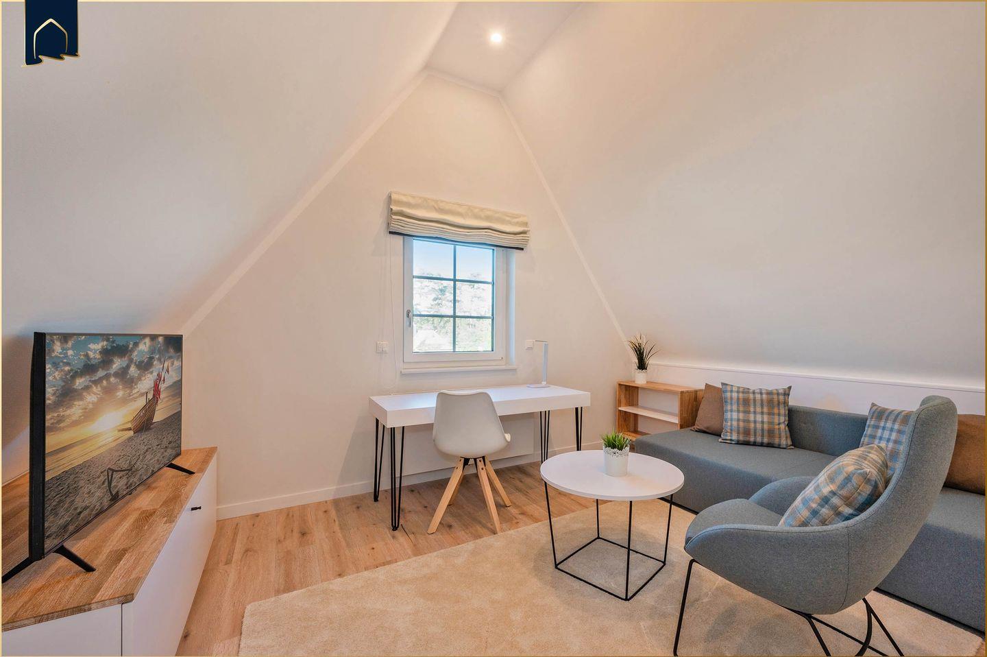 Die lichtdurchflutete Sofaecke mit Kaminofen lädt zu gemütlichen Abenden ein, während auf dem Balkon oder der möblierten Terrasse entspannte Stunden im Freien warten. Für einen aktiven Start in den Tag steht Ihnen eine Espressomaschine zur Verfügung – ideal für Workation oder Home-Office, denn schnelles WLAN und ein Schreibtisch sind ebenfalls vorhanden. Zwei moderne TVs sorgen für Unterhaltung, während Sonnenliegen und Gartenhaus zum Verweilen im Grünen einladen. Ob beim Grillen im eigenen Garten oder beim Lesen eines Buches in der Liegewiese – hier steht Ihr Wohlbefinden im Mittelpunkt.