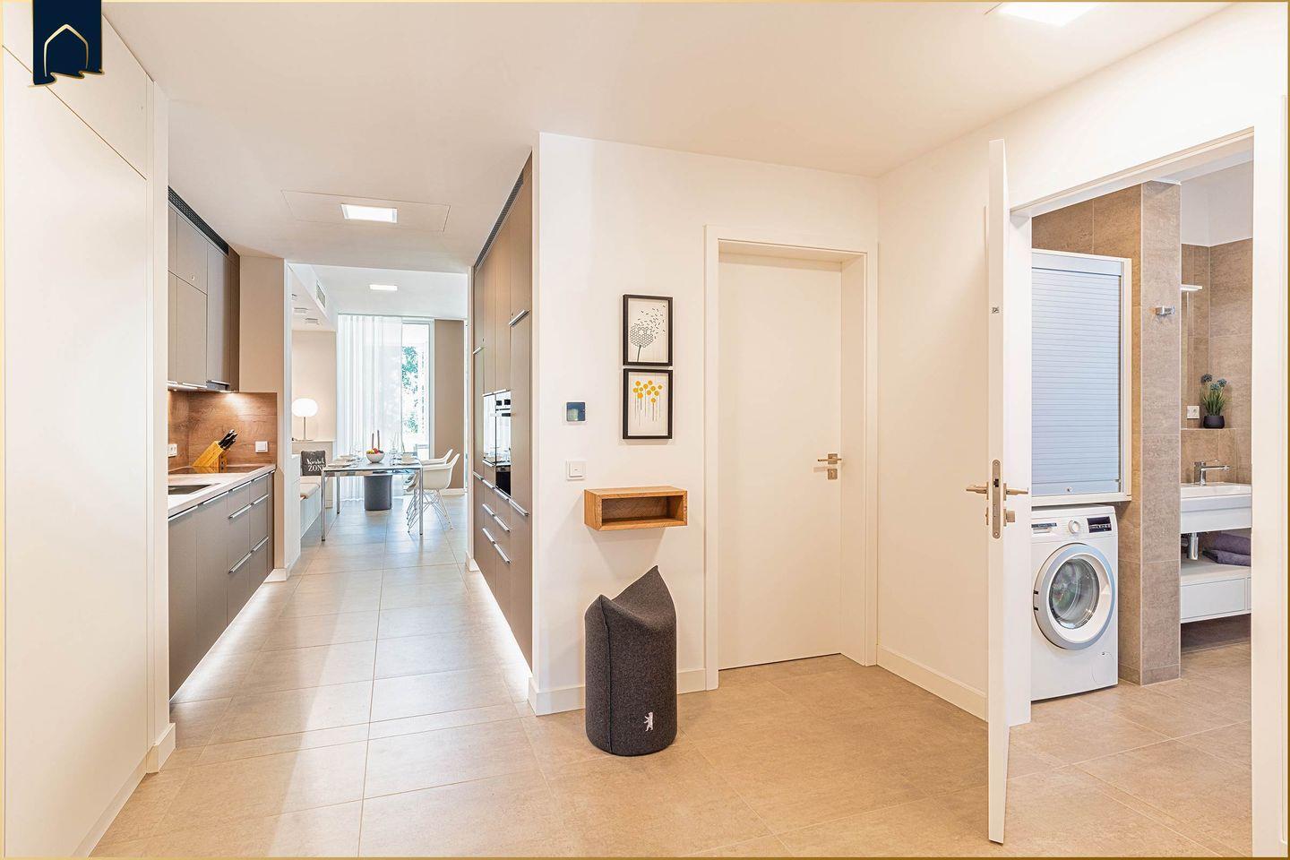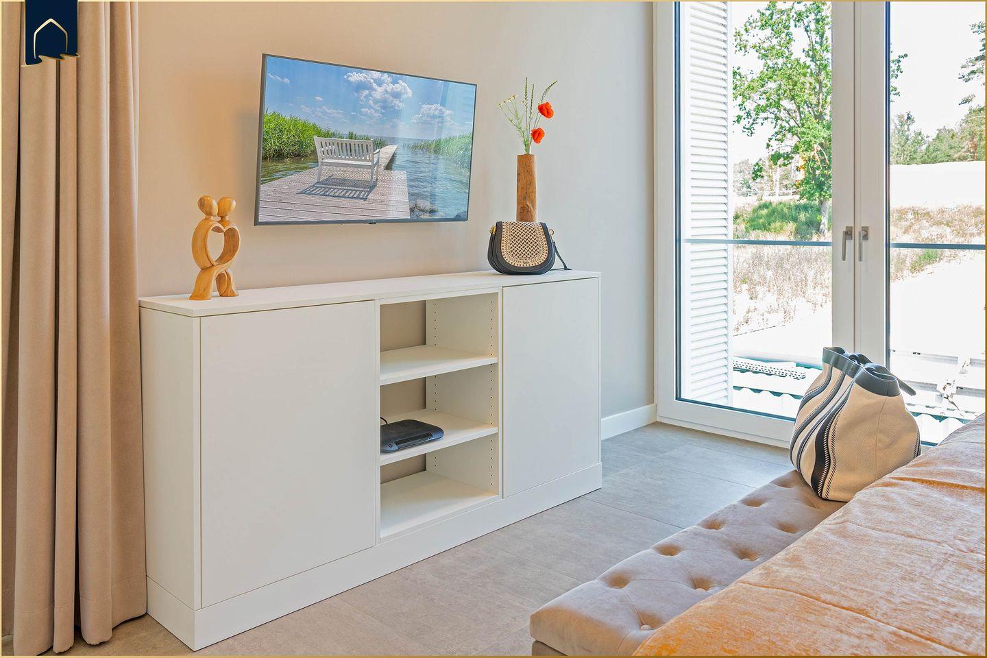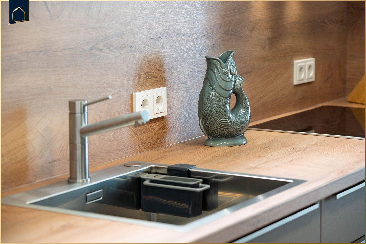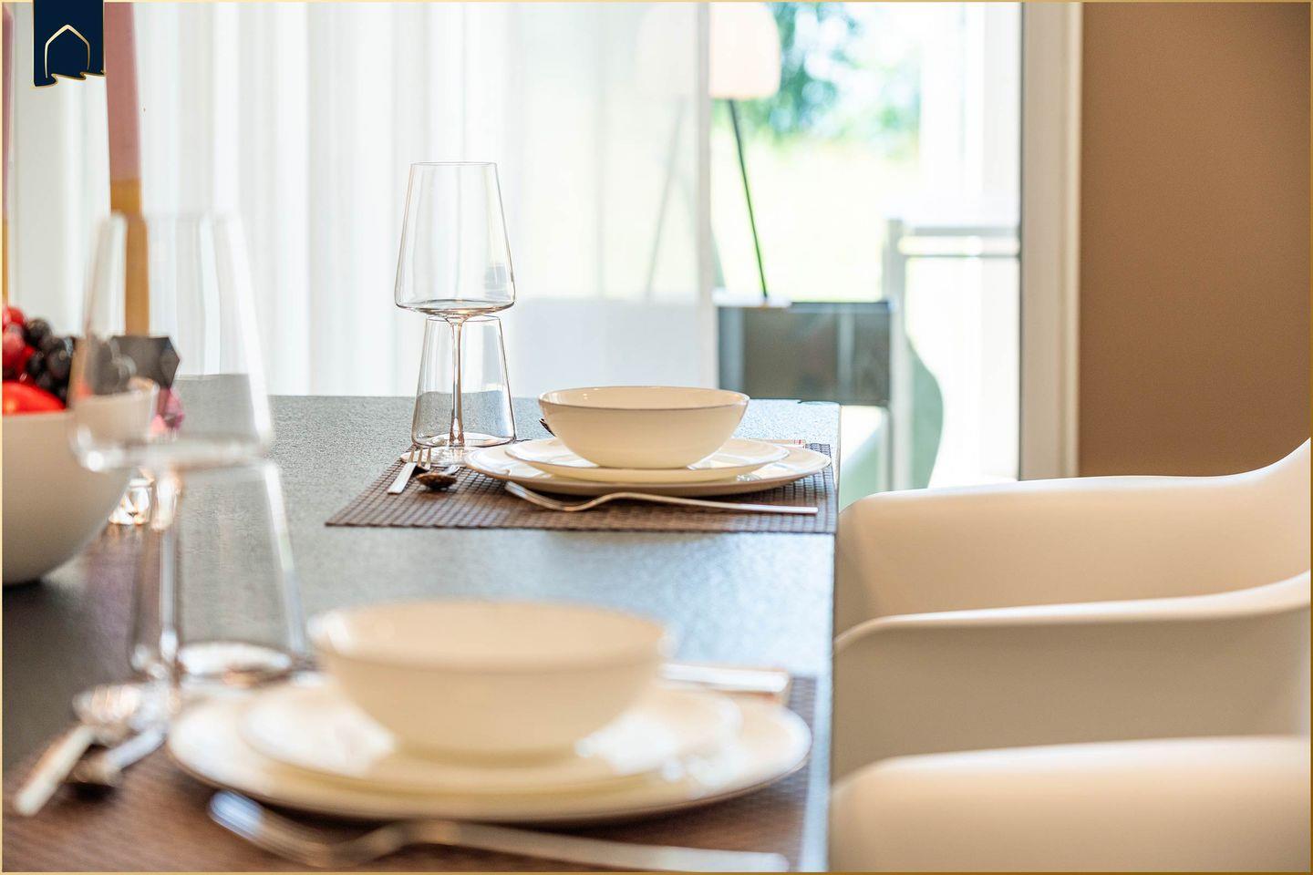 Die moderne Küche ist mit allen Geräten und Utensilien ausgestattet, die Sie für Ihre Selbstverpflegung benötigen – inklusive Backofen, Geschirrspüler, Kaffeemaschine, Espressomaschine und Gefrierfach. Im großzügigen Essbereich genießen Sie gemeinsame Mahlzeiten, während das Wohnzimmer mit Sofa, TV und Gesellschaftsspielen zu gemütlichen Abenden einlädt. Für Workation-Gäste steht ein eigener Schreibtisch zur Verfügung. Die Ferienwohnung ist vollständig klimatisiert und mit Fußbodenheizung ausgestattet, was auch in der kühleren Jahreszeit für ein angenehmes Raumklima sorgt.