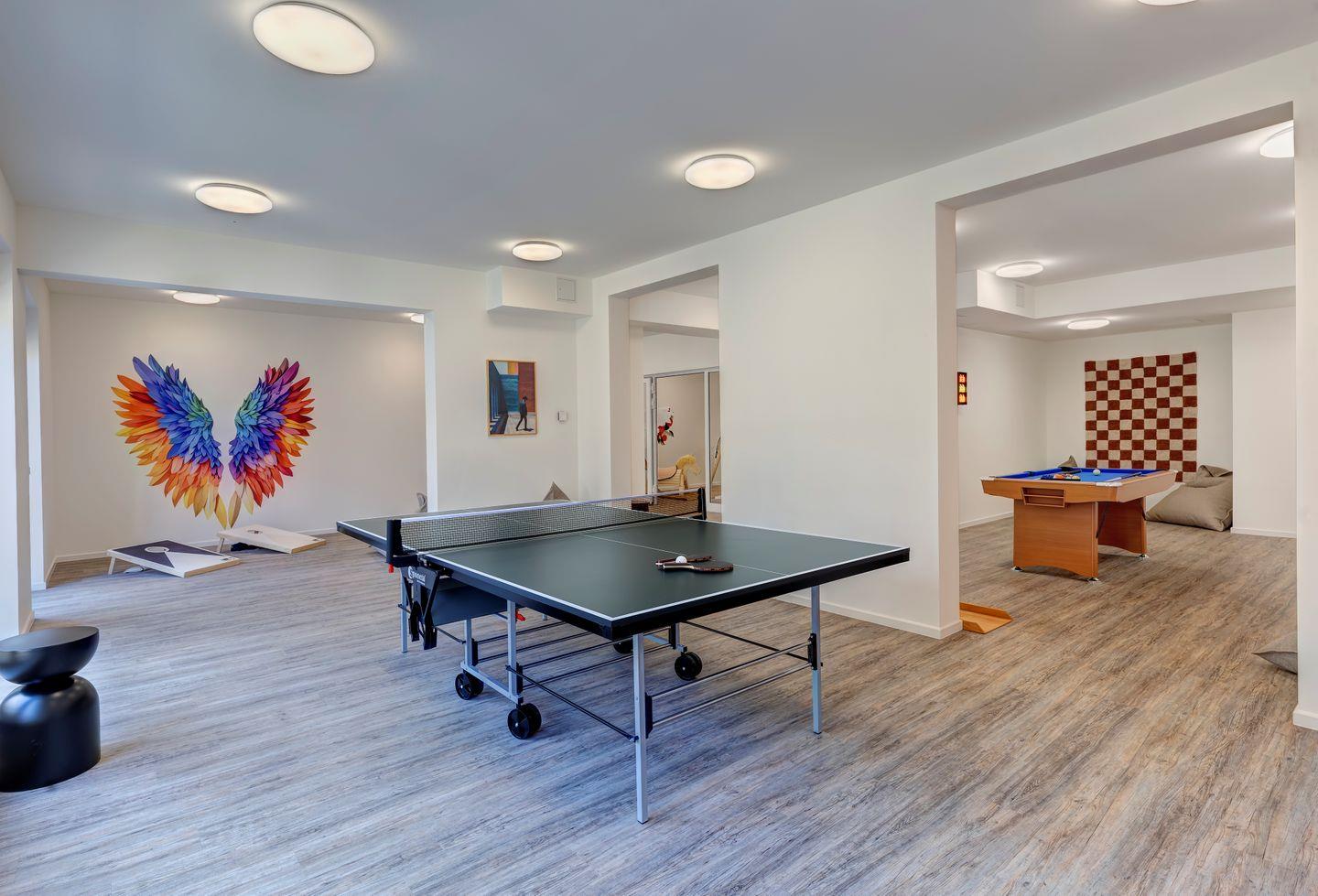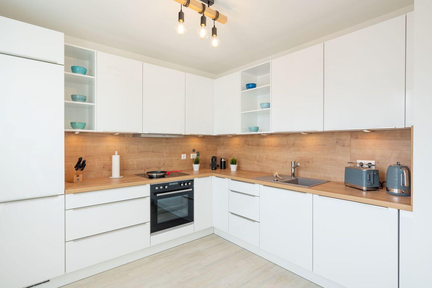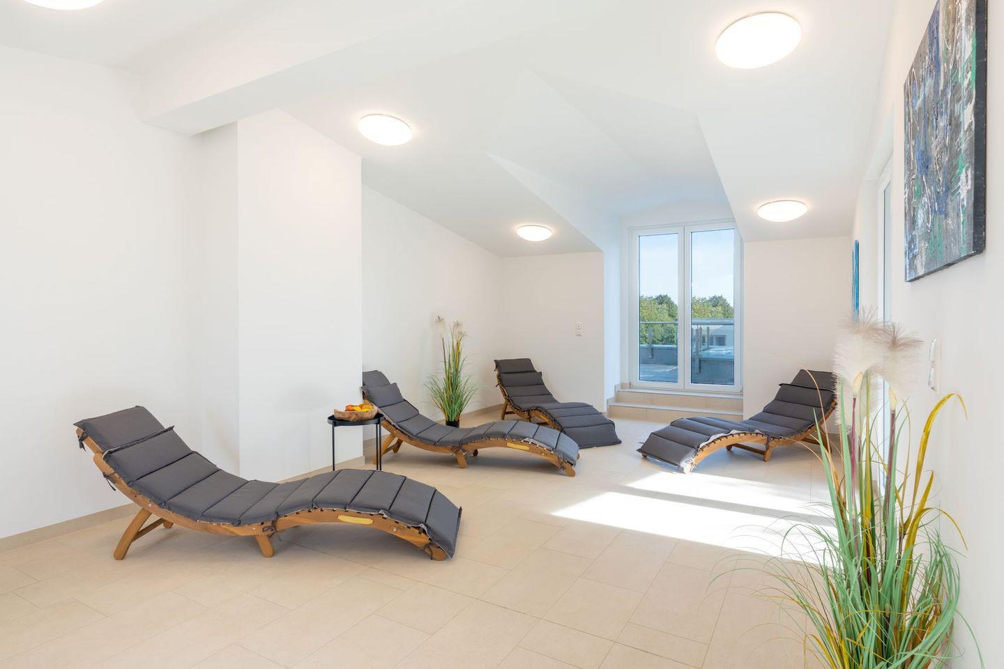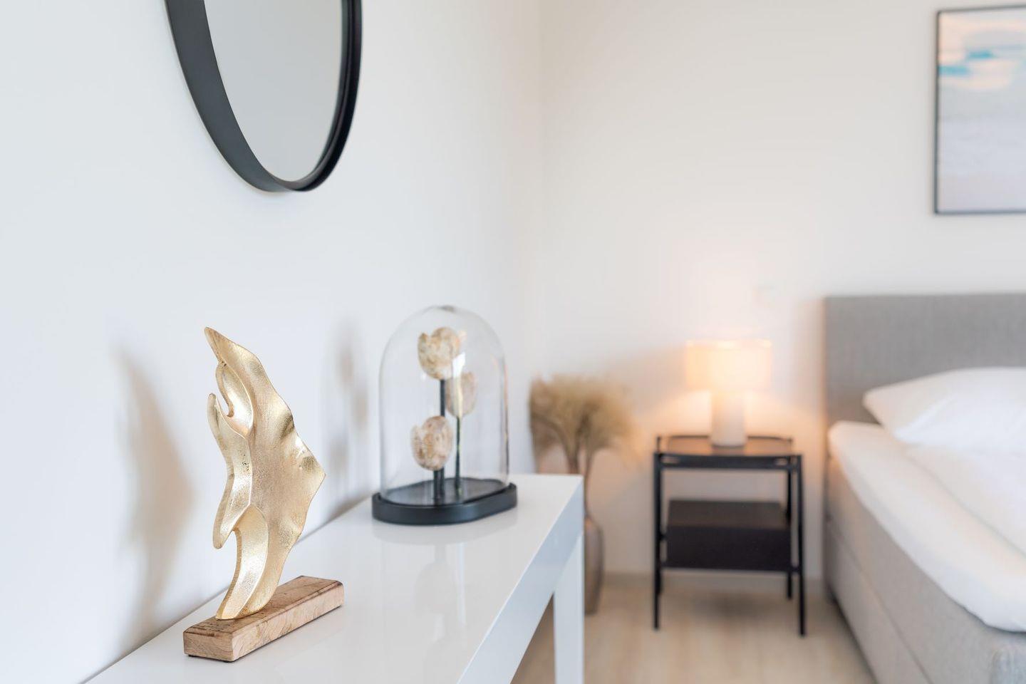 Die helle, modern gestaltete Wohnung verfügt über alle Vorteile des modernen Bauwesens: Fußbodenheizung und bodengleiche Duschen, bodentiefe Fenster und einen weitläufigen Balkon. Saunen und Fitnessräume stehen zur Verfügung. Die voll ausgestattete Küche mit Herd und Spülmaschine, ermöglicht einen gemütlichen Abend mit Familie oder Freunden. Der großzügige Balkon lädt zum Sternegucken unter freiem Himmel ein.