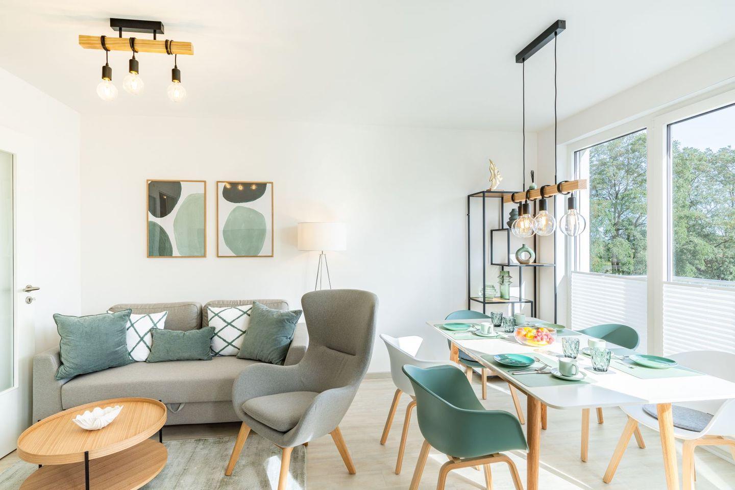 Die Ferienwohnung erstreckt sich über 84 Quadratmeter und bietet Platz für bis zu sechs Gäste. Beim Betreten der Wohnung werden Sie von einer behaglichen Atmosphäre begrüßt, die von natürlichen Holzelementen und warmen Farbtönen geprägt ist. Das Wohnzimmer ist ein einladender Rückzugsort mit bequemen Sitzgelegenheiten und großen Fenstern, die den Wald- und Haffblick in den Raum holen.
