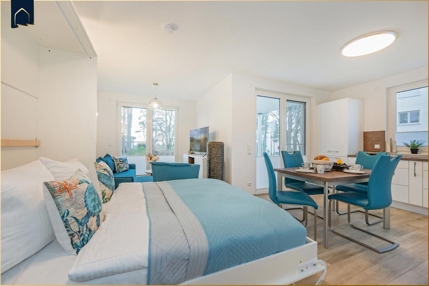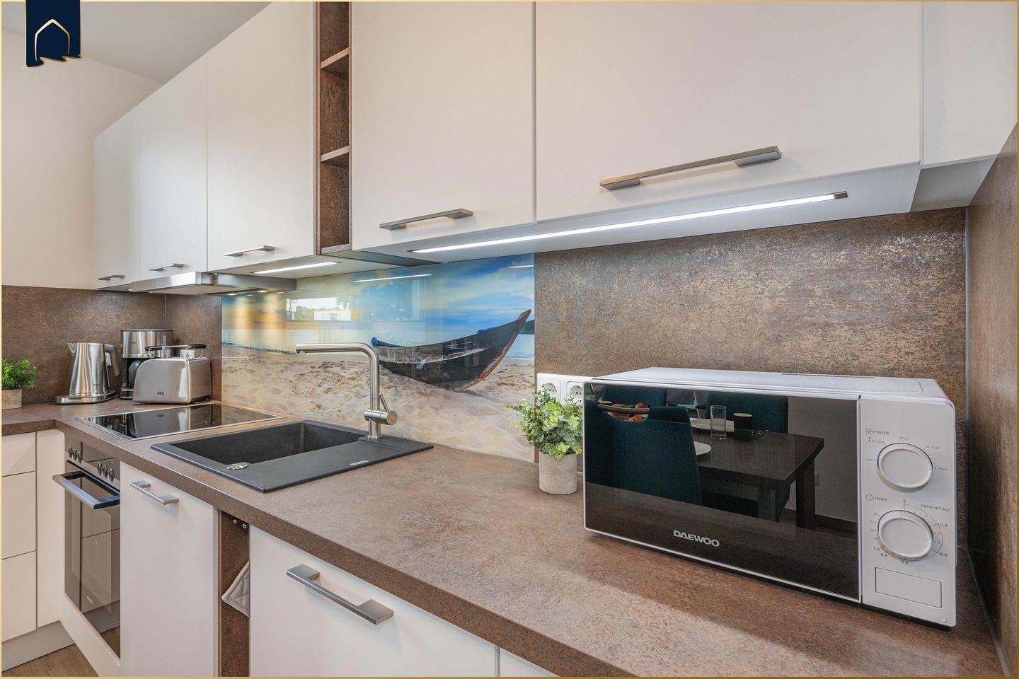 Dieses hochwertig ausgestattete Ferienappartement auf Usedom bietet alles, was das Urlaubsherz begehrt. Gelegen in ländlicher Umgebung, inmitten grüner Natur und nur etwa 10 km vom Ostseestrand entfernt, erleben Sie hier Erholung pur. Auf 61 m² Wohnfläche erwarten Sie ein stilvoll eingerichtetes Wohnzimmer mit bequemer Sofaecke, ein separates Schlafzimmer mit komfortablem Doppelbett sowie eine voll ausgestattete Küche inklusive Backofen, Mikrowelle, Kühlschrank, Gefrierfach, Spülmaschine und vielem mehr. Die Fußbodenheizung sorgt ganzjährig für angenehme Temperaturen, während WLAN und zwei moderne TVs mit internationalen Kanälen für Unterhaltung sorgen.