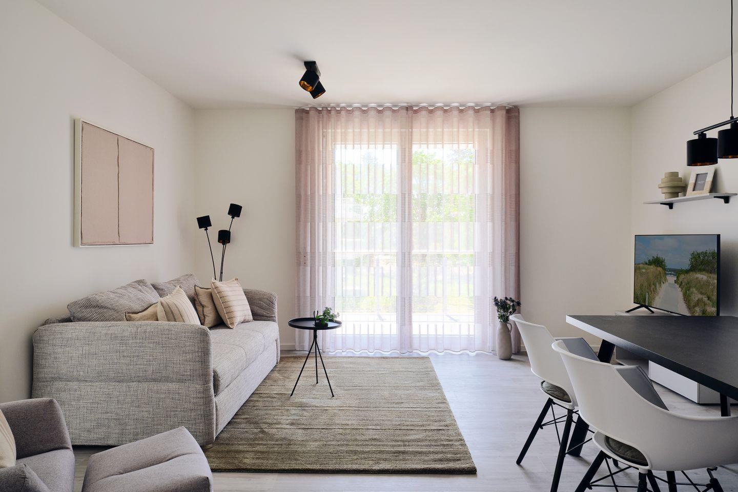 - Einladendes Wohnzimmer mit Schlafsofa, Smart TV und bodentiefen Fenstern für viel Tageslicht