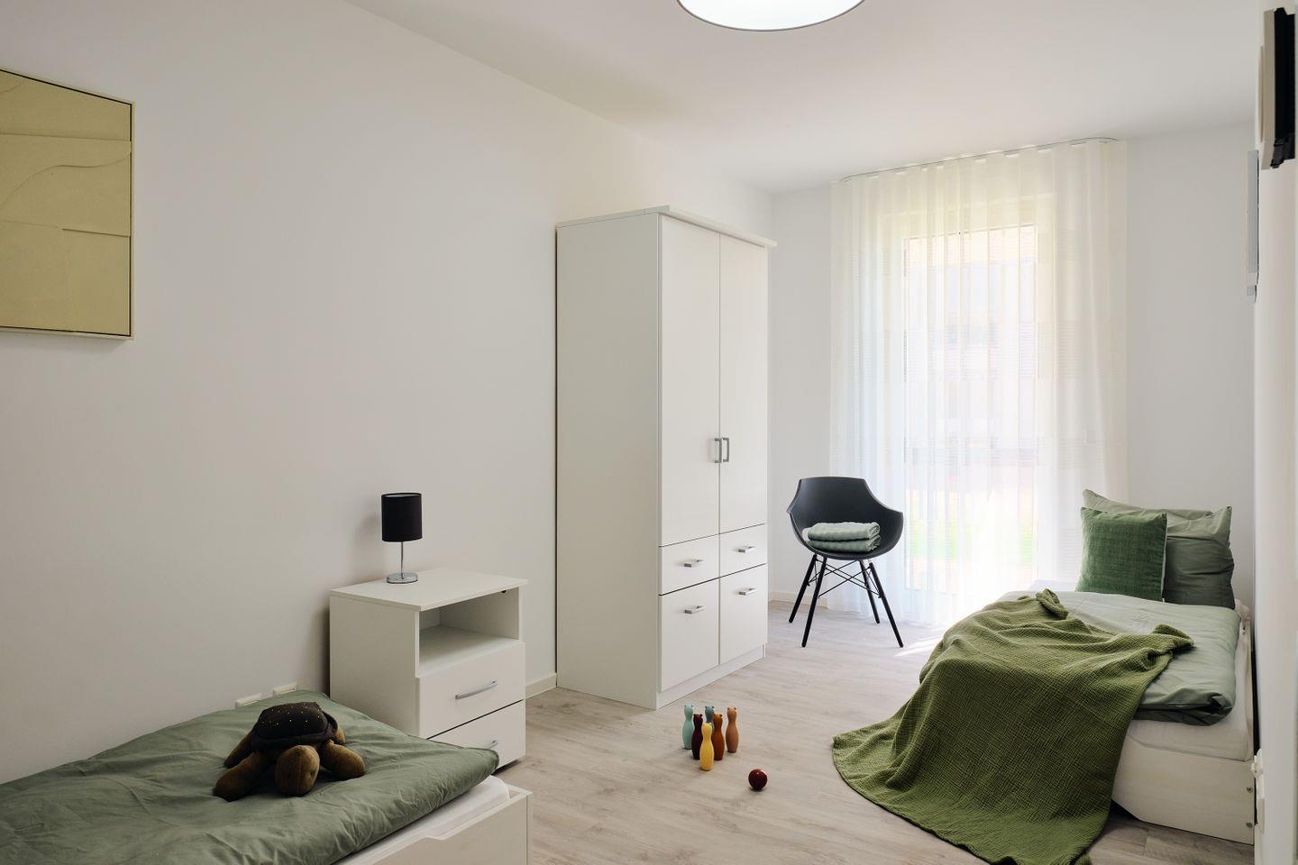 Unser **kinder- und fahrradfreundliches Apartment B1** mit 74 m² ist der perfekte Ort für Familien. Es bietet Platz für bis zu sechs Personen und wurde speziell für einen entspannten Aufenthalt mit Kindern gestaltet. Das separate Kinderzimmer verfügt über bodentiefe Einzelbetten, die den Kleinen einen sicheren Schlafplatz bieten. Im Elternschlafzimmer können Sie sich nach einem aktiven Tag entspannen, während der Wohnbereich mit Schlafsofa und direktem Zugang zur Terrasse auch für gemeinsames Zusammensitzen und Spielen geeignet ist.
