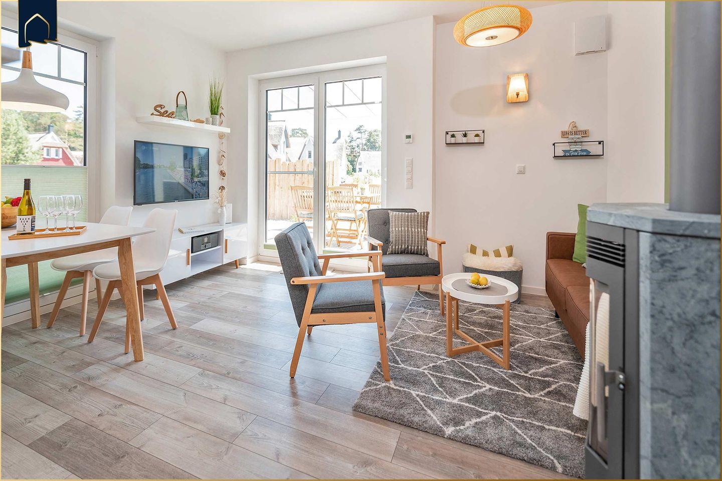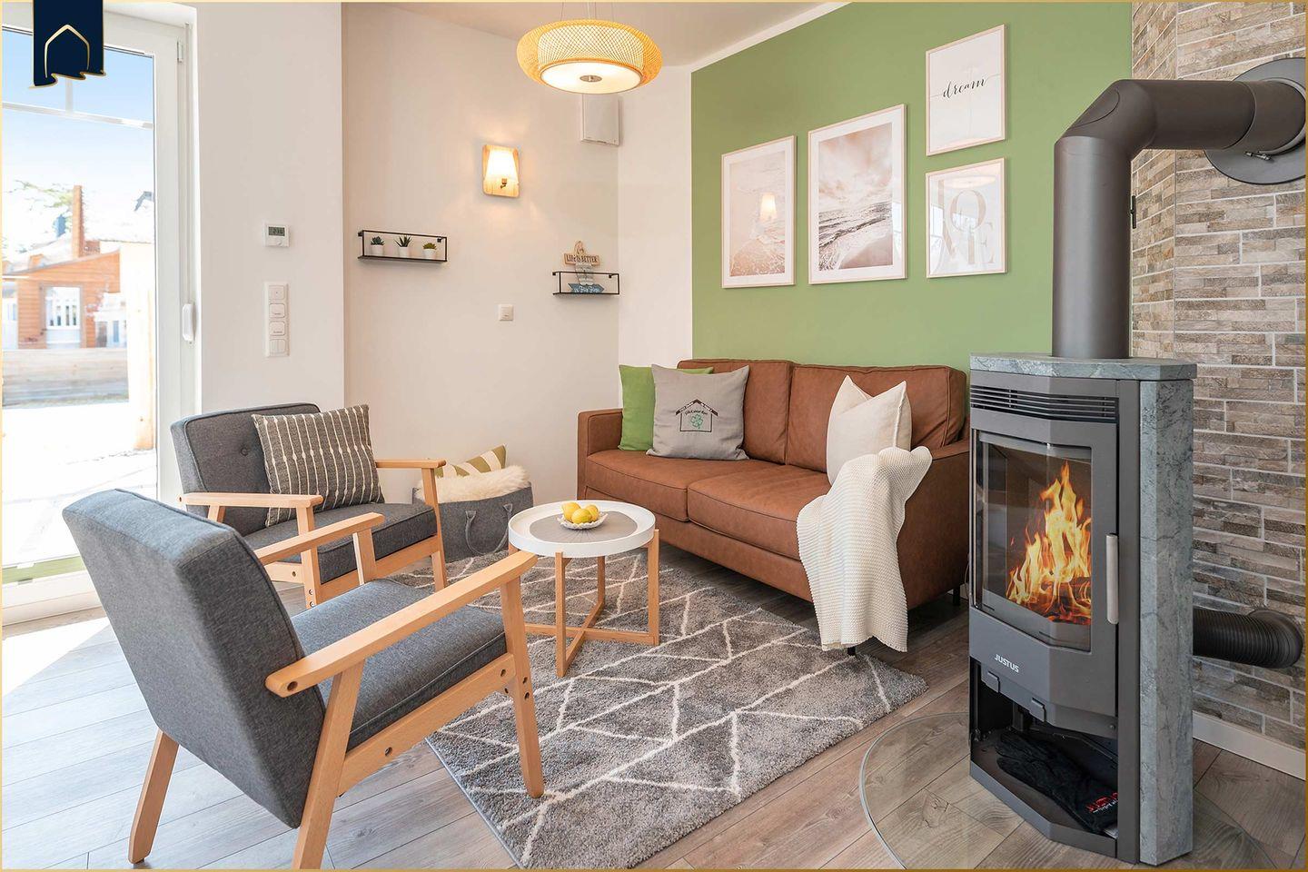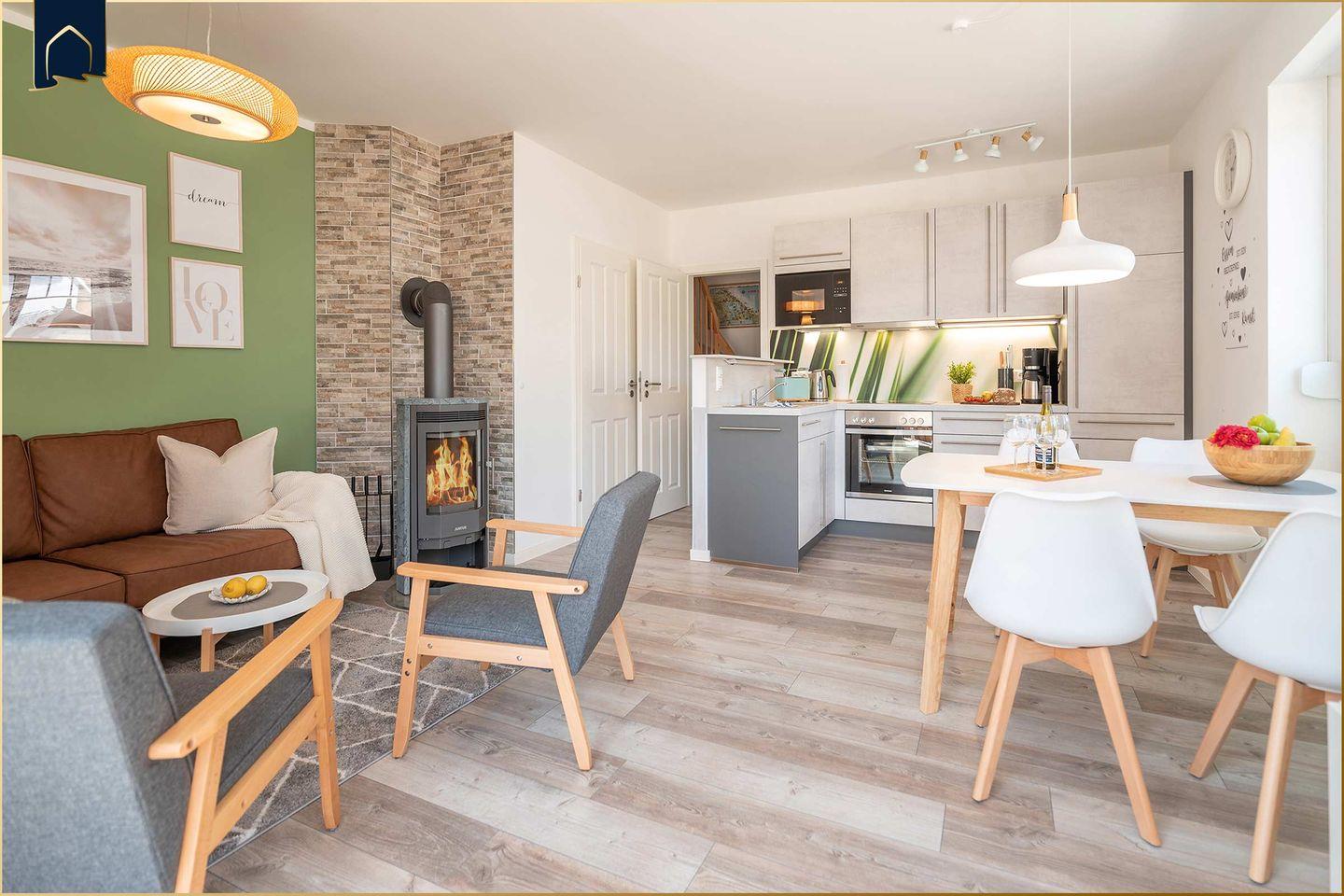 Im lichtdurchfluteten Wohnbereich lädt eine gemütliche Sofaecke mit TV zum Verweilen ein. Ein Kamin sorgt an kühleren Tagen für eine behagliche Atmosphäre. Für Wellness-Momente steht Ihnen eine private Infrarotkabine zur Verfügung – perfekt, um nach einem Ausflug zu entspannen. Die offene Küche ist komplett ausgestattet mit Backofen, Herd, Geschirrspüler, Kühlschrank, Gefrierfach, Mikrowelle, Kaffeemaschine und Toaster. Am großen Esstisch findet die ganze Familie Platz für gemeinsame Mahlzeiten.