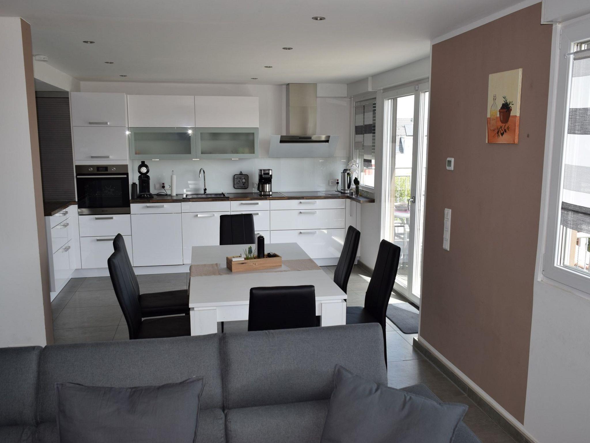 Sie ist komplett mit Spülmaschine, Backofen, Ceran-Kochfeld, Mikrowelle, Kühlschrank mit Gefrierteil