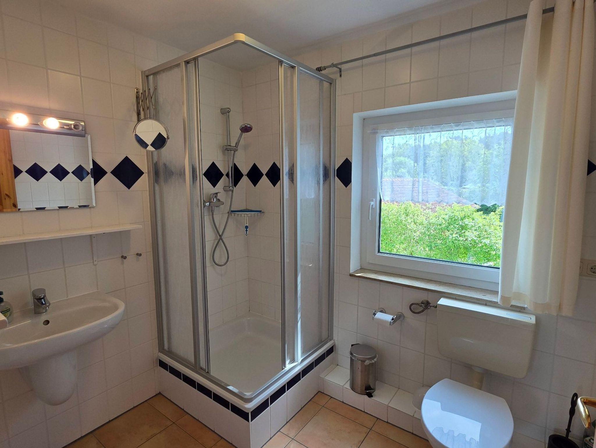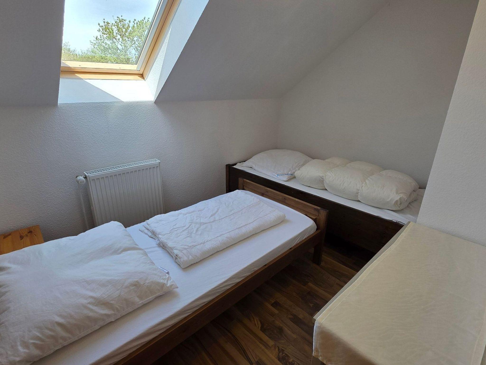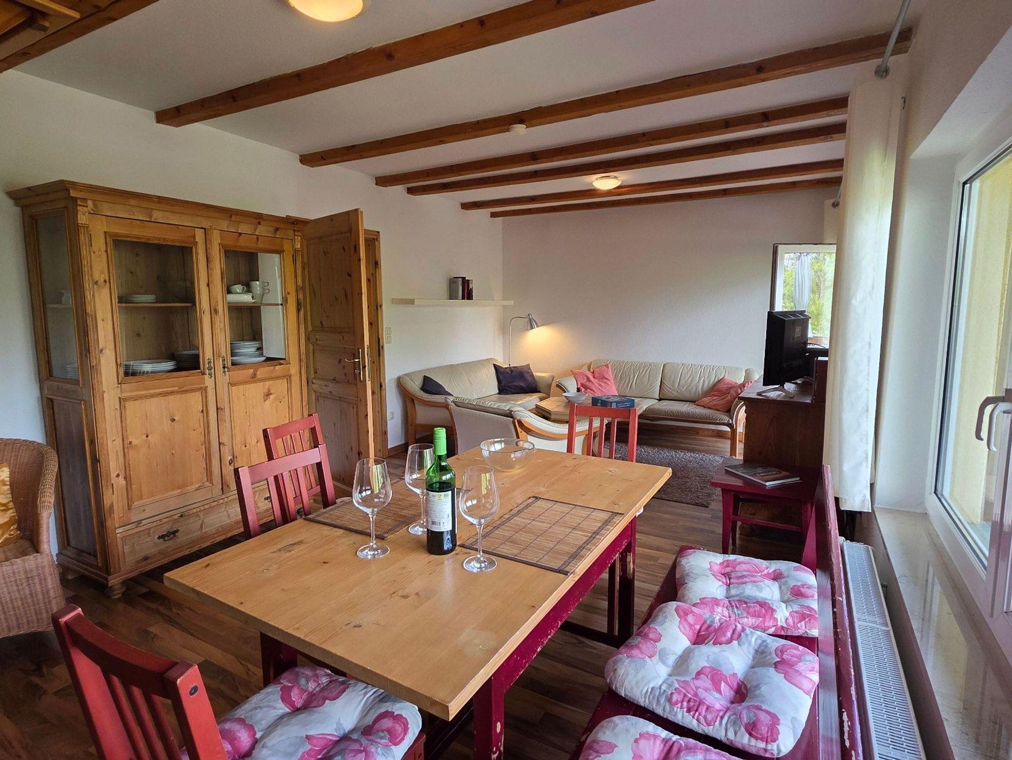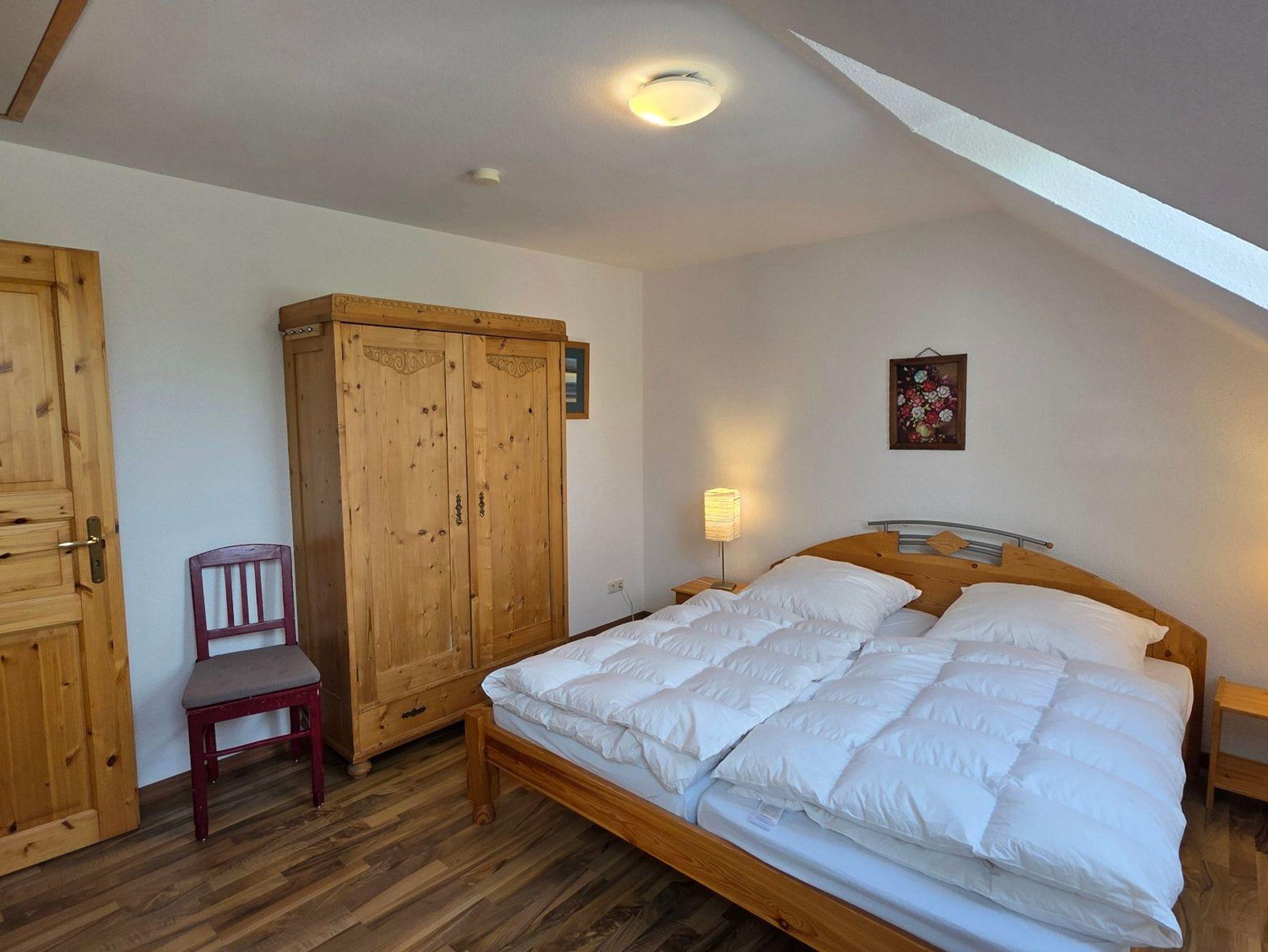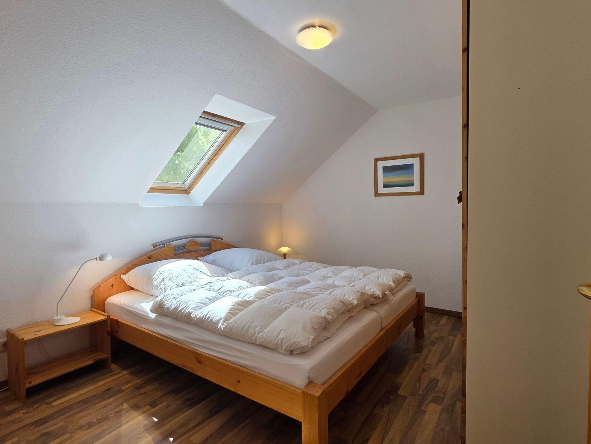 Die Ferienwohnung 4 mit befindet sich in der Ferienanlage Haus am See mit 100 qm auf 2 Etagen (Obergeschoss: Wohnzimmer mit Essplatz, große separate Küche, Gäste-WC mit Dusche, Dachgeschoss: 2 Schlafzimmer mit Doppelbett, 1 Schlafzimmer mit 2 Einzelbetten, Bad/Wanne/WC, ). Aus dem Wohnzimmer gelangt man direkt auf den großen Südwest-Balkon. Vom Balkon gelangt man über eine Spindeltreppe in den Garten.