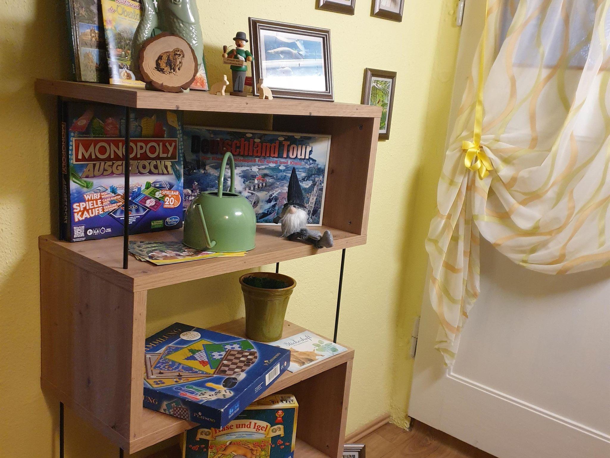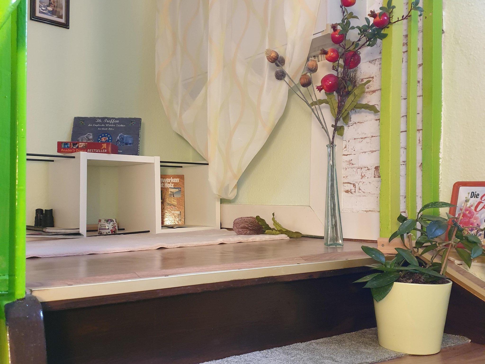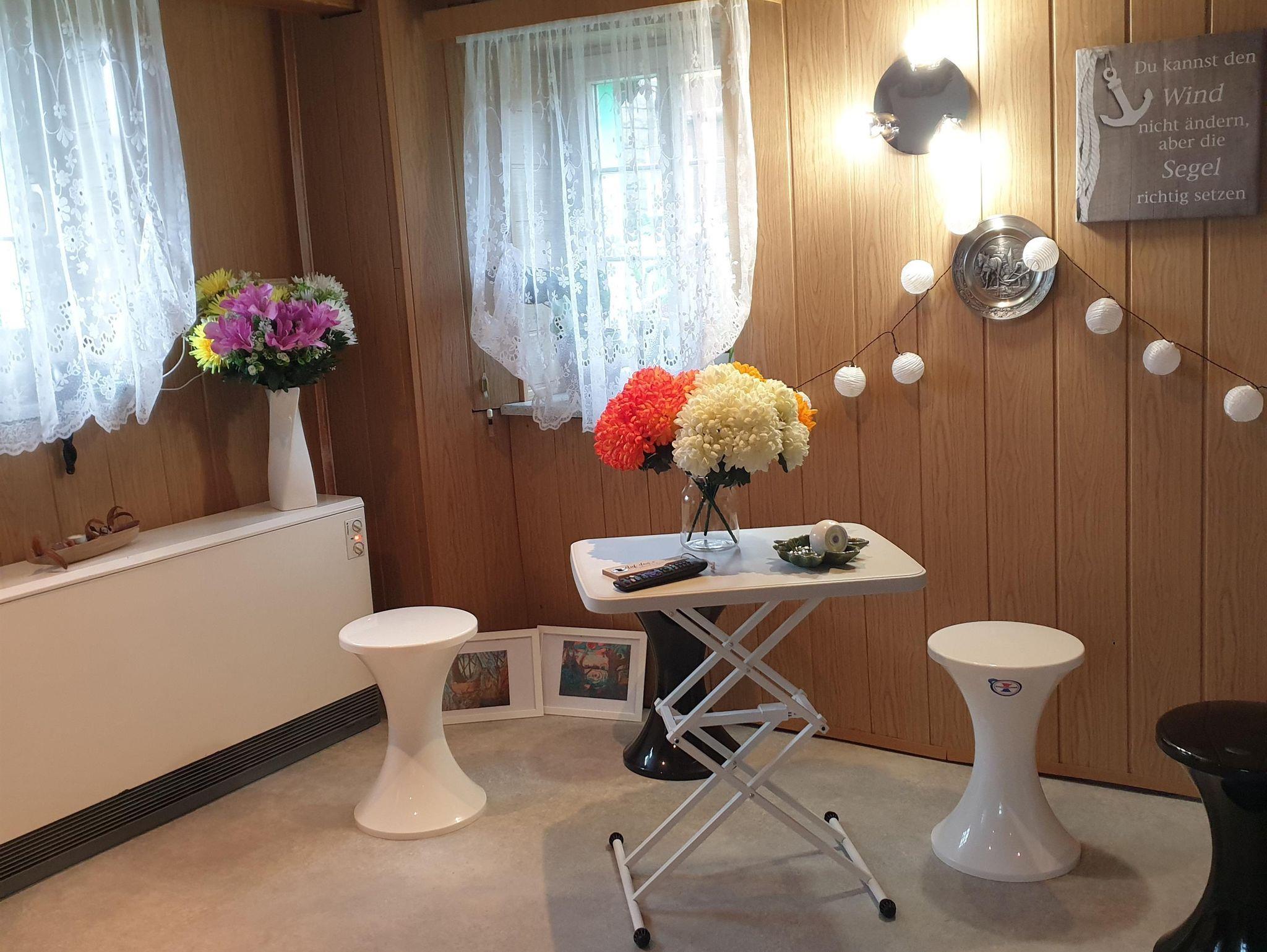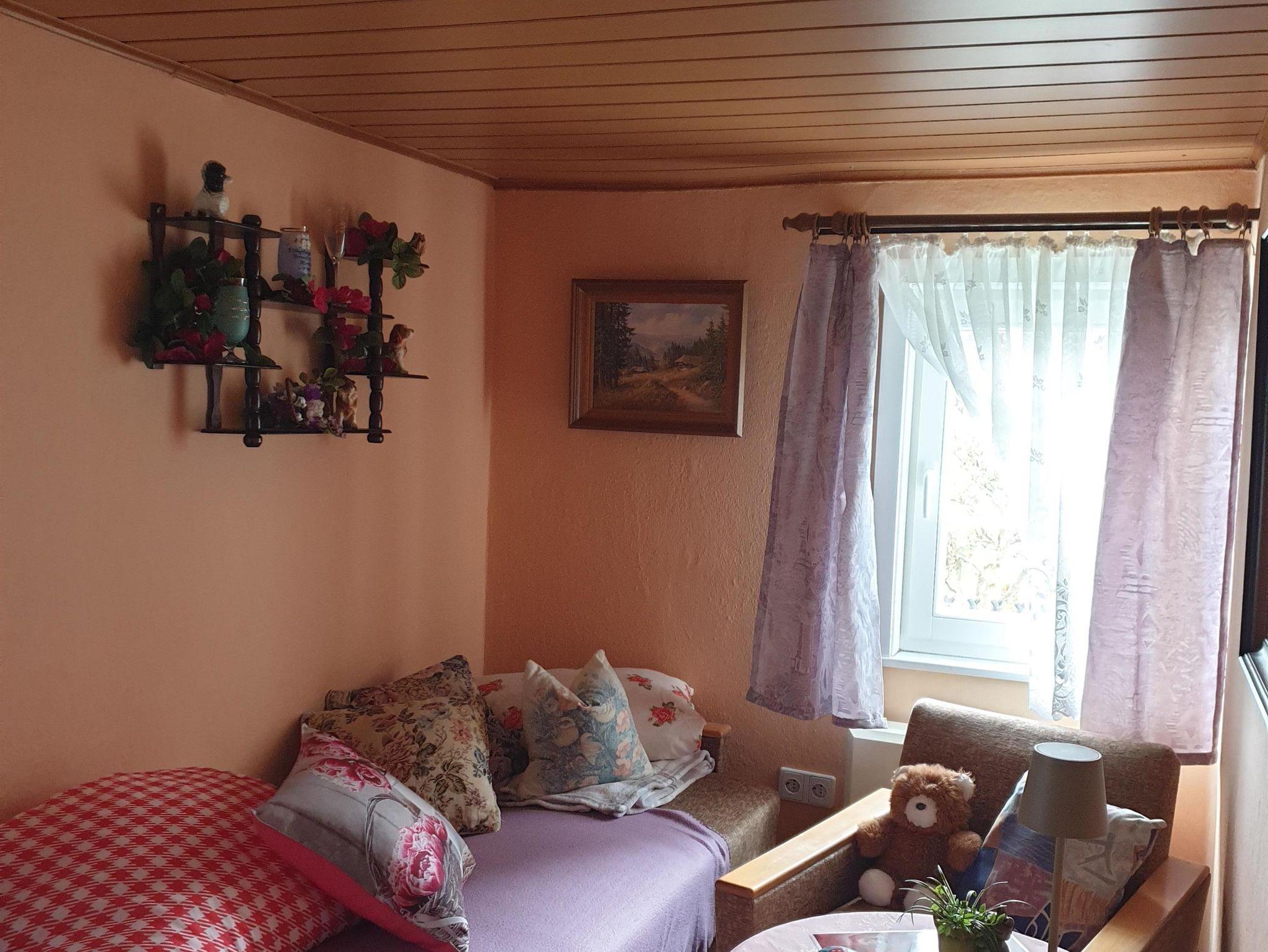 Im Obergeschoss befindet sich die Wohnstube (10 qm) mit TV, ein kleiner Schlafraum mit Schlafcouch (10 qm) und die Schlafstube (12 qm) mit Doppelbett.