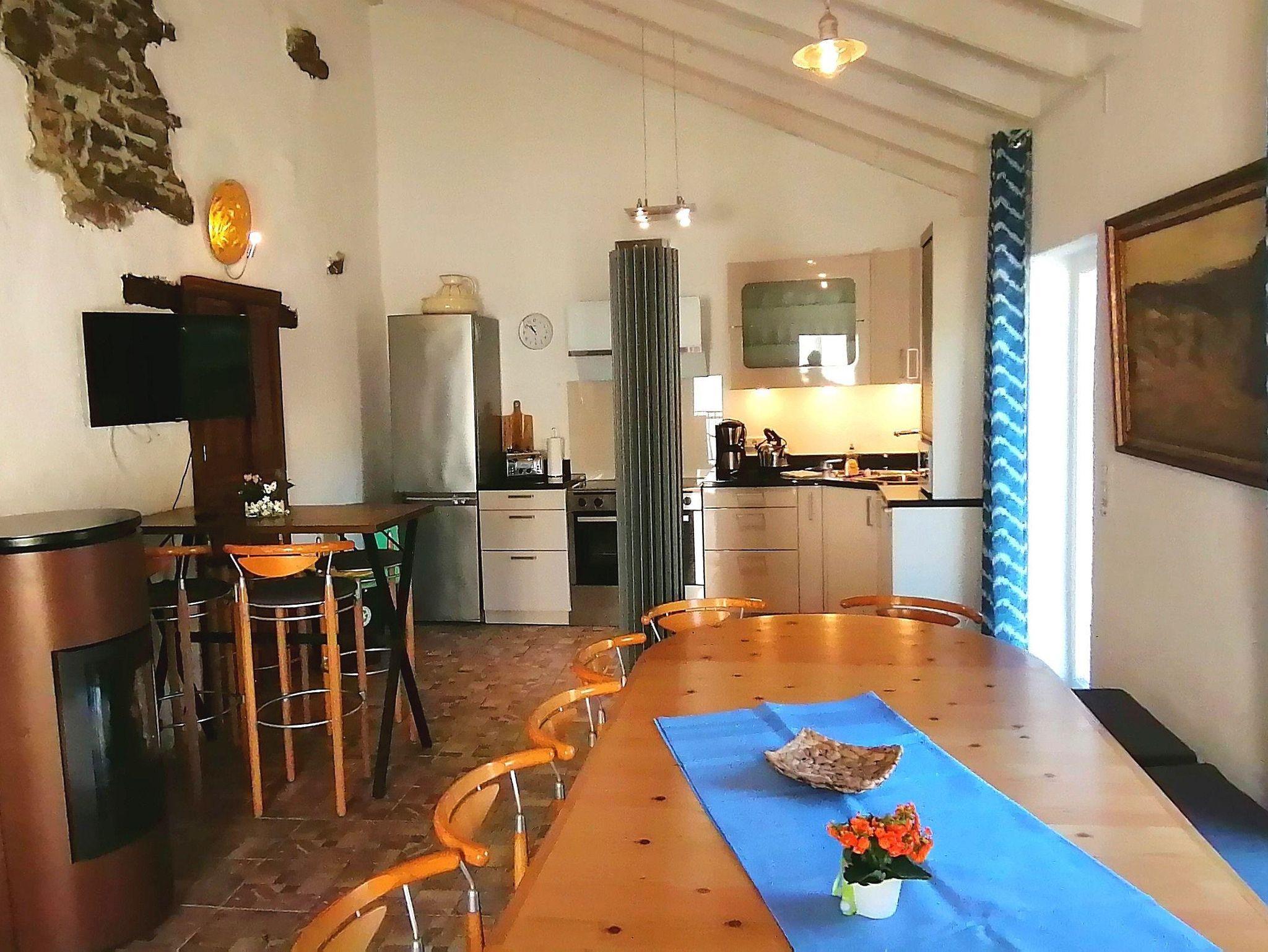 Bis zu 14 Personen finden an der großen Tischgruppe Platz. Der Pelletofen im Gemeinschaftsraum sorgt für angenehme Wärme – sowohl zeit- als auch temperaturgesteuert. Selbstverständlich stehen zusätzlich Heizkörper zur Verfügung.