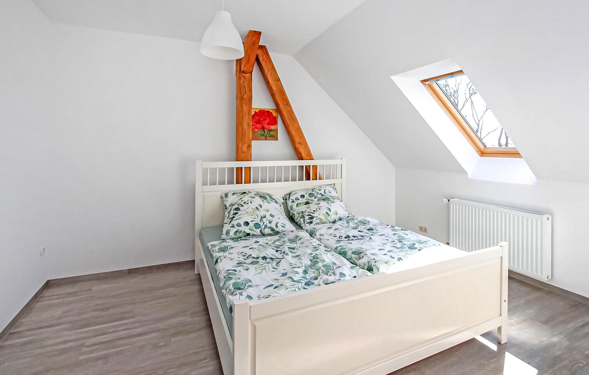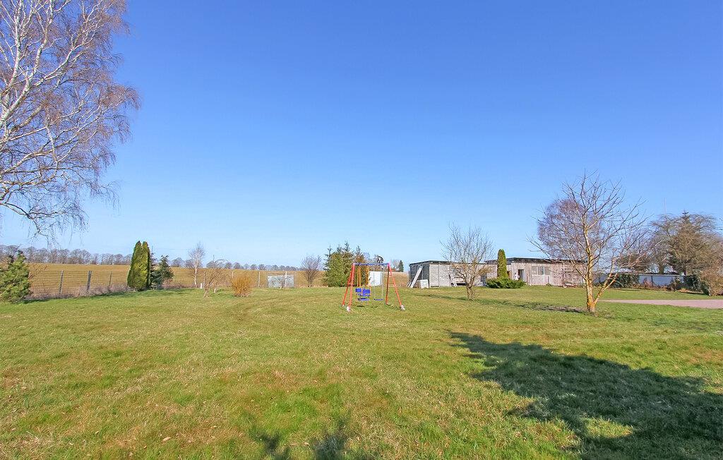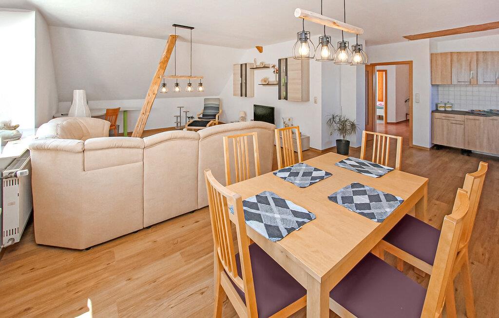 Omgivet af marker og enge ligger den 135 kvadratmeter store, rolige ferielejlighed til op til 8 personer på øverste etage i en beboelsesejendom på en helt indhegnet grund på cirka 3000 kvadratmeter med egen adgang. Ejeren, der bor. i stueetagen, er normalt kun i weekender på stedet. Den rummelige lejlighed blev totalrenoveret og nyindrettet i 2021. Første indflytning i foråret 2021. Der er et stort opholdsområde (sofasæt, lænestol, skrivebord, spisebord, flad-. skærm-tv, radio, cd-afspiller, dvd) med åbent køkken (elkomfur, ovn, opvaskemaskine, køleskab, mikroovn, diverse køkkenmaskiner), kombineret stue/soveværelse (dobbeltseng, fladskærms-tv, opholdsområde), 2 yderligere soveværelser (hver dobbeltseng) og et badeværelse (bruser, to håndvaske, Der er også et gæstetoilet i indgangspartiet. En barneseng og en høj stol er også tilgængelig. Der er også et overdækket udendørs opholdsområde med køleskab og grill samt parkeringsplads på ejendommen.