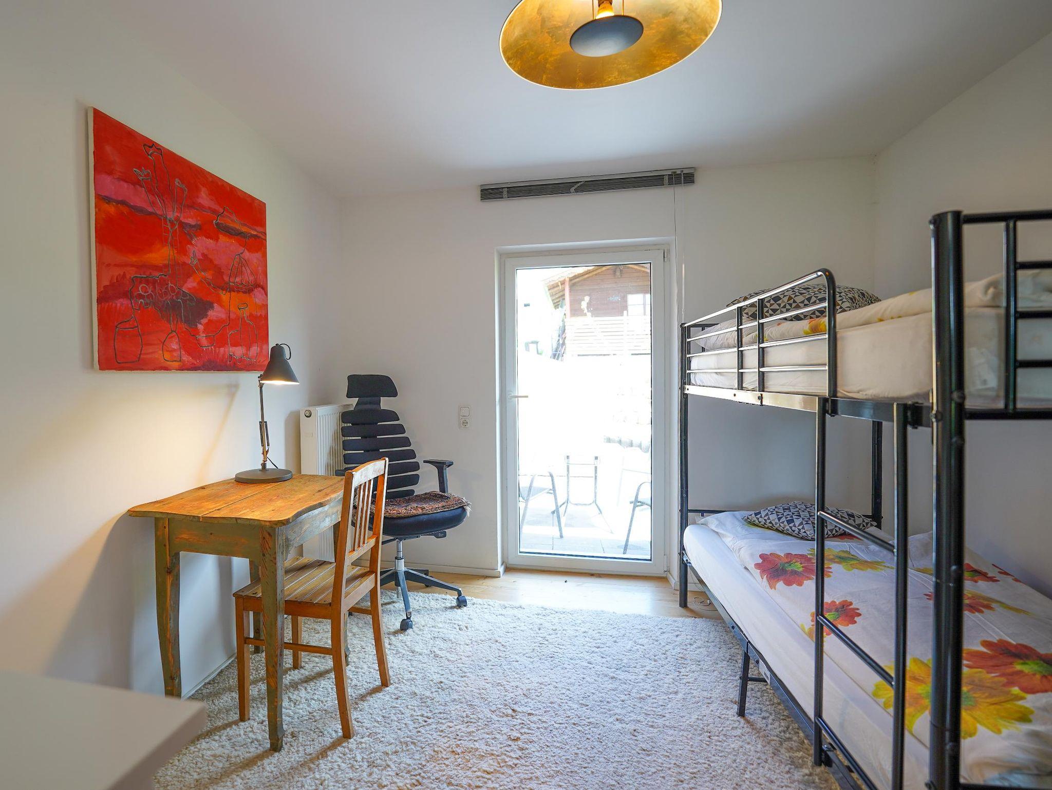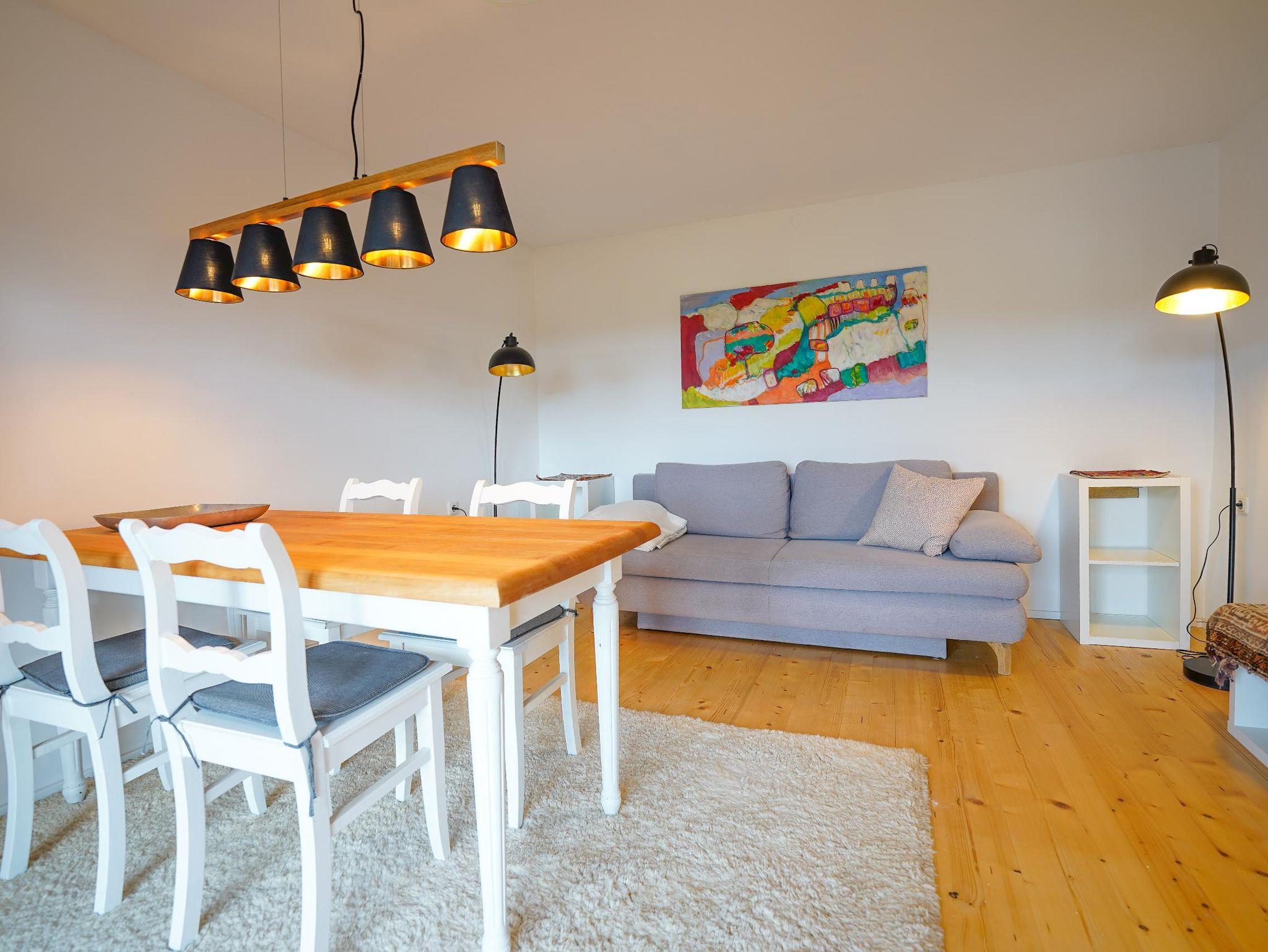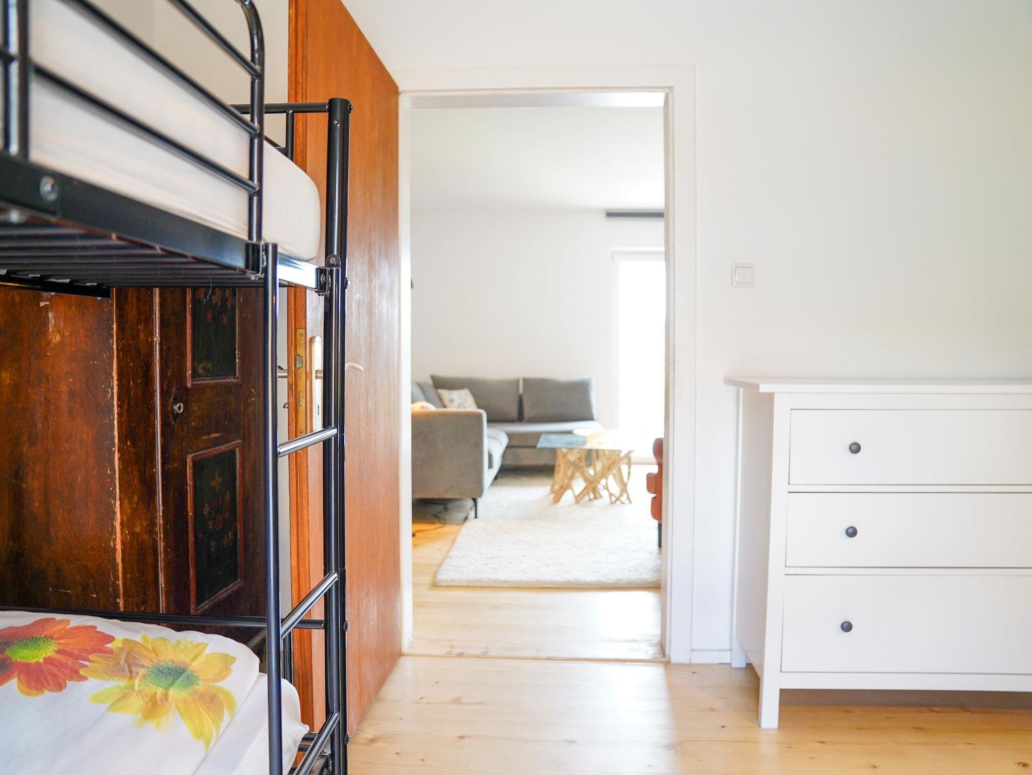 Von der Küche geht es ins Esszimmer. Am Tisch finden fünf Personen Platz, eine Ausziehcouch bietet eine zusätzliche Übernachtungsmöglichkeit. Auch von hier können Sie auf den Balkon treten, auf der anderen Seite der Küche liegt das Wohnzimmer mit gemütlicher Sitzecke, von der aus Sie den TV oder den Kaminofen im Blick haben. Im zweiten Schlafzimmer bietet ein Stockbett Platz für zwei weitere Gäste und ein kleiner Schreibtisch lässt sich z.B. für die Online-Arbeit nutzen. Ein Schrank bietet genügend Stauraum.
