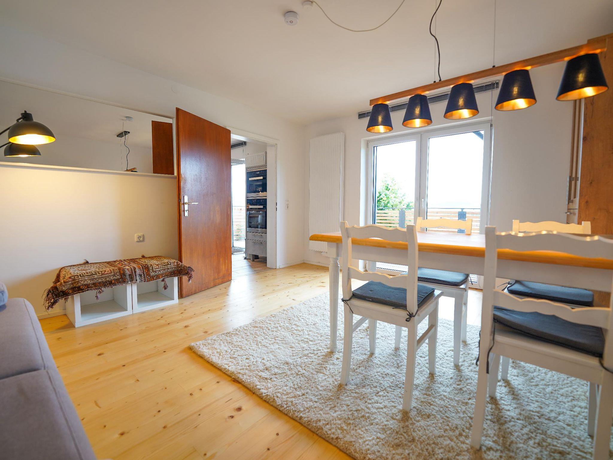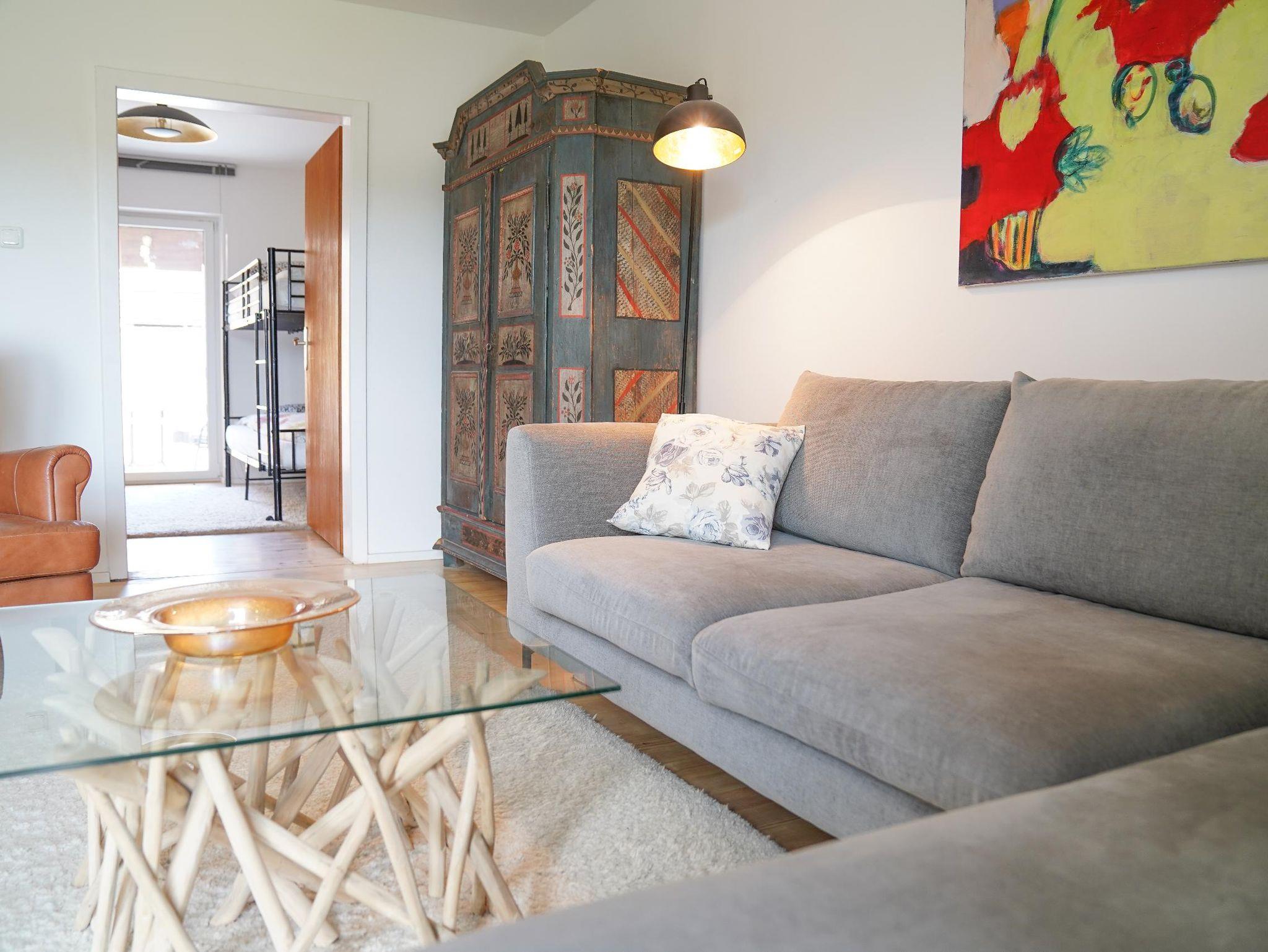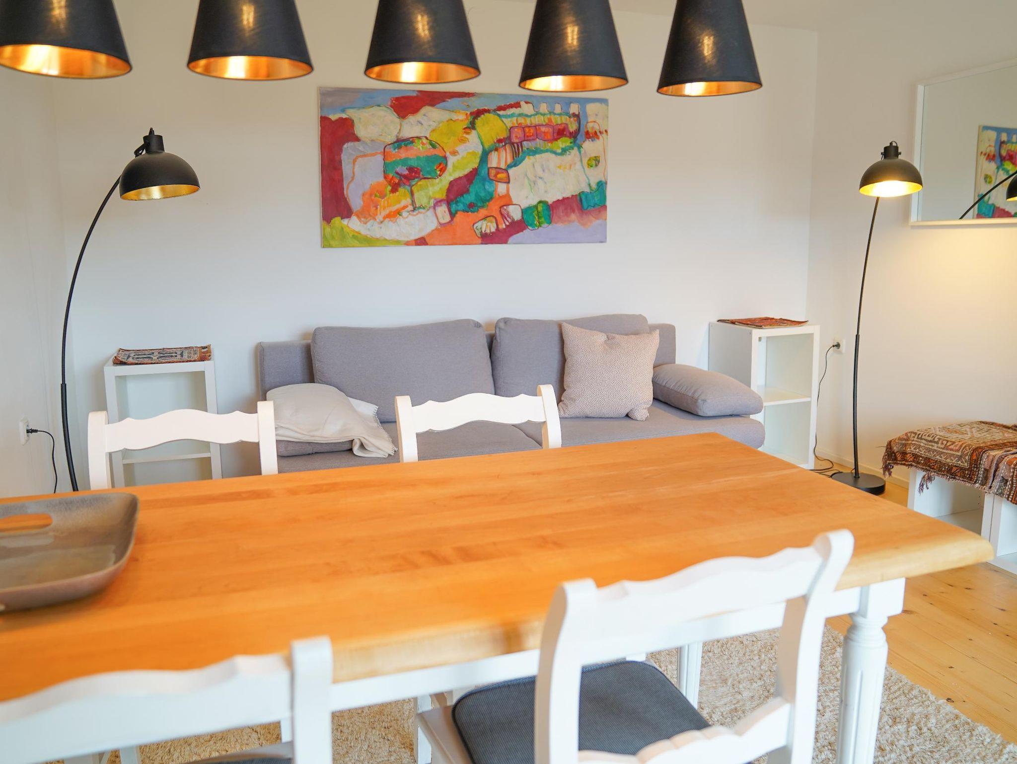 Von der Küche geht es ins Esszimmer. Am Tisch finden fünf Personen Platz, eine Ausziehcouch bietet eine zusätzliche Übernachtungsmöglichkeit. Auch von hier können Sie auf den Balkon treten, auf der anderen Seite der Küche liegt das Wohnzimmer mit gemütlicher Sitzecke, von der aus Sie den TV oder den Kaminofen im Blick haben. Im zweiten Schlafzimmer bietet ein Stockbett Platz für zwei weitere Gäste und ein kleiner Schreibtisch lässt sich z.B. für die Online-Arbeit nutzen. Ein Schrank bietet genügend Stauraum.