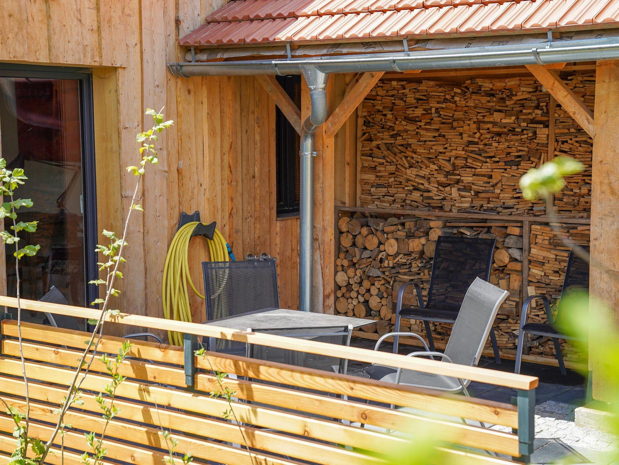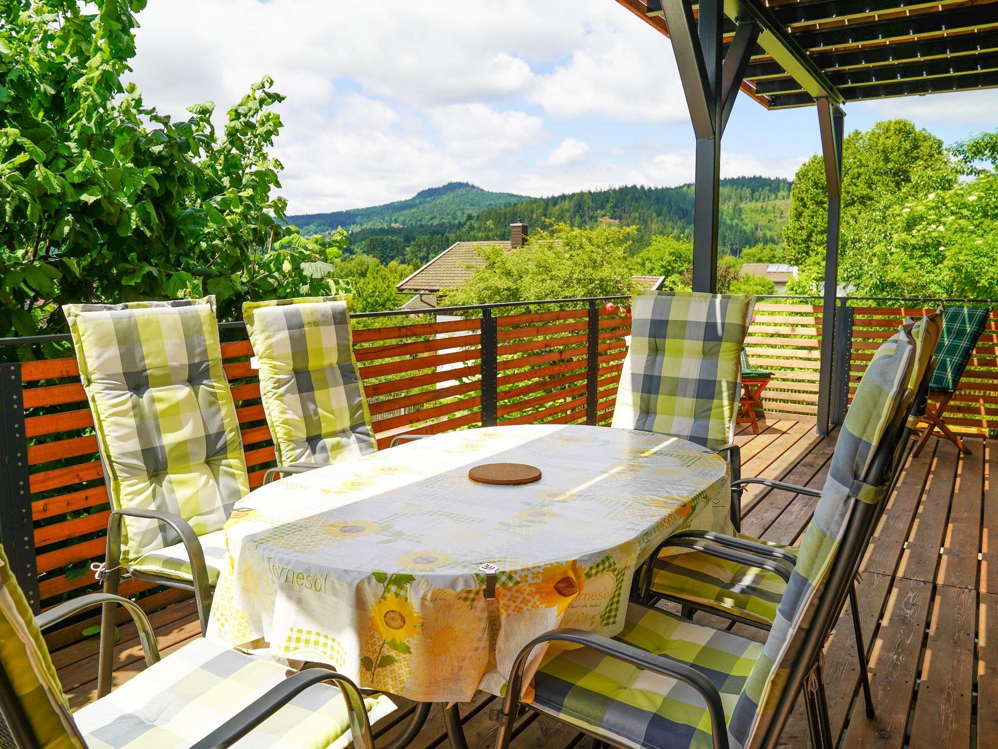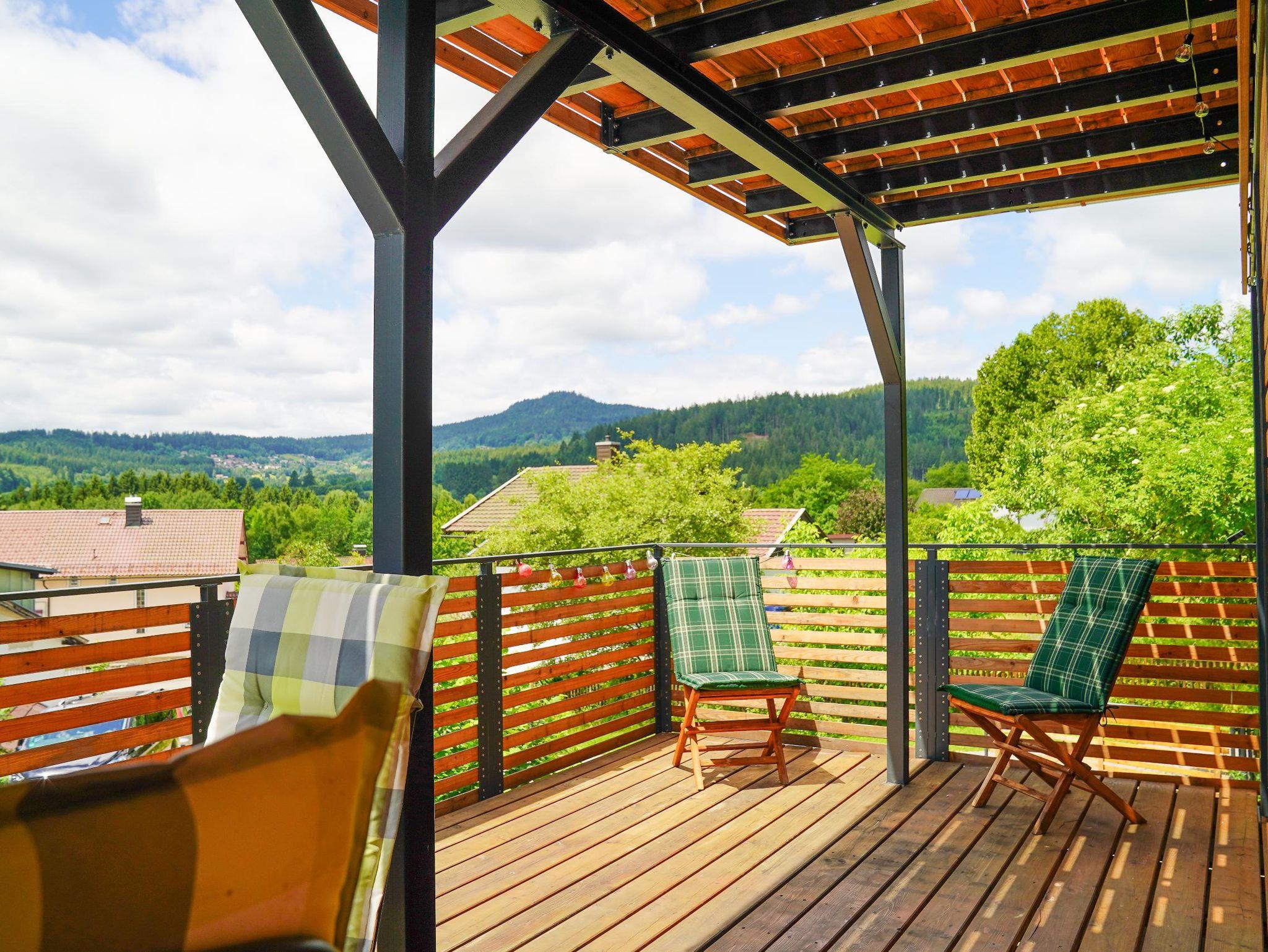 Auf dem Balkon genießen Sie auf über zwanzig Quadratmetern mit Südwestausrichtung das Panorama des Bayerischen Waldes: Blick auf Rabenstein, den Hennenkobel und die Stadt Zwiesel. Ein Essplatz lässt den Sonnenuntergang an warmen Sommerabenden zum Erlebnis werden. Zwei Teakholzstühle lassen sich zur Liege umklappen. Der große Haselnussstrauch oder ein Sonnenschirm spenden Schatten. Ebenso die Schiebeläden, die an heißen Sommertagen der Wohnung innen ein mediterranes Flair geben. Auf der Rückseite der Wohnung steht eine zweite Terrasse zur Verfügung als Rückzugsort zum Chillen.