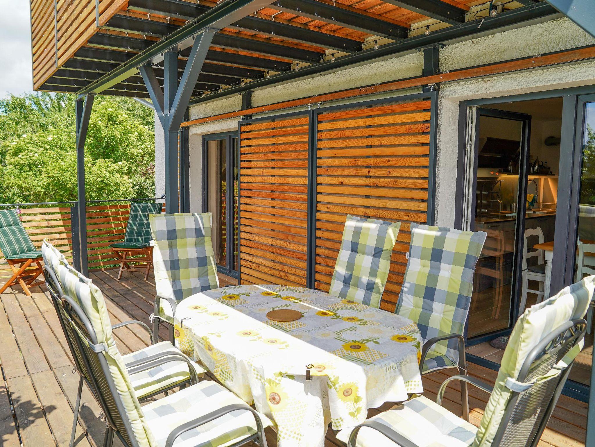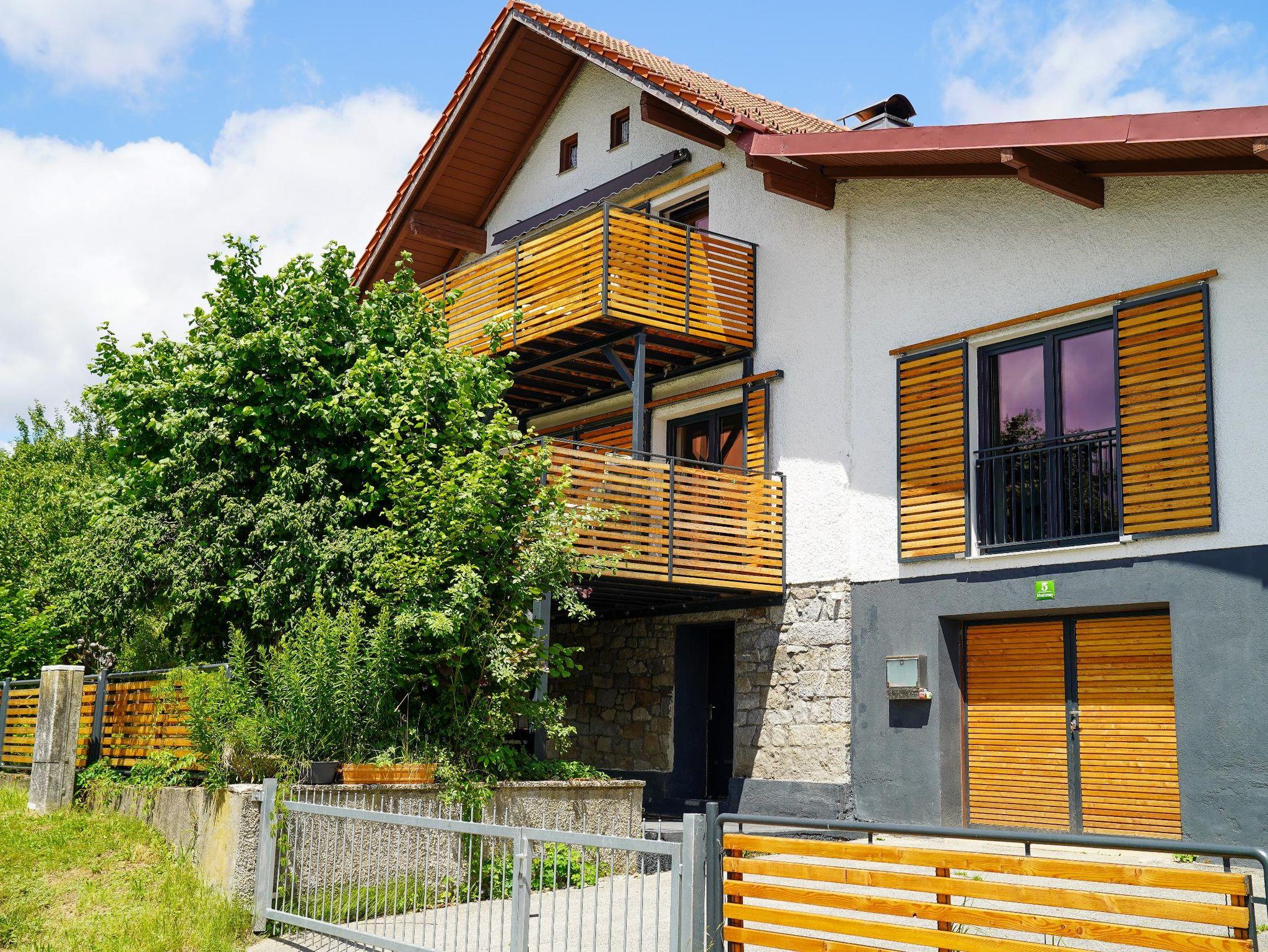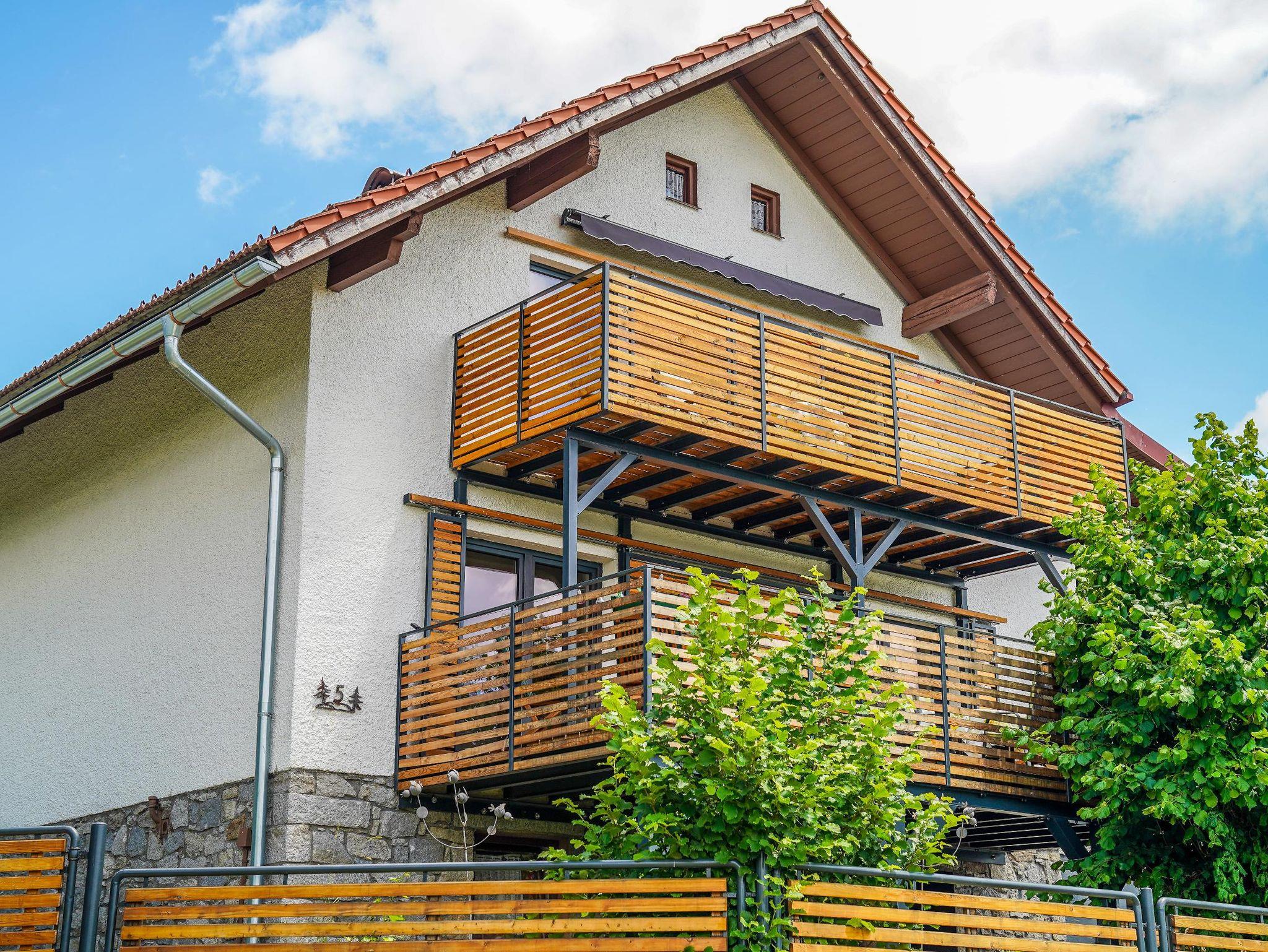 Auf dem Balkon genießen Sie auf über zwanzig Quadratmetern mit Südwestausrichtung das Panorama des Bayerischen Waldes: Blick auf Rabenstein, den Hennenkobel und die Stadt Zwiesel. Ein Essplatz lässt den Sonnenuntergang an warmen Sommerabenden zum Erlebnis werden. Zwei Teakholzstühle lassen sich zur Liege umklappen. Der große Haselnussstrauch oder ein Sonnenschirm spenden Schatten. Ebenso die Schiebeläden, die an heißen Sommertagen der Wohnung innen ein mediterranes Flair geben. Auf der Rückseite der Wohnung steht eine zweite Terrasse zur Verfügung als Rückzugsort zum Chillen.