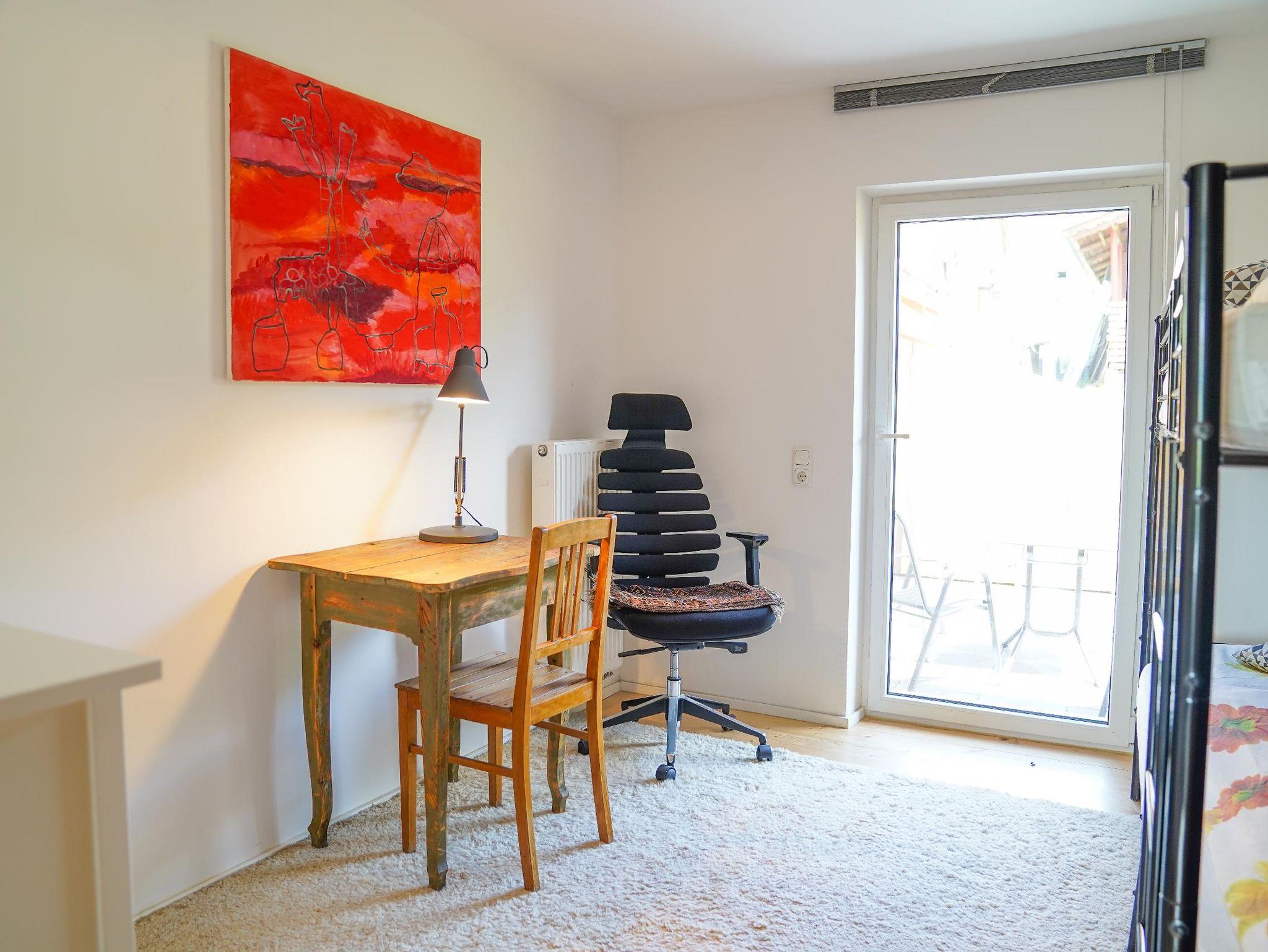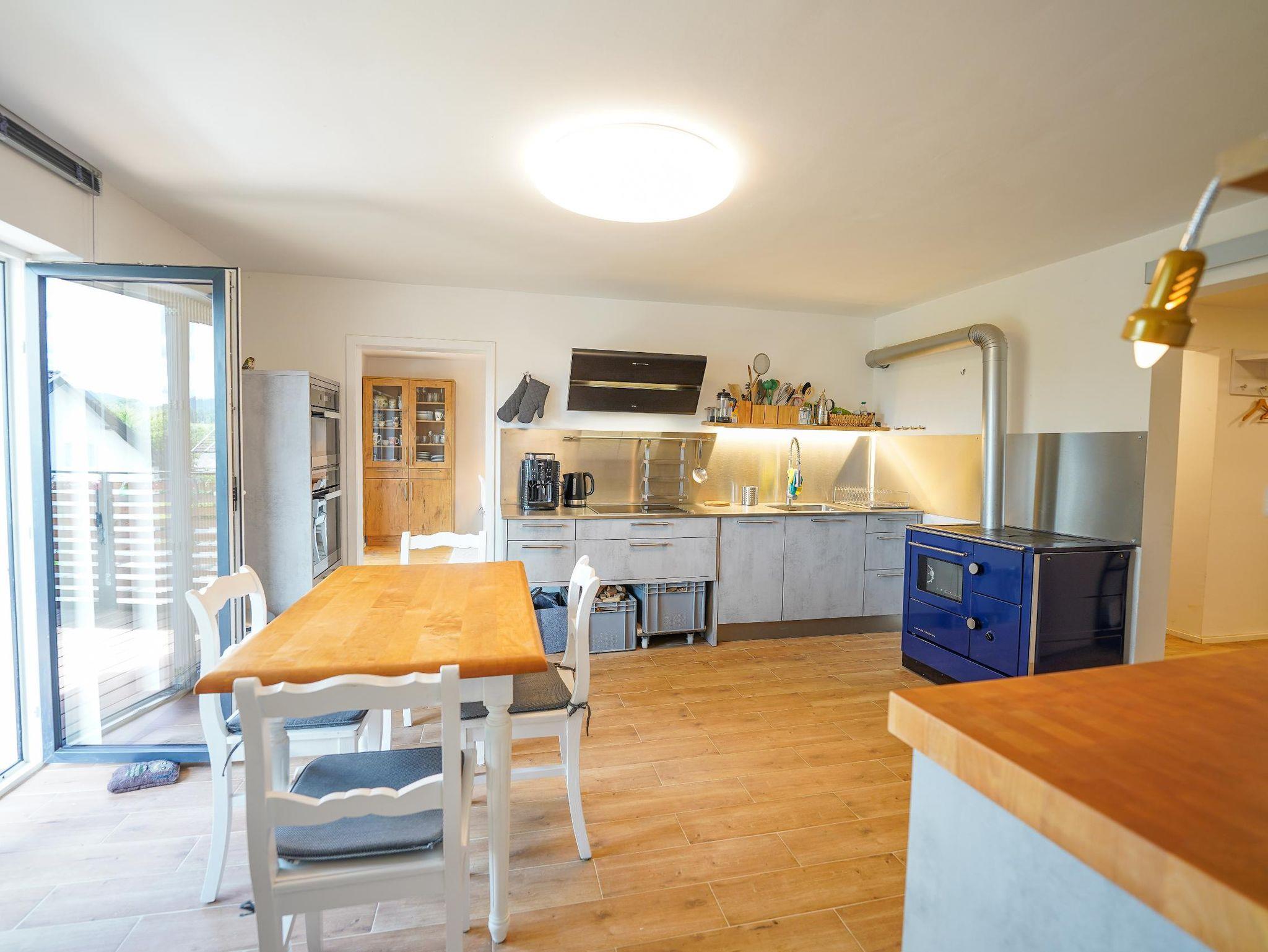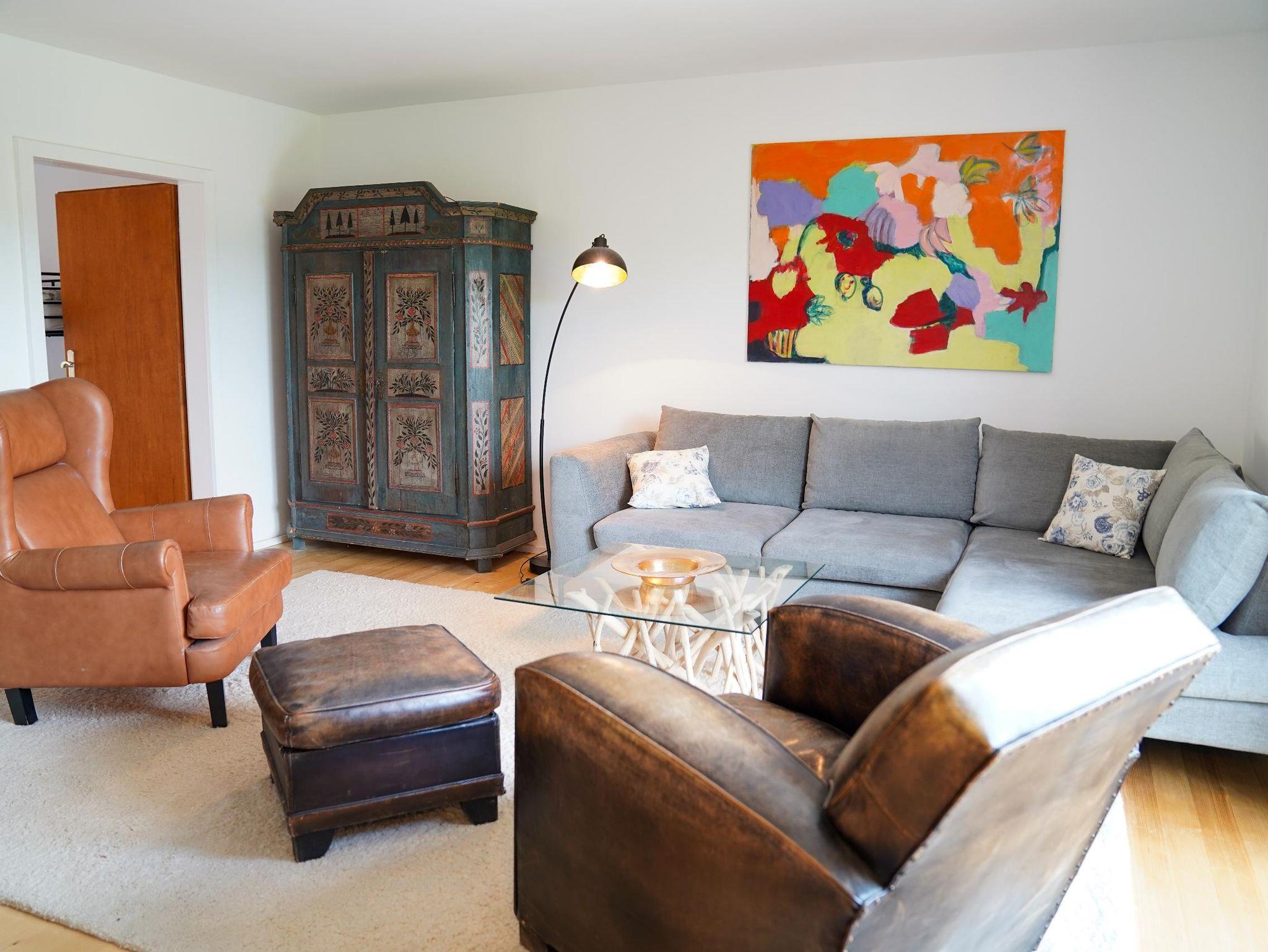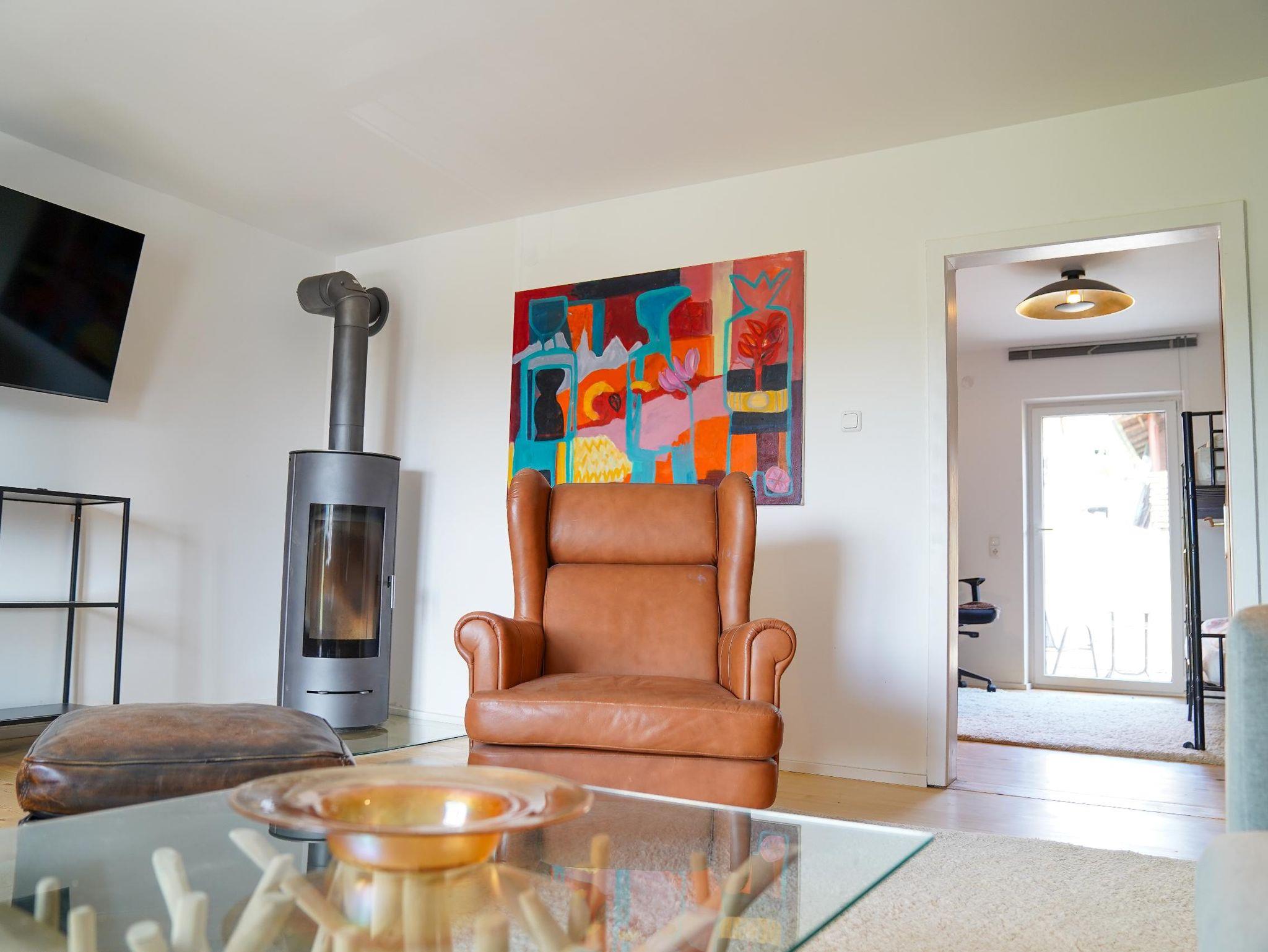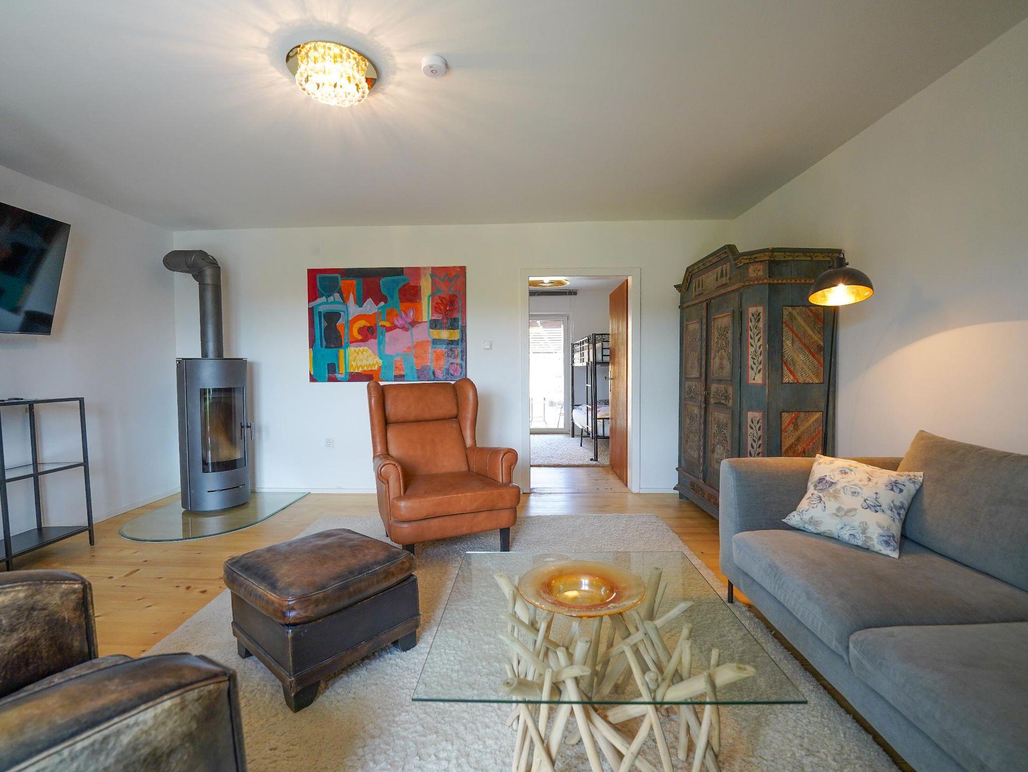 Von der Küche geht es in das zweite Schlafzimmer, dieses verfügt über ein Doppelbett (180 cm breit) und Sitzmöbel. Auch von hier können Sie auf den Balkon treten, auf der anderen Seite der Küche liegt das Wohnzimmer mit gemütlicher Sitzecke, von der aus Sie den TV oder den Kaminofen im Blick haben. Im dritten Schlafzimmer bietet ein Stockbett Platz für zwei weitere Gäste und ein kleiner Schreibtisch lässt sich z.B. für die Online-Arbeit nutzen. Ein Schrank bietet genügend Stauraum.