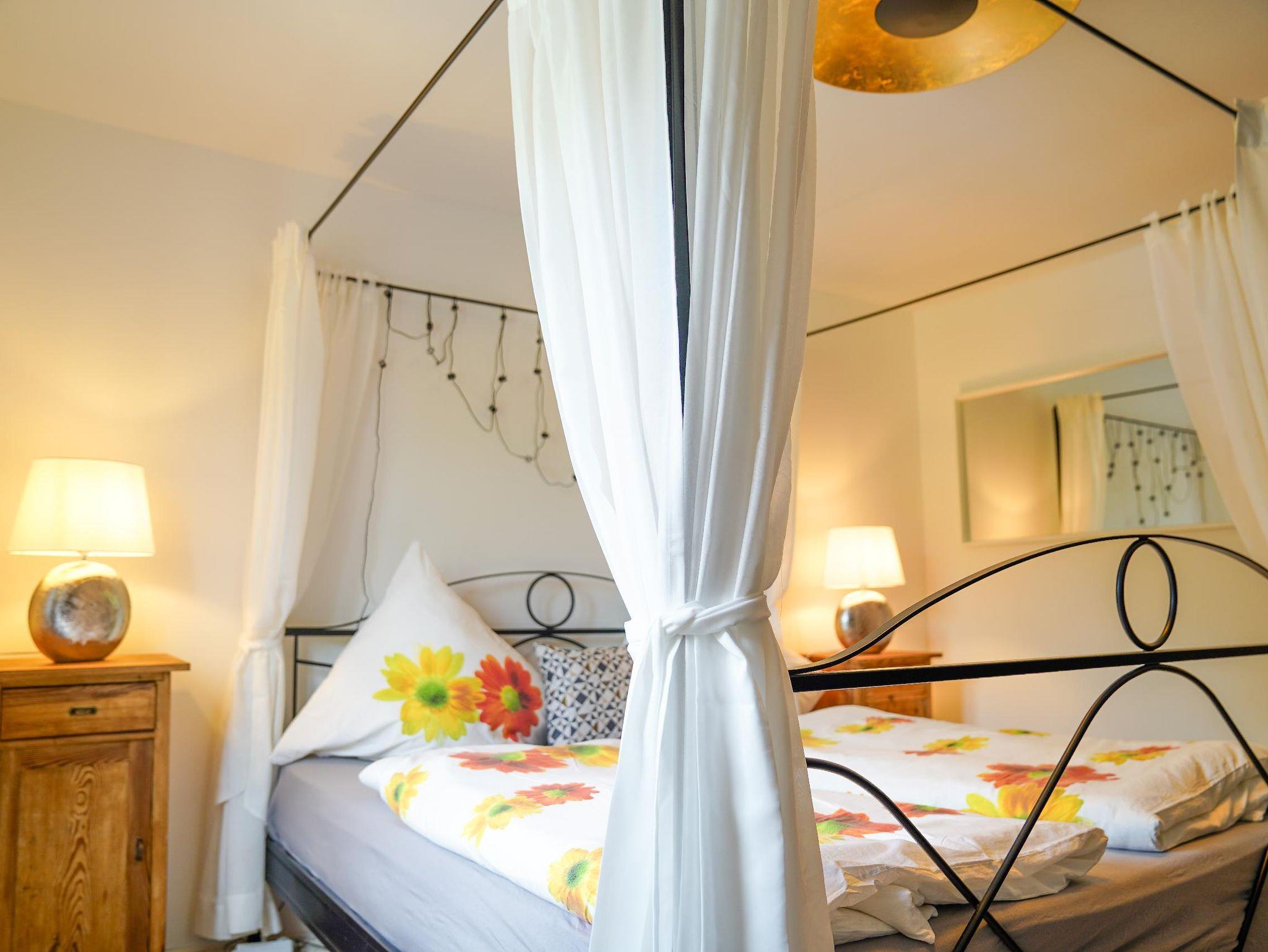 Vom Flur aus haben Sie Zugang zum Bad (Dusche und Badewanne), zur Gästetoilette, Nische im Flur für Waschmaschine und Trockner. Das Schlafzimmer verfügt über ein romantisches Himmelbett (180 cm breit), Schrank und Sitzmöbel. In der Wohnung liegt zentral die Luxusküche: E-Herd mit großem Ceranfeld, Klarstein-Dunstabzugshaube, Kaffee-Vollautomat, Backofen und Dampfgarer. Ein Esstisch bietet Platz für vier Personen. Zugang zum Balkon. In der kälteren Jahreszeit können Sie den Küchenherd einschüren und auf ihm kochen!