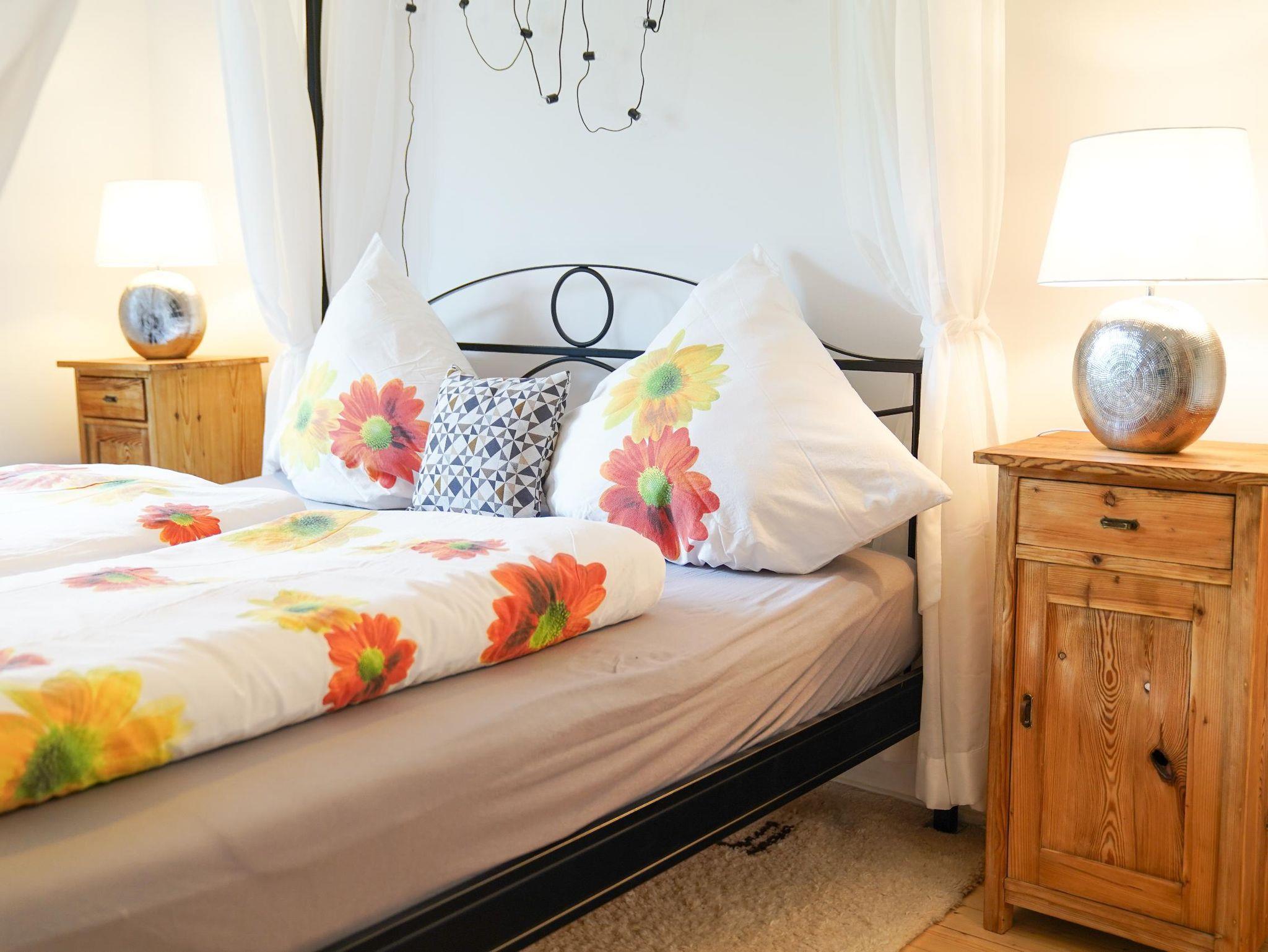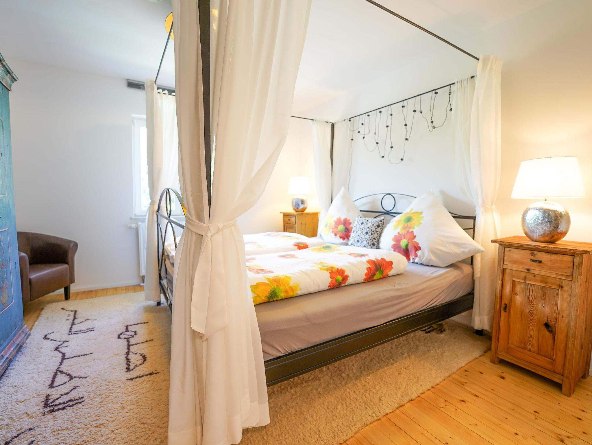 Vom Flur aus haben Sie Zugang zum Bad (Dusche und Badewanne), zur Gästetoilette, Nische im Flur für Waschmaschine und Trockner. Das erste Schlafzimmer verfügt über ein romantisches Himmelbett (180 cm breit), Schrank und Sitzmöbel. In der Wohnung liegt zentral die Luxusküche: E-Herd mit großem Ceranfeld, Klarstein-Dunstabzugshaube, Kaffee-Vollautomat, Backofen und Dampfgarer. Ein Esstisch bietet Platz für sechs Personen. Zugang zum Balkon. In der kälteren Jahreszeit können Sie den Küchenherd einschüren und auf ihm kochen!