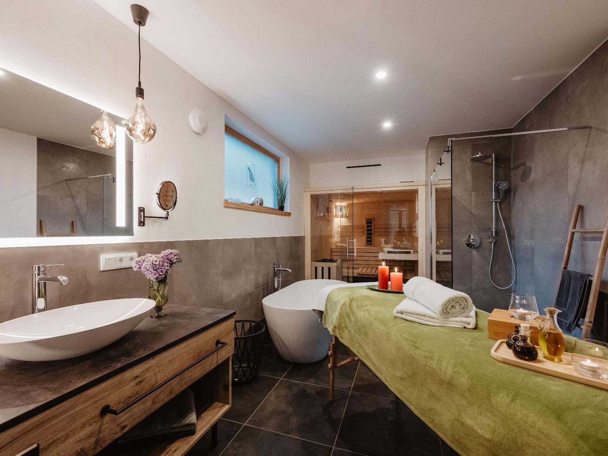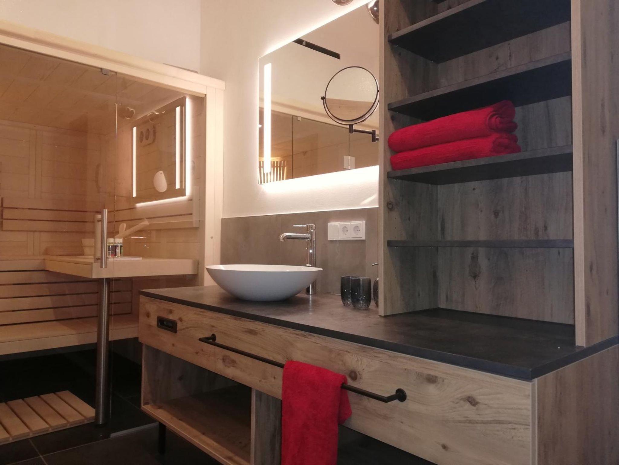 Beide Schlafzimmer sind mit hochwertigen Doppelbetten und Smart-TV ausgestattet und bieten jeweils einen Zugang zur Terrasse. Das Master-Bad mit steuerbarer Wellness-Ambiente-Beleuchtung, Einbauradio mit Bluetooth-Funktion, WC, großzügigem Waschtisch, freistehender Badewanne, Walk-in Regendusche und finnischer Sauna mit integriertem Infrarot-Bereich ist Ihre private Wellness-Oase.