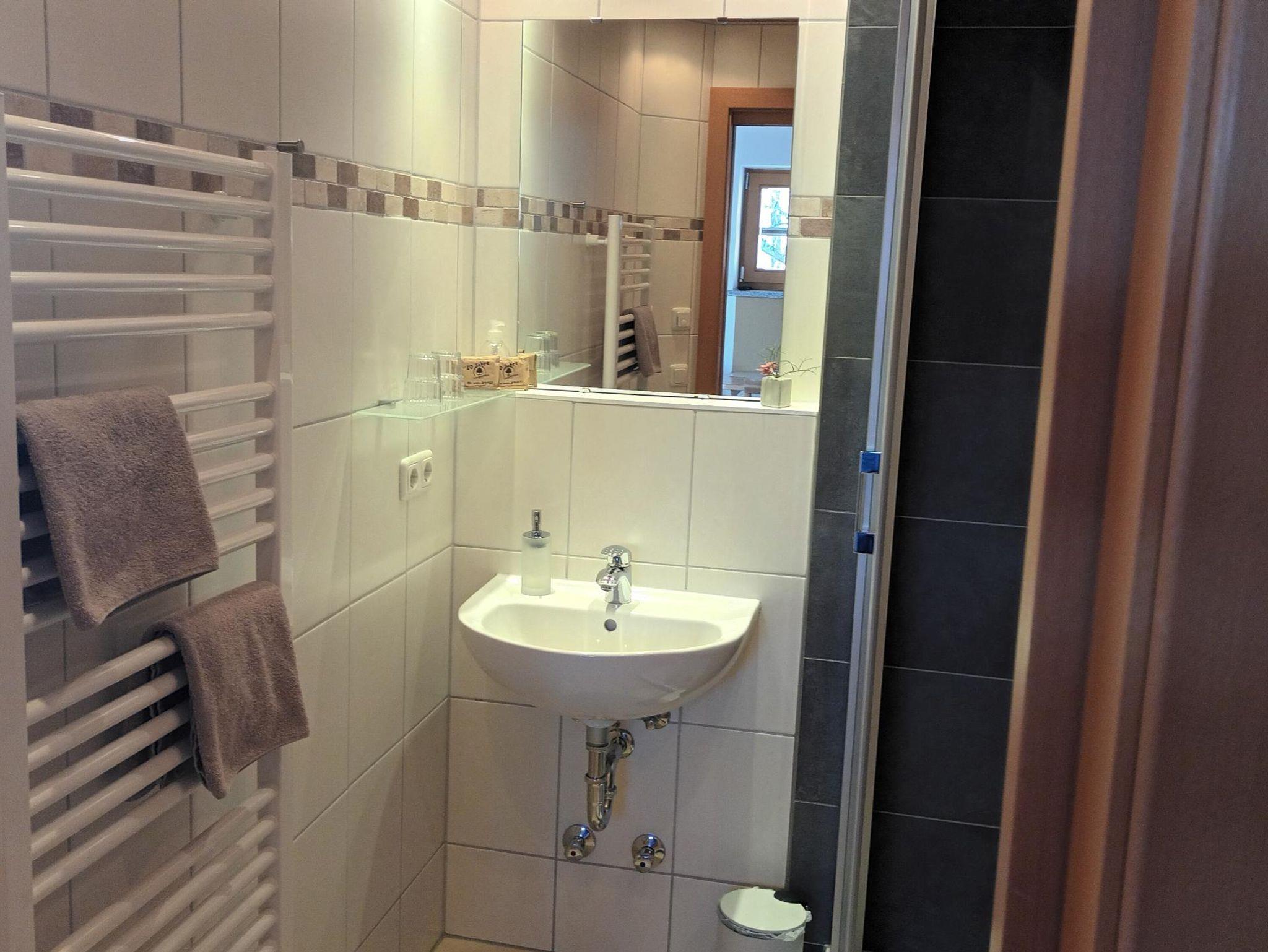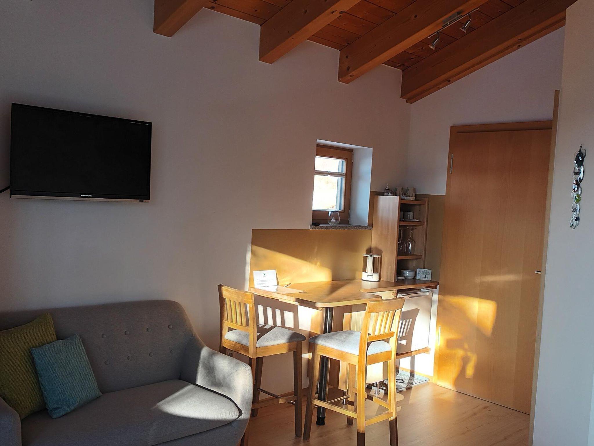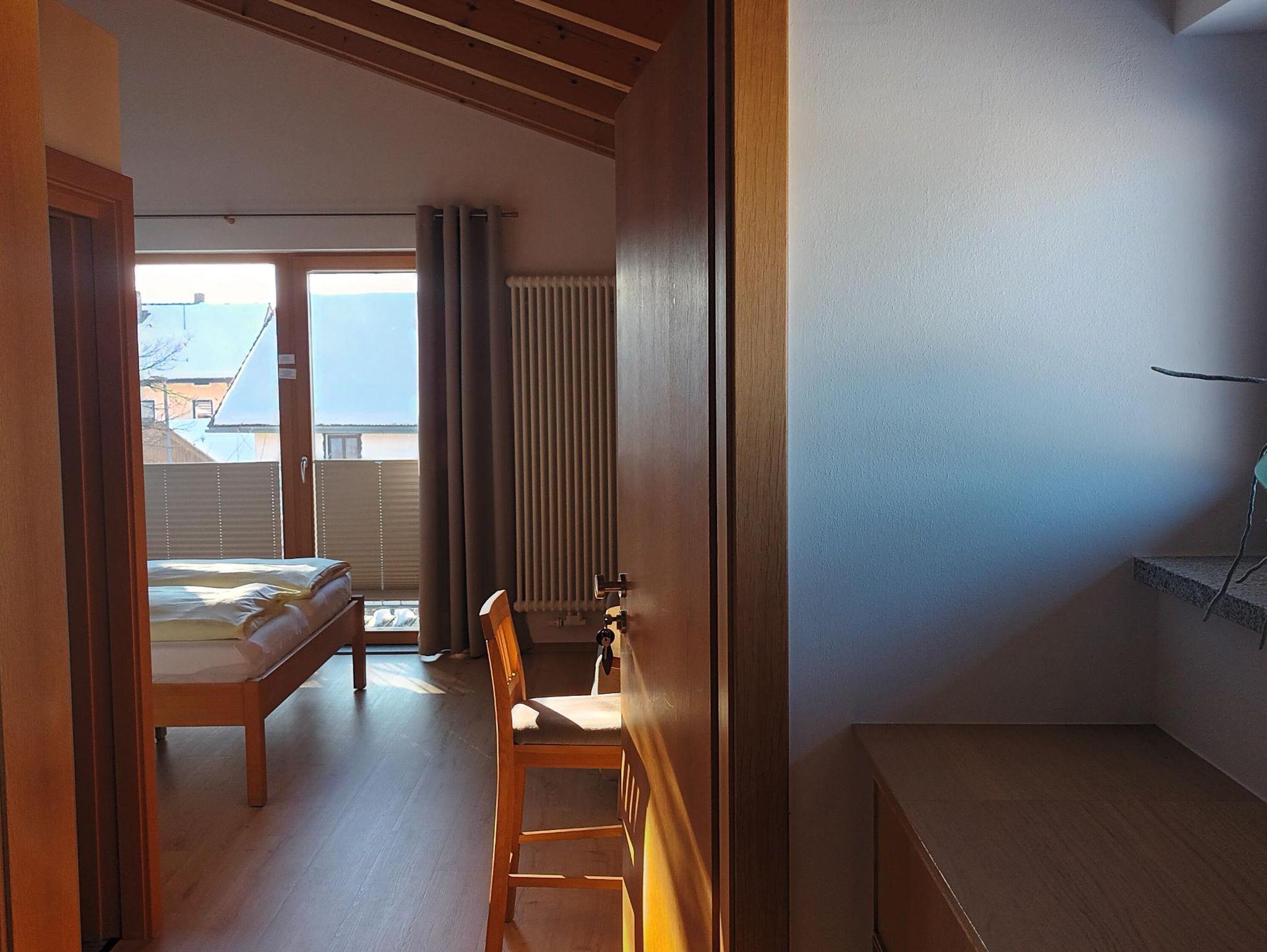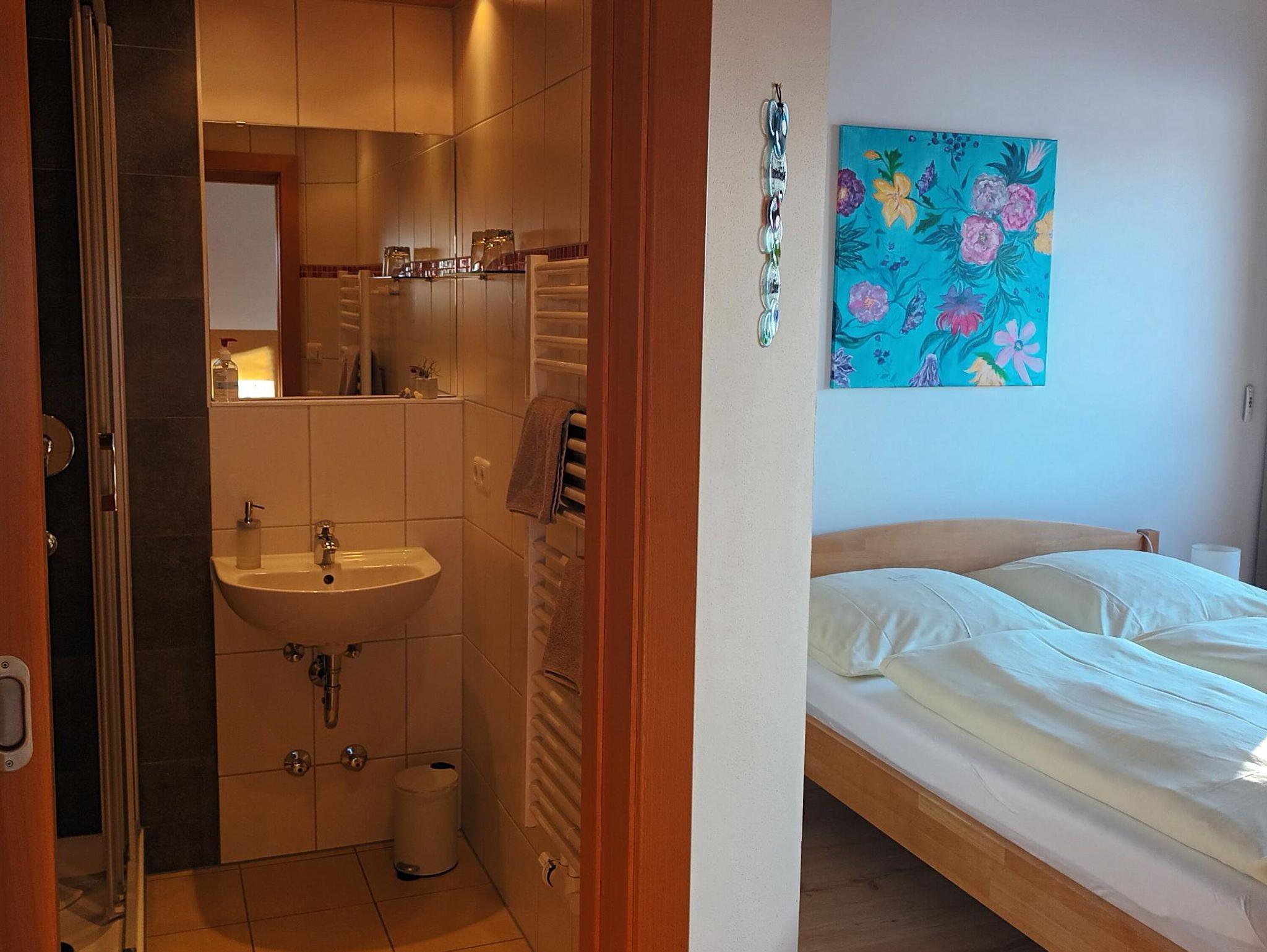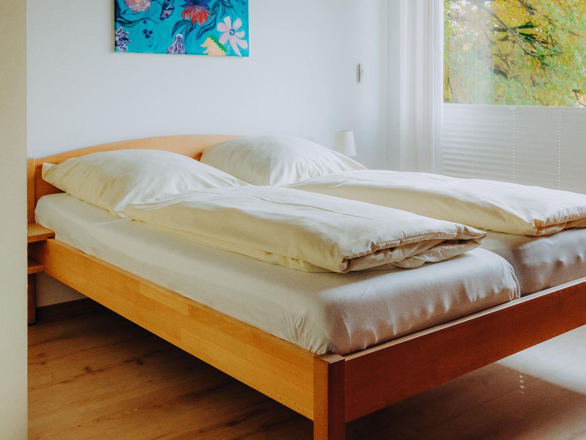 Mini-Appartements 3 und 4 (21 m²) im 2. Stock, Balkon mit Sitzgruppe. Im Mini-Appartement hochwertiger Purline Bioboden, Vollholzschrank, Sofa, Wasserkocher, kleiner Kühlschrank, schreinergefertigtes Frühstückseck. Doppelbett (160 cm) aus Vollholz mit verstellbaren Lattenrosten und Wende-Matratzen in wählbarer Festigkeit. Große oder kleinere Kopfkissen zur Wahl. Bettwäsche und Handtücher inklusive. Badezimmer mit DU/WC und wohliger Fußbodenheizung. Wenn Sie gerne kochen (und anschließend aufräumen). dürfen Sie unsere tolle, voll ausgestattete Küche im Gemeinschaftsraum im Erdgeschoss nutzen.