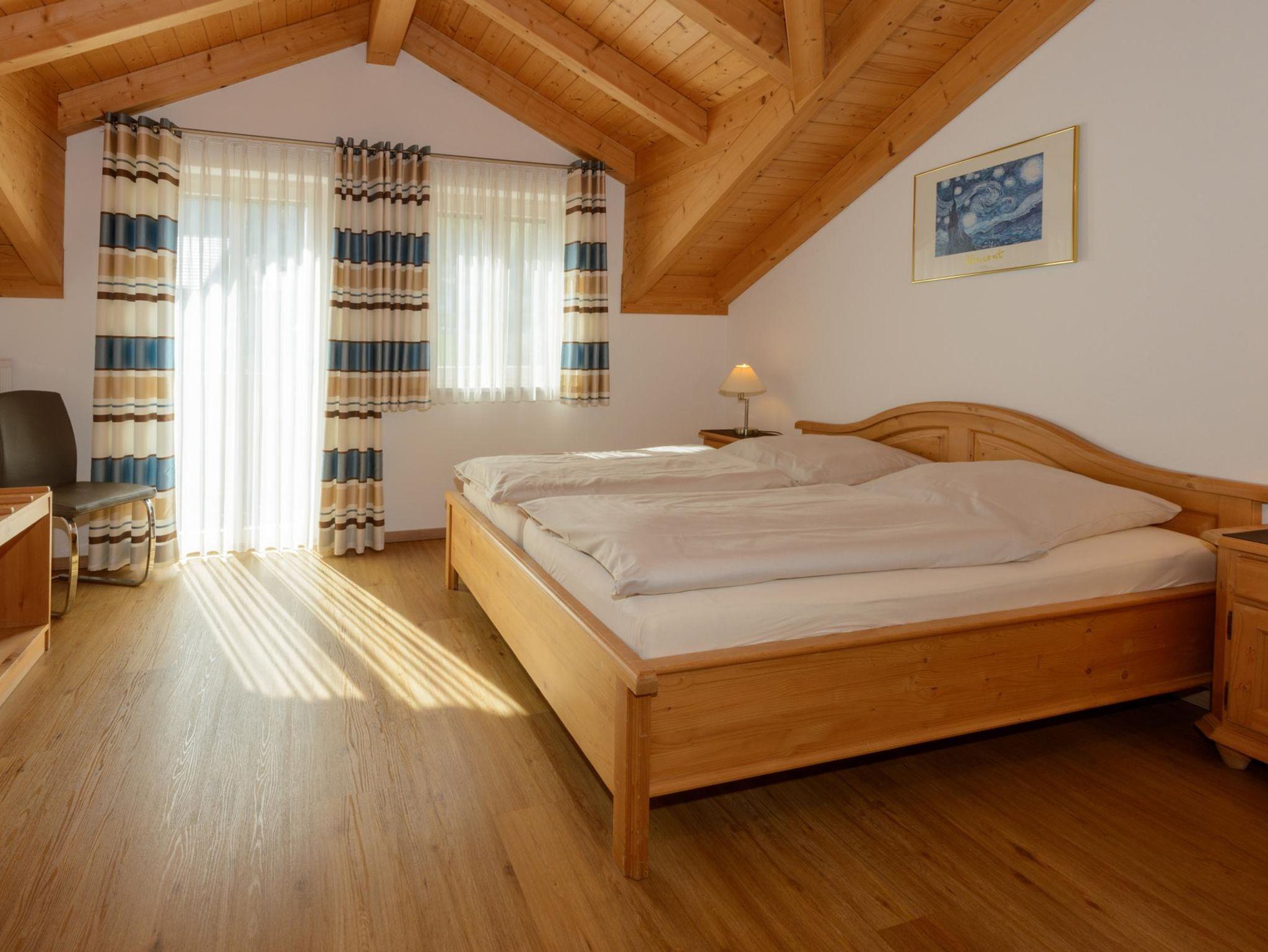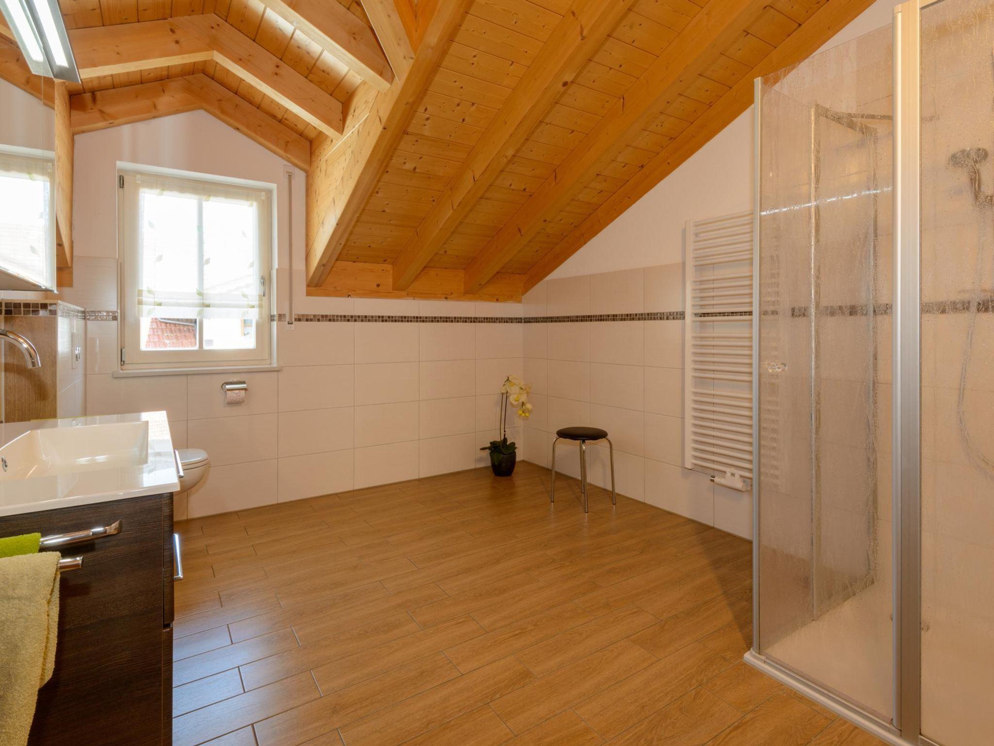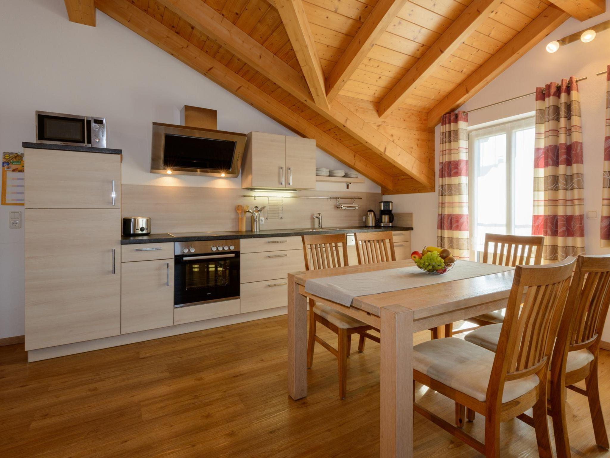 Unsere Ferienwohnung Almsonne mit 90 qm ist auf der 2. Etage und bietet Platz für 2 - 5 Personen. Der schöne Holzsichtdachstuhl in der ganzen Wohnung vermittelt Ihnen gleich ein Heimisches Gefühl von Natur. Der offengestaltete Wohn-Essbereich mit Sofa, Flachbild-TV, CD-Radio, Leselampe und Zugang zum Balkon lädt zum verweilen ein. Die komplett ausgestattete Küche mit Geschirrspüler, Kühlschrank incl. Gefrierfach, Herd, Backofen, Microwelle, Toaster, Wasserkocher, Kaffeefiltermaschine rundet den Essbereich ab. Die helle Ferienwohnung hat 2 Schlafzimmer, jeweils mit Doppelbett ohne Fußenden, einem Einzelbett, einem Babybett und Zugänge zu den Balkonen. Das geräumige Tageslichtbad ist mit ebenerdiger Dusche, Handtuchtrockner, Hocker, Wäscheständer und großen Spiegelschrank ausgestattet. Nach entspannten Grillabenden werden die Außenrollos der