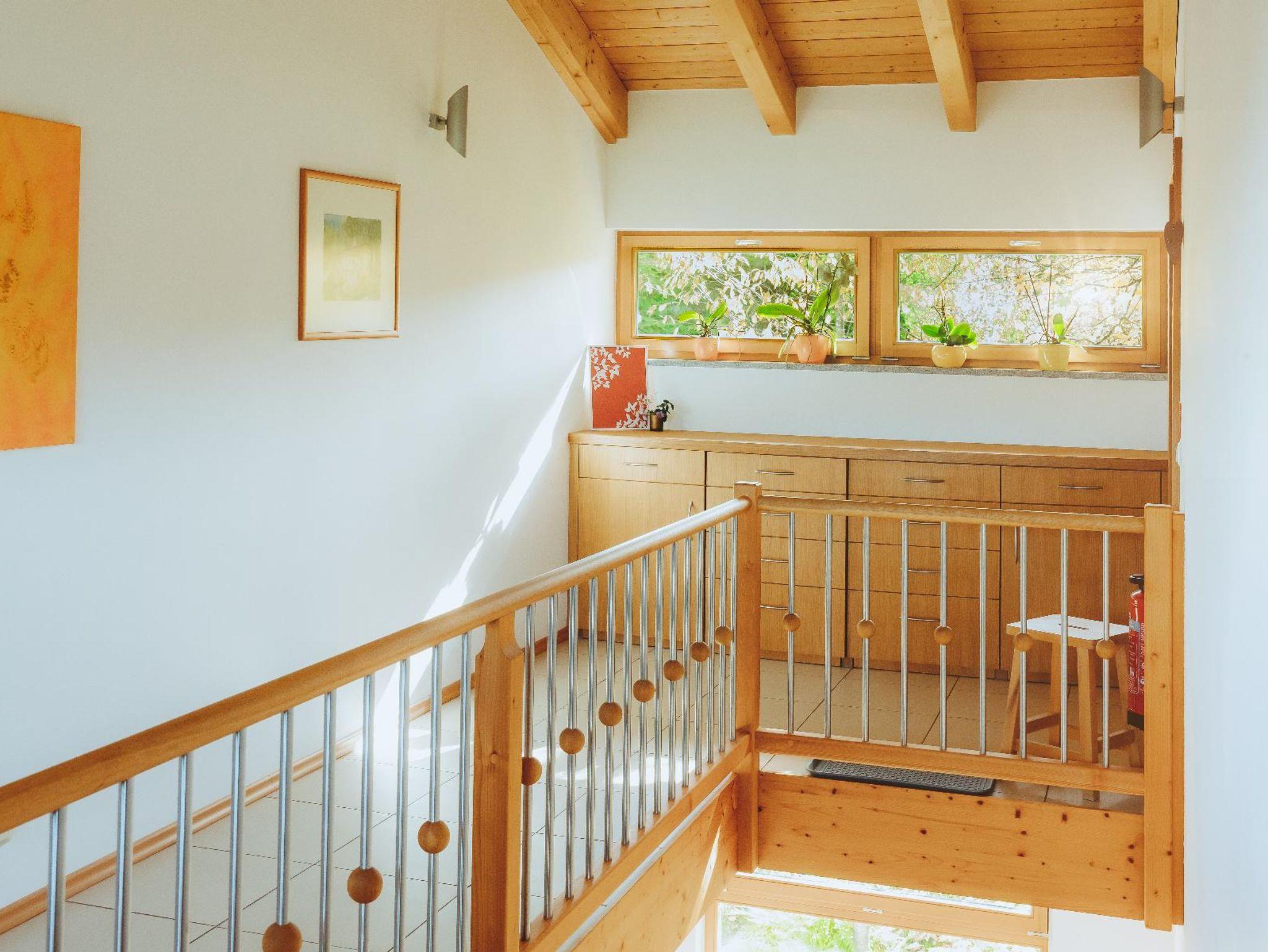 Ferienwohnung Nr. 1 im 1. Stock (42 qm) mit großem Balkon mit Liegestuhl und Sitzgruppe. Appartement ist open-plan gestaltet und hat hochwertigen Wineo-Bioboden. Voll ausgestattete Küchenzeile mit Wasserkocher und Filterkaffeemaschine. Essgruppe mit rundem Tisch aus Vollholz, Im Schlafbereich Doppelbett (160 cm) aus Vollholz mit verstellbarem Lattenrost und Wende-Matratzen in zwei wählbaren Festigkeiten. Großes oder kleineres Kopfkissen zur Auswahl. Netzfreischalter im Schlafbereich. Möglichkeit für dritte Person auf dem Sofabett zu schlafen. DU/WC mit wohliger Fußbodenheizung. Handtücher und Bettwäsche inklusive. Verdunkelungsvorhänge. Gratis WLAN und SAT-TV.
