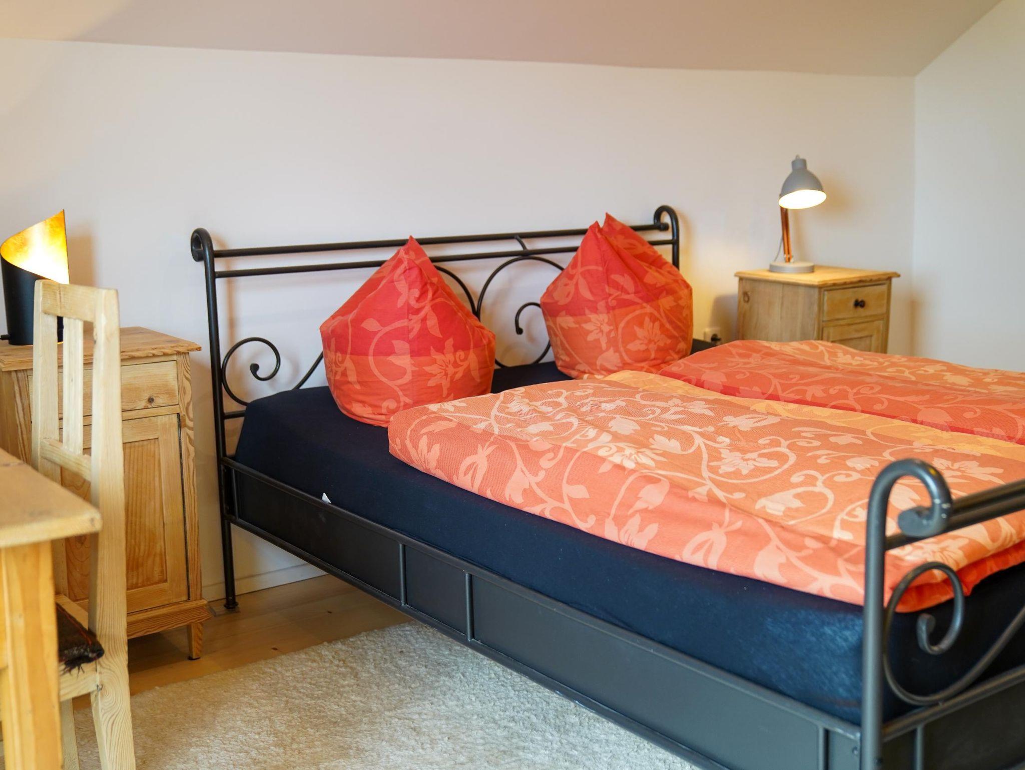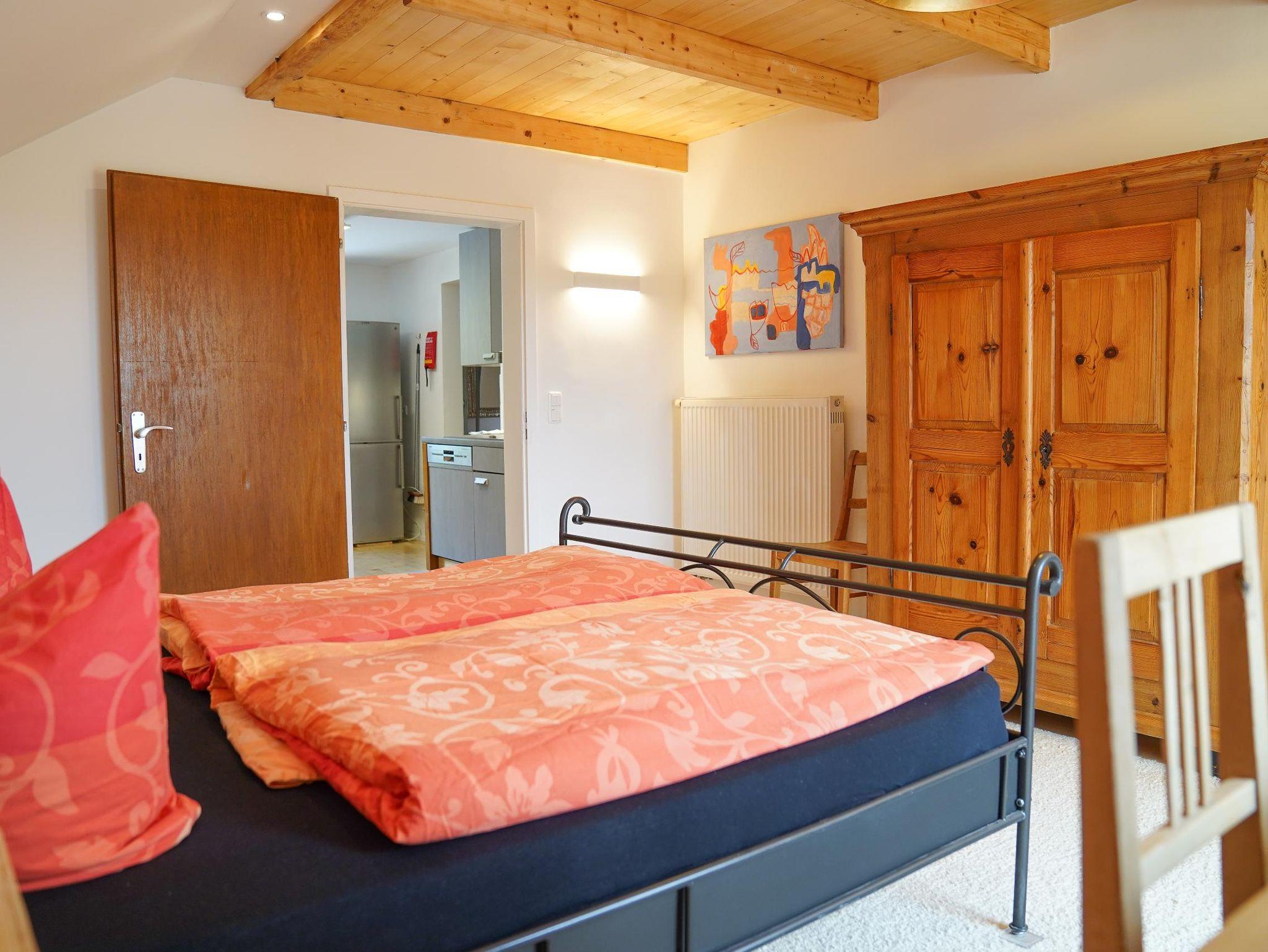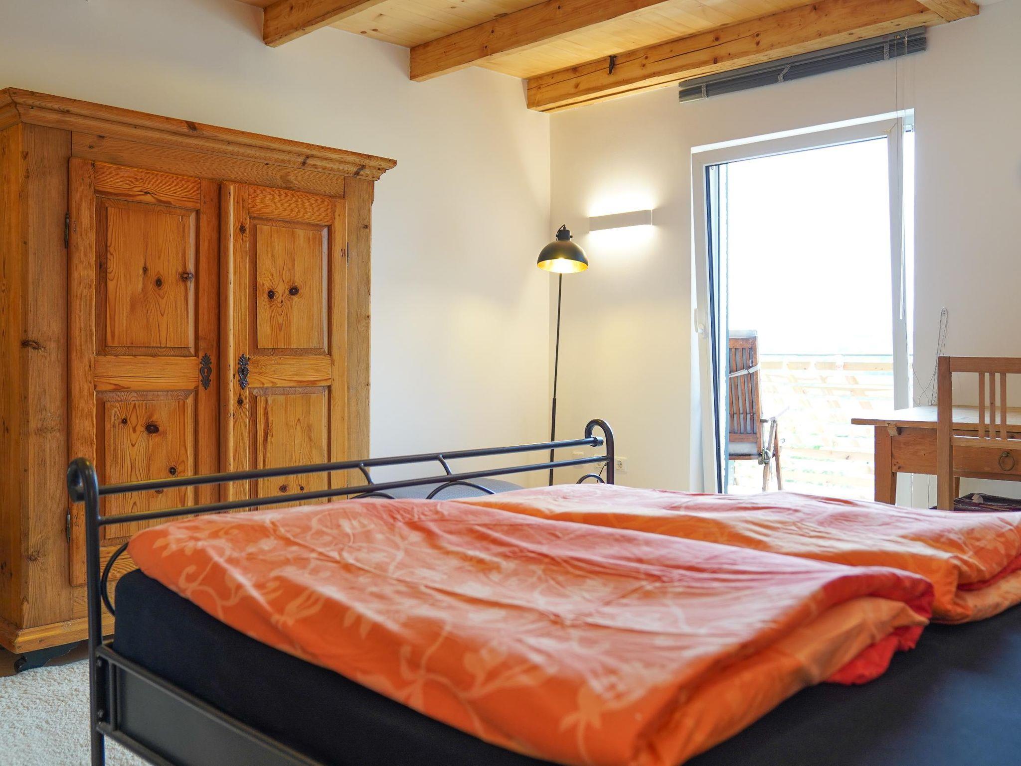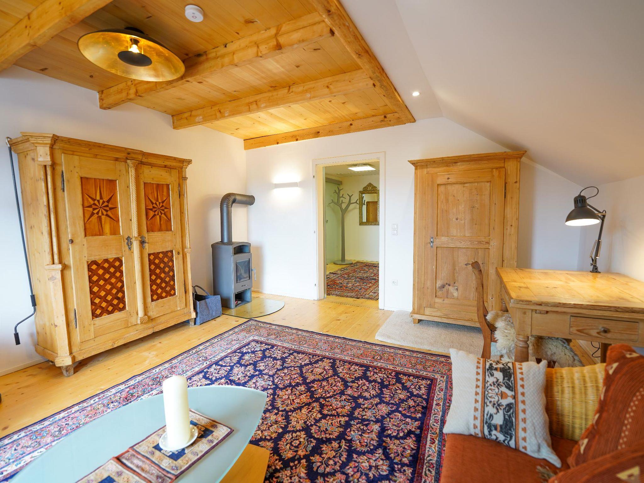 Vom Flur aus haben Sie Zugang zum Abstellraum mit Trockner, dem Duschbad mit Waschmaschine, dem Wohnzimmer und der Küche. Diese ist voll ausgestattet mit E-Herd, Spülmaschine, Kühl-Gefrierkombination, Kaffeevollautomat, Toaster, zahlreichen Schränken und dem Esstisch, an dem auch Gäste mit bewirtet werden können. Das Schlafzimmer mit Doppelbett (160 cm breit), geräumigen Kleiderschrank und kleinem Schreibtisch hat einen Zugang zum Balkon. Im Wohnzimmer lädt eine (ausziehbare) Couch zu gemütlichen Stunden ein beim Ratschen, TV-Schauen, beim Blick auf das Feuer im Kaminofen oder einfach beim Träumen. Ein kleiner Schreibtisch steht für das Homeoffice bereit. Auch vom Wohnzimmer haben Sie Zugang zum Balkon.