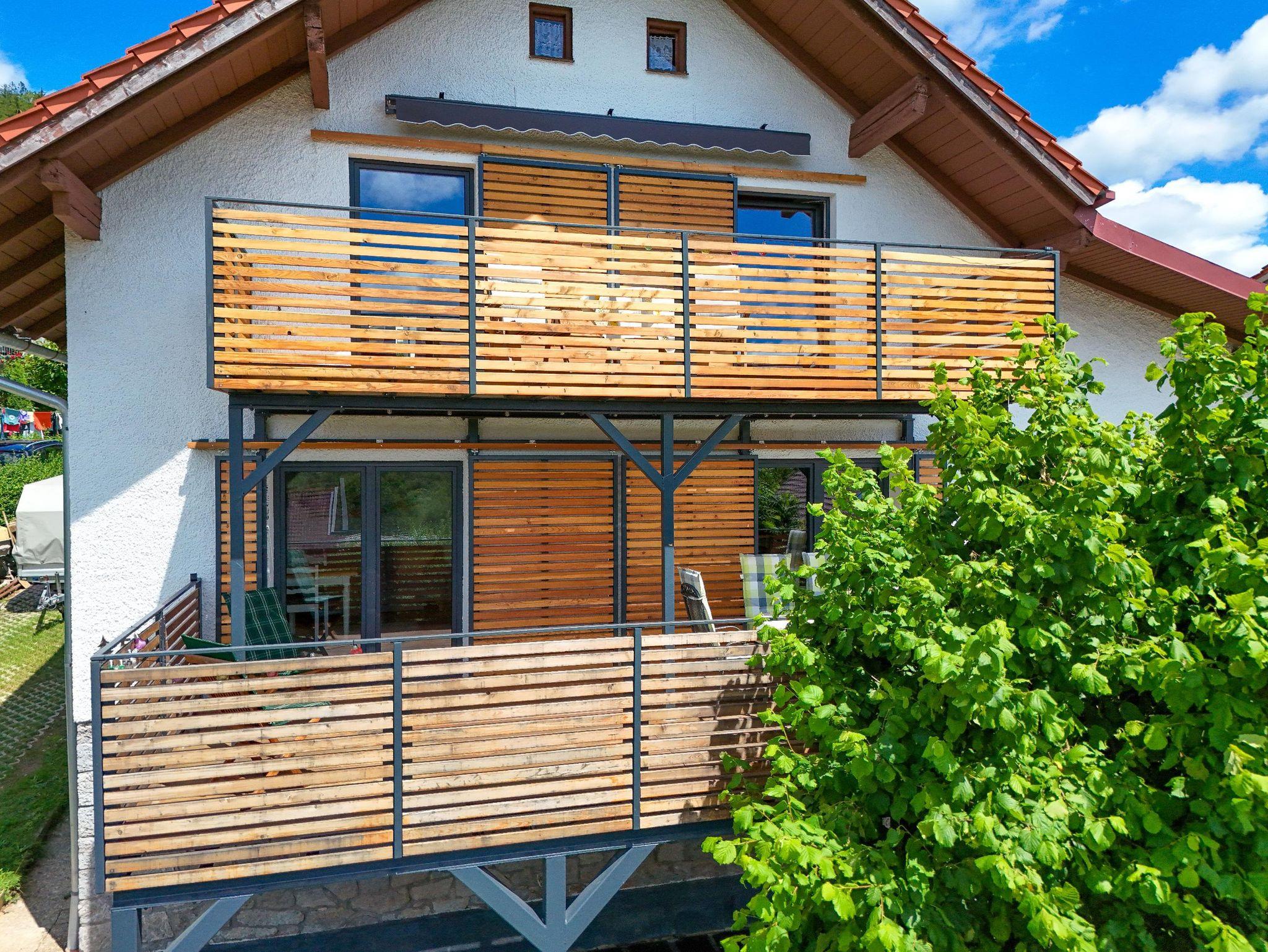 Auf zwölf Quadratmetern mit Südwestausrichtung genießen Sie das Panorama des Bayerischen Waldes: Blick auf Rabenstein, den Hennenkobel und die Stadt Zwiesel. Ein Essplatz lässt den Sonnenuntergang an warmen Sommerabenden zum Erlebnis werden. Die Teakholzstühle lassen sich zur Liege umklappen. Eine Markise und ein Sonnenschirm spenden Schatten. Ebenso die Schiebeläden, die an heißen Sommertagen der Wohnung innen ein mediterranes Flair geben.