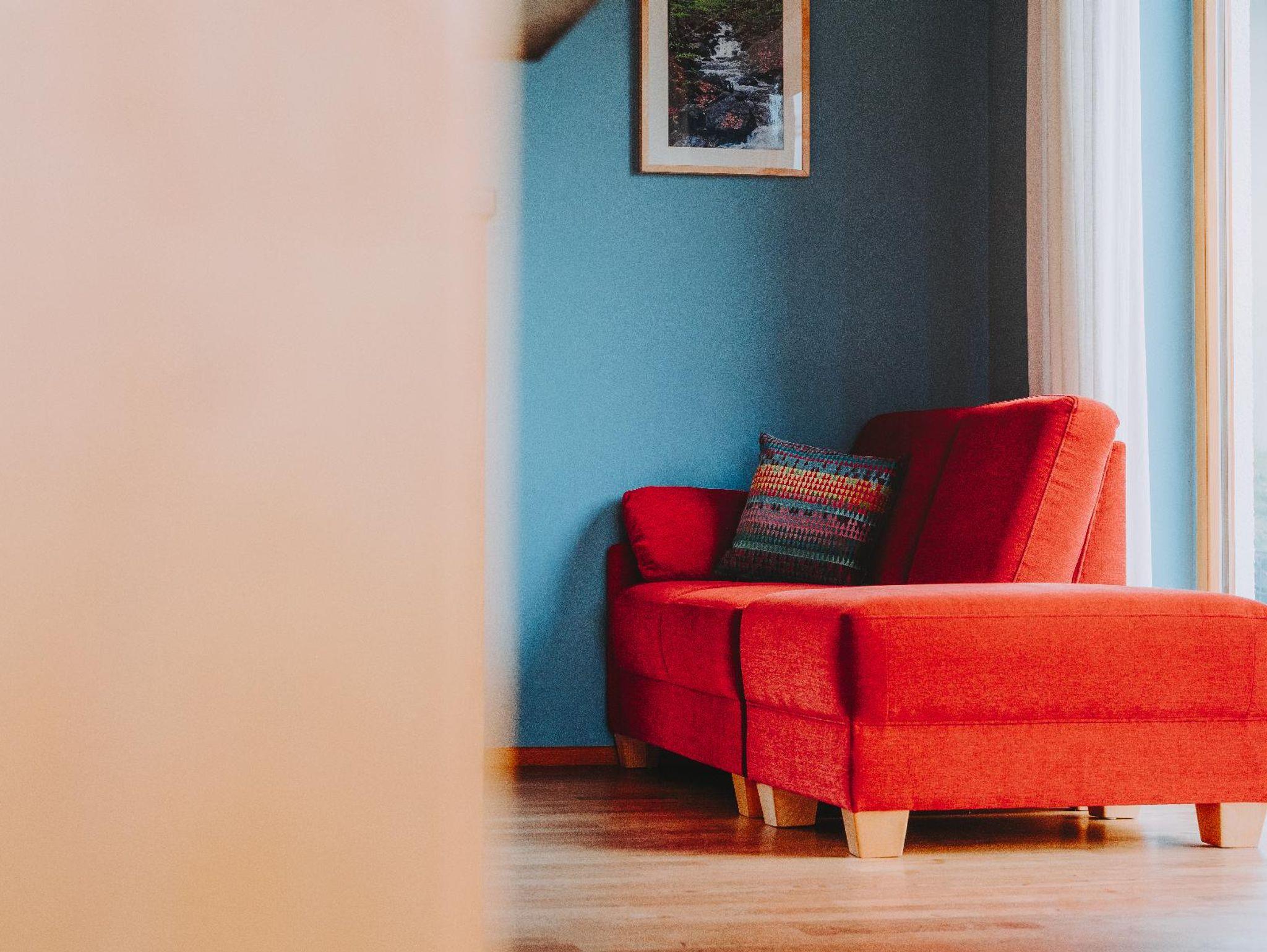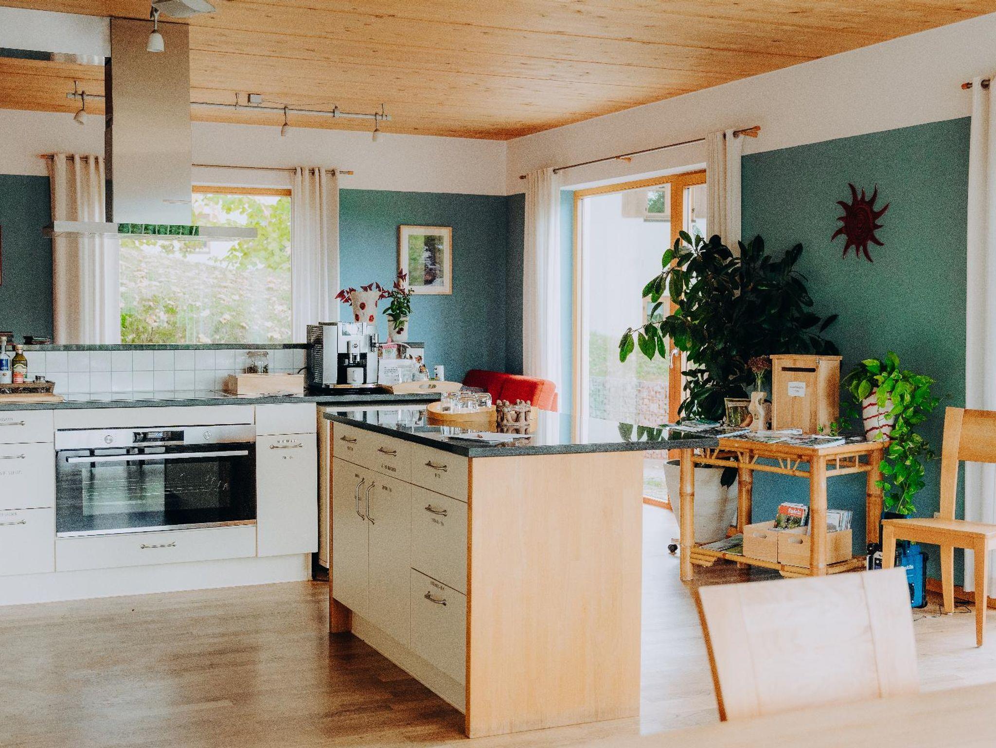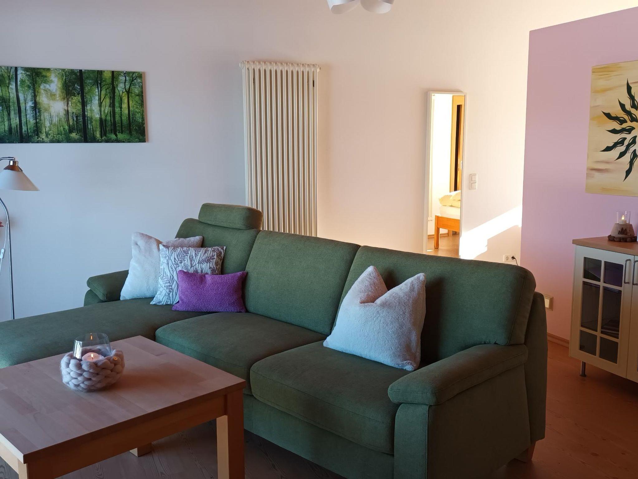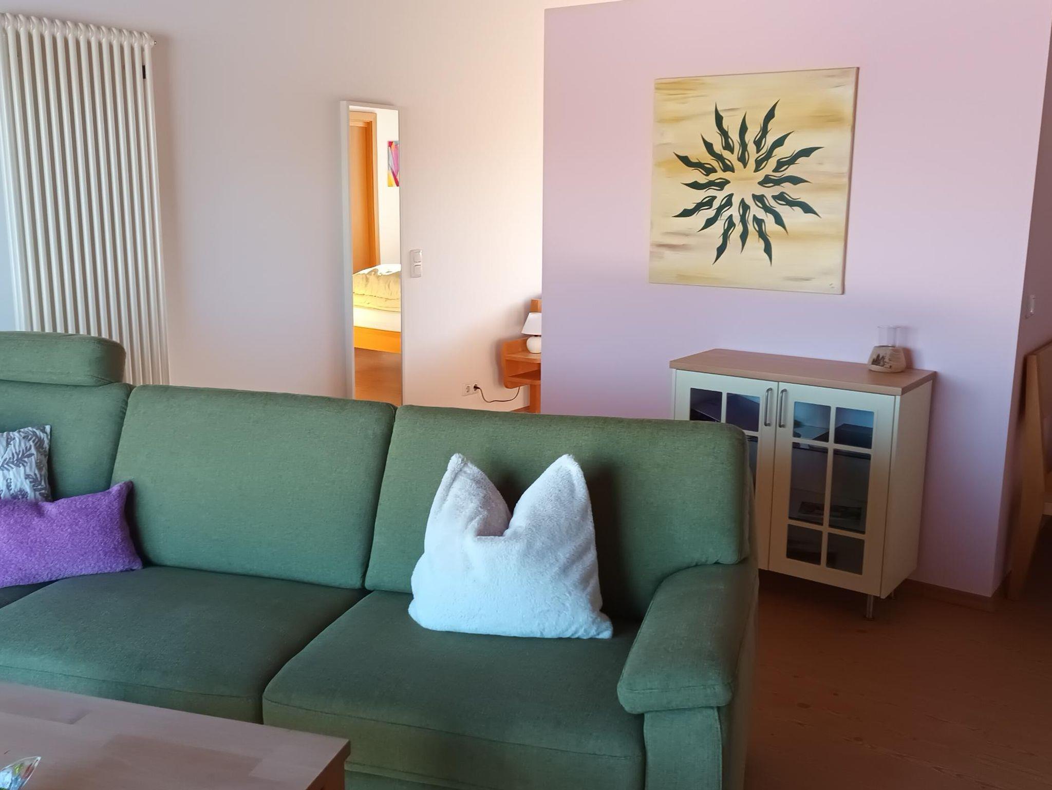 Ferienwohnung Nr.5 (42 qm) im 2.Stock, Sichtdachstuhl, open-plan gestaltet, zwei Balkone. Hochwertige Ausstattung, Korkboden in Holzoptik, schreinergefertigte Essecke, voll ausgestattete Küche mit Wasserkocher und Filterkaffeemaschine. Im Schlafbereich Doppelbett (160 cm) aus Vollholz mit verstellbaren Lattenrosten und Wende-Matratzen in zwei wählbaren Festigkeiten . Große oder kleinere Kopfkissen zur Wahl. Netzfreischalter im Schlafbereich. Badezimmer mit DU/WC und wohliger Fußbodenheizung. Bettwäsche und Handtücher inklusive. Möglichkeit für dritte Person auf Sofabett im Wohnbereich zu schlafen. Gratis WLAN und SAT-TV.
