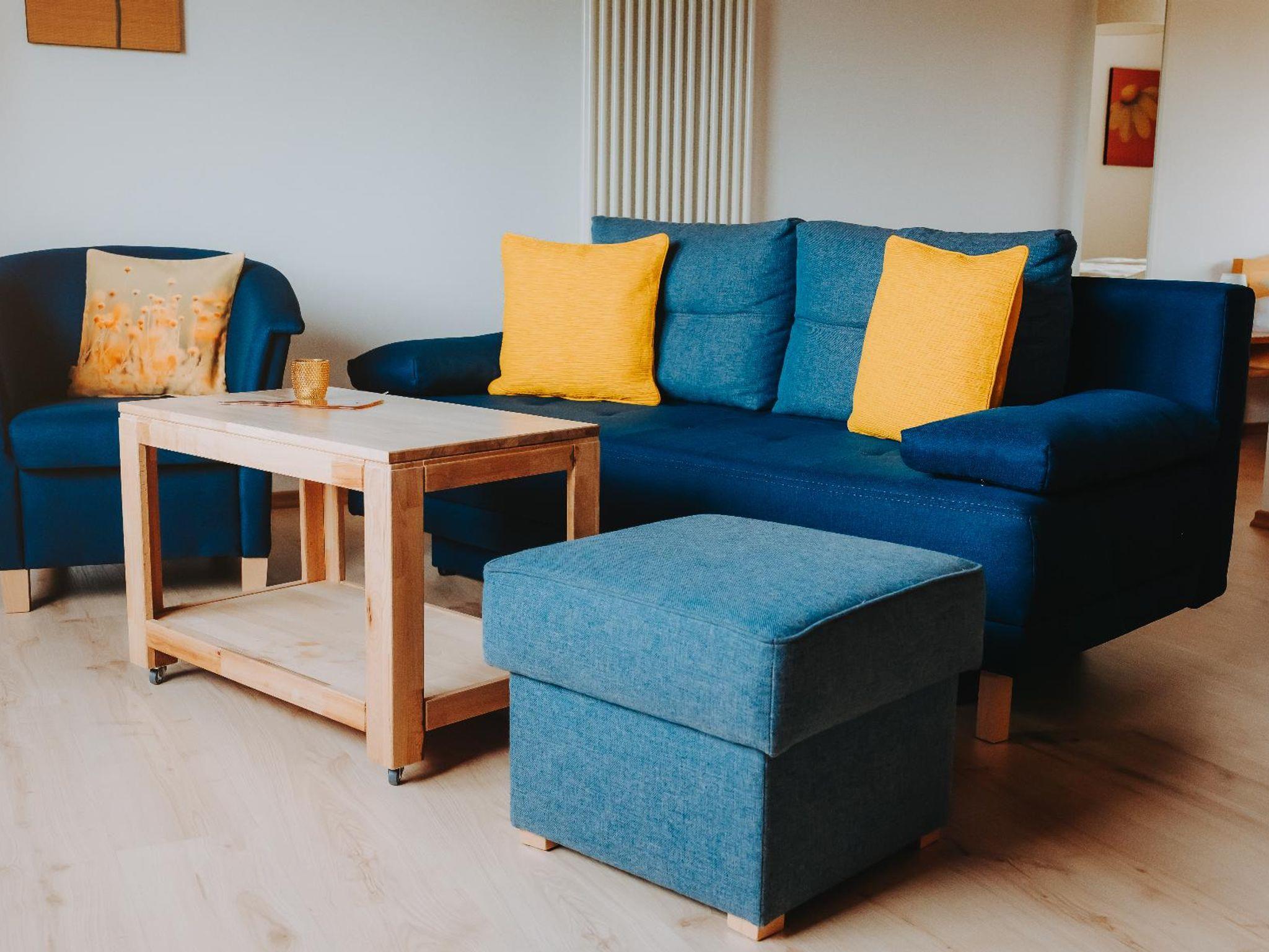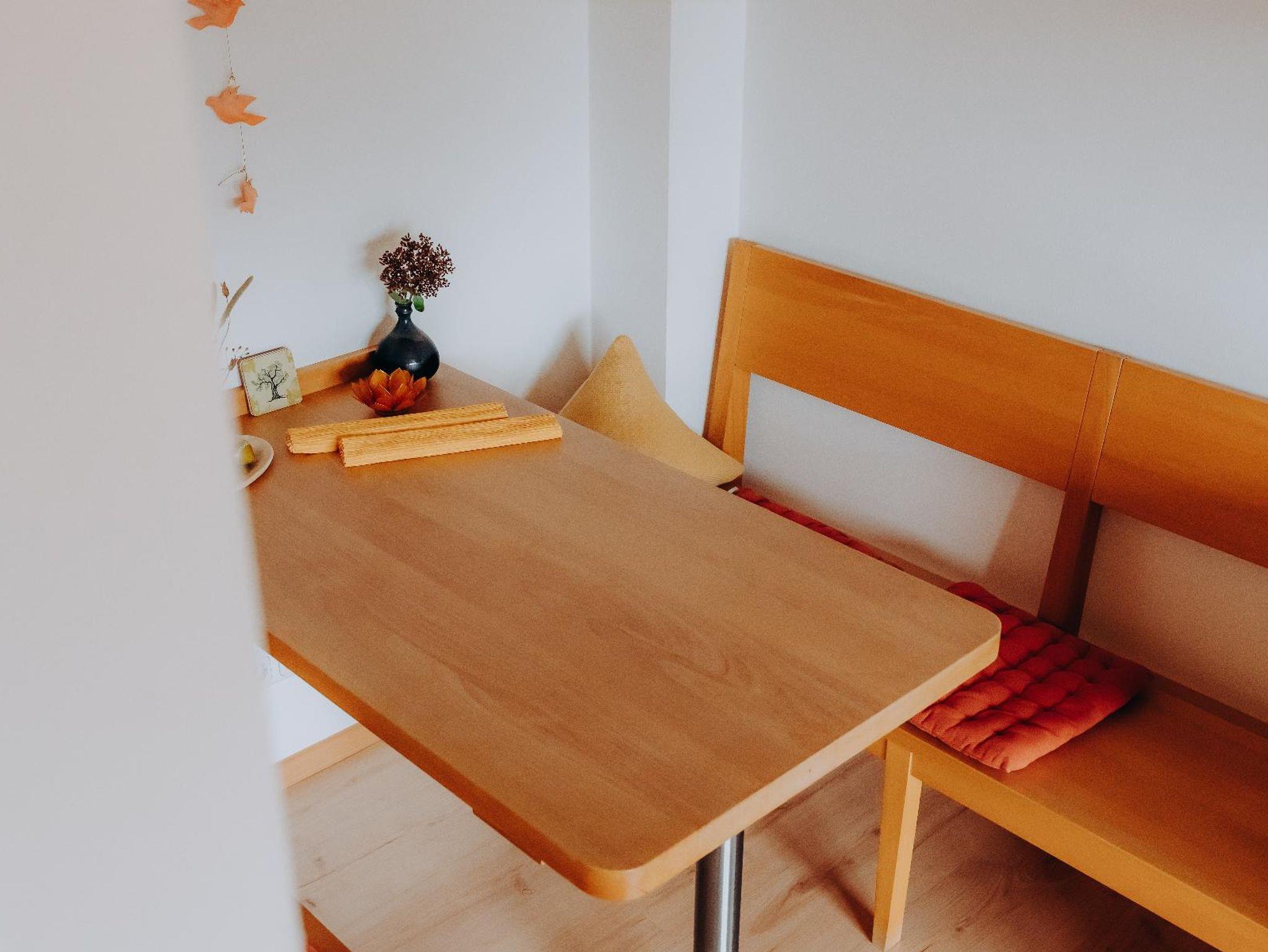 Ferienwohnung Nr. 2 im 1. Stock (42 qm) mit großen Balkon mit Liegestuhl und Sitzgruppe, und einem kleineren Balkon. Appartement ist open-plan gestaltet und hat hochwertigen Wineo- Bioboden. Voll ausgestattete Küchenzeile mit Wasserkocher und Filterkaffeemaschine. Schreinergefertigte Essecke.