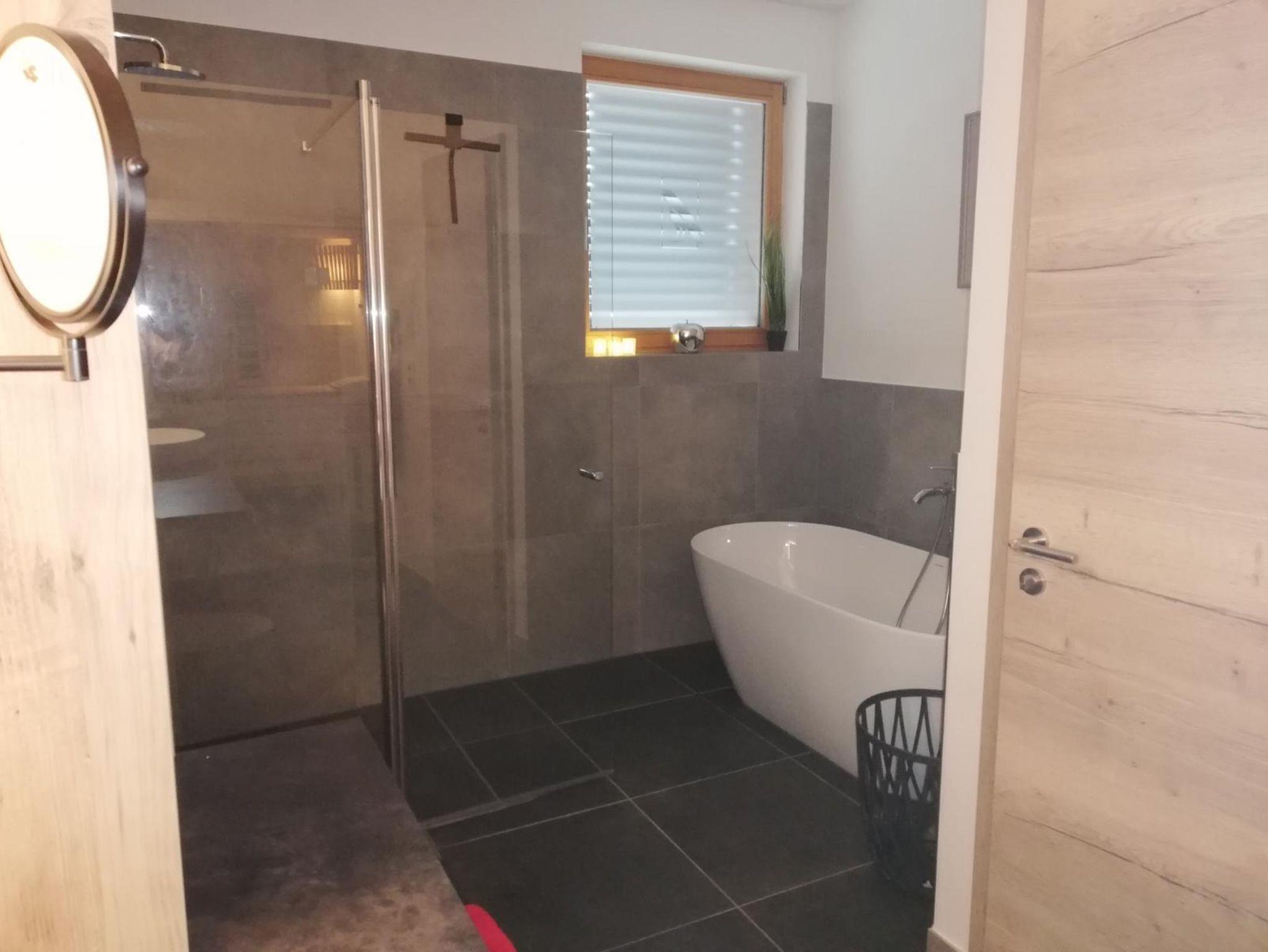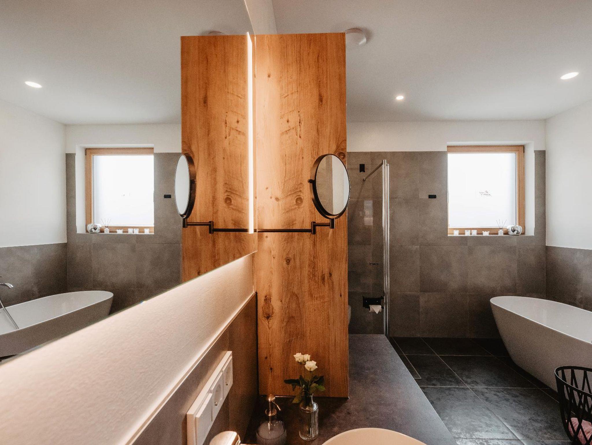 Das großzügige Master-Bad mit steuerbarer Wellness-Ambiente-Beleuchtung, freistehender Badewanne, Walk-in-Regendusche, Einbauradio mit Bluetooth-Funktion und finnischer Sauna mit Infrarot-Bereich ist Ihre private Wellness-Oase!