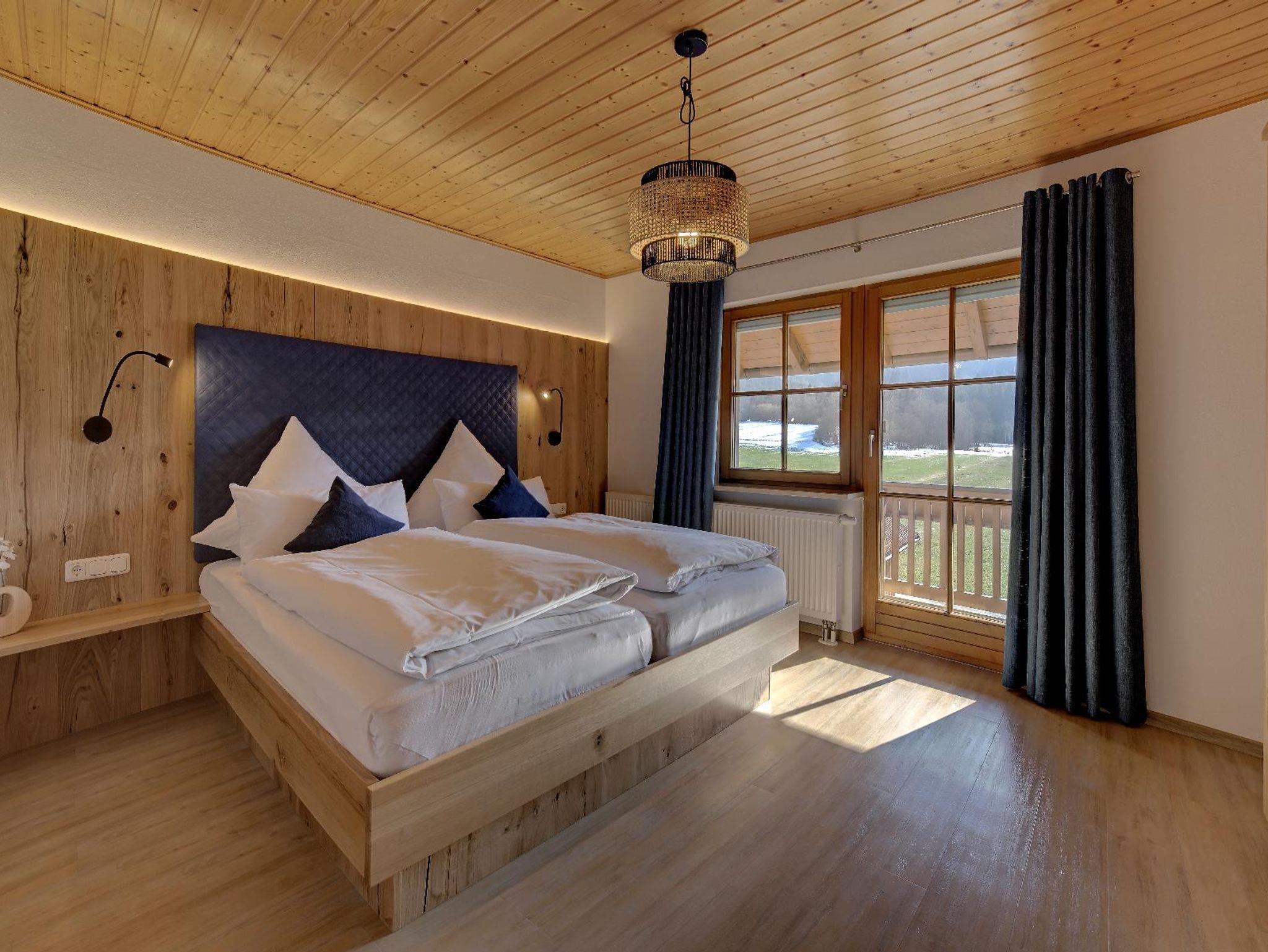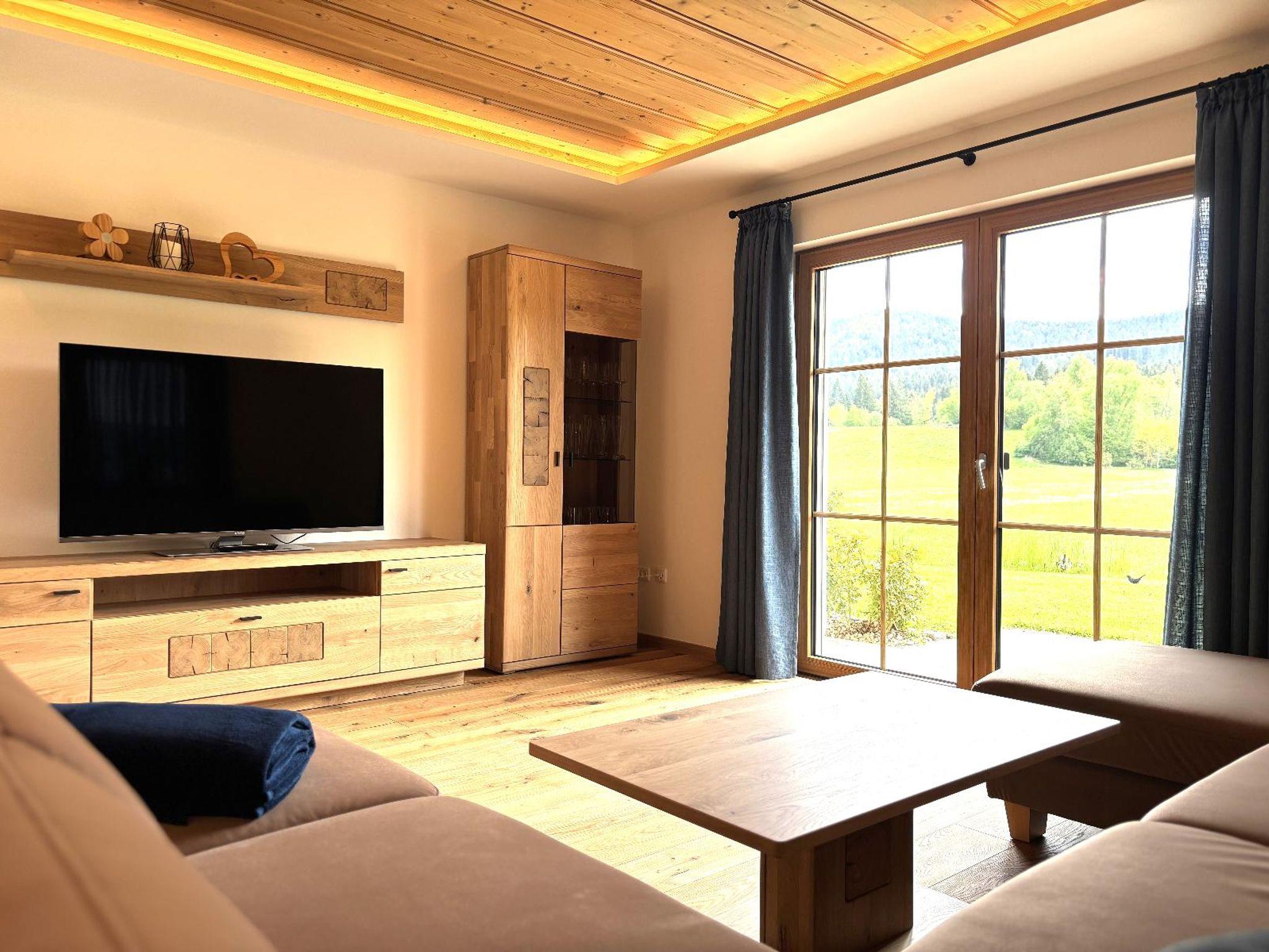 Unsere geschmackvoll eingerichtete Zweiraumwohnung bietet auf ca. 42 m² Platz für 2–3 Personen. Sie befindet sich im 1. Stock und verfügt über einen Südbalkon mit Tisch, Stühlen, Balkonliegen, Wäscheständer sowie Weber-Elektrogrill, von dem aus Sie einen traumhaften Blick auf Wald und Wiesen genießen können. Die Wohnung ist in Wohn- und Schlafraum getrennt. Das Schlafzimmer ist mit einem Doppelbett, Safe sowie Dusche und WC ausgestattet, Handtücher und ein Föhn sind vorhanden. Auf Wunsch stellen wir Ihnen gerne ein Zustellbett, ein Babyreisebett inklusive bezogenem Bettzeug, einen Hochstuhl oder einen Rausfallschutz zur Verfügung. Bettwäsche, Handtücher, Badetücher und Geschirrtücher sind inklusive. Die gemütliche Wohnküche ist bestens ausgestattet und bietet eine bequeme Couch, einen großen Flachbild-SAT-TV, Internetradio, WLAN, einen Esstisch sowie eine moderne Küchenzeile mit Geschirrspüler, Herd mit vier Kochplatten und Backofen, Kühlschrank mit Gefrierfach, Kaffeevollautomat oder Filterkaffeemaschine, Wasserkocher und Toaster. Zusätzlich steht Ihnen ein zweites Bad mit Dusche und WC zur Verfügung. Ein Parkplatz befindet sich direkt am Haus, außerdem gibt es Abstellmöglichkeiten für Fahrräder und Ski. Für einen entspannten Start in den Tag bieten wir liebevoll zusammengestellte Frühstückskörbe, Frühstück in unserer nahegelegenen Pension oder einen bequemen Semmel-Service an. Unser Wellnessbereich im Haupthaus erhält derzeit ein neues Make-Over; ab Juni erwarten Sie eine finnische Sauna, ein Jacuzzi für bis zu vier Personen sowie Schwebeliegen. Nach Eintrag in die Belegungsliste steht Ihnen der Wellnessbereich stundenweise exklusiv gegen eine kleine Gebühr zur Verfügung. Bitte beachten Sie, dass Onlinebuchungen Gebühren enthalten.