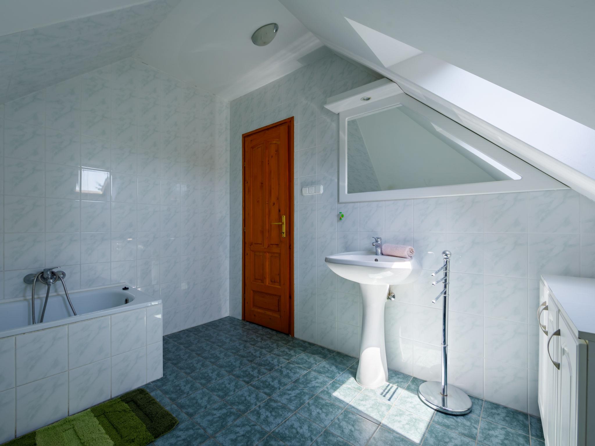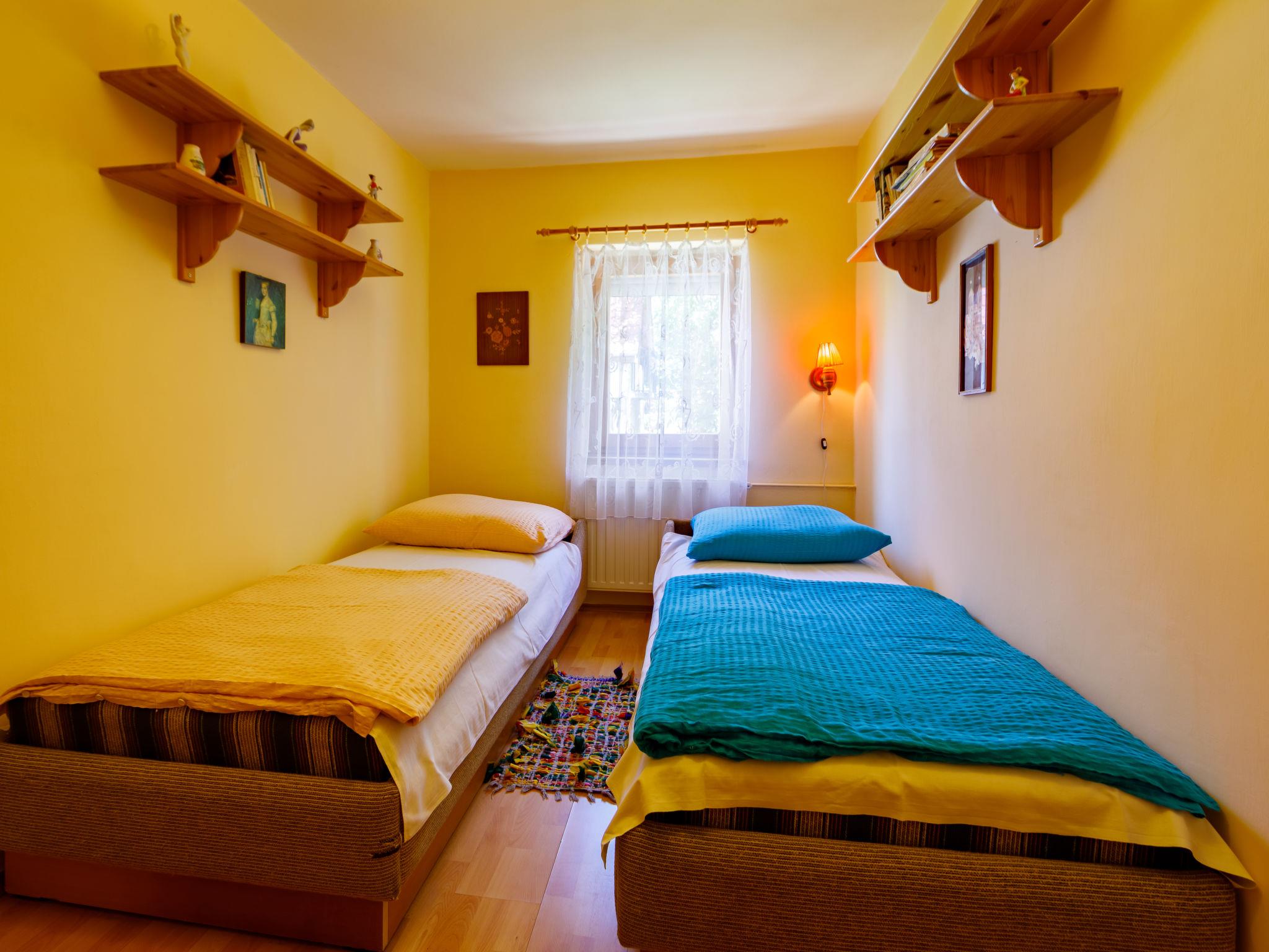 5-room house 130 m2 on 3 levels. Partly with sloping ceilings, comfortable furnishings: living room with TV and air conditioning. 1 room with 2 beds (90 cm, length 200 cm), 1 pull-out bed. 1 room with 1 french bed (160 cm, length 200 cm). Shower, sep. WC. No heating option. On the lower ground floor: dining room. Kitchen (4 hot plates, oven, kettle, microwave, freezer, electric coffee machine). Upper floor: 2 rooms, each room with 1 french bed (180 cm, length 200 cm), TV. Bath/WC. Terrace 10 m2, patio. Terrace furniture, barbecue. Facilities: Internet (WiFi, free). Parking (fenced 2 cars). Maximum 2 pets/ dogs allowed. Please note that the kitchen and dining room are accessible via an external staircase.