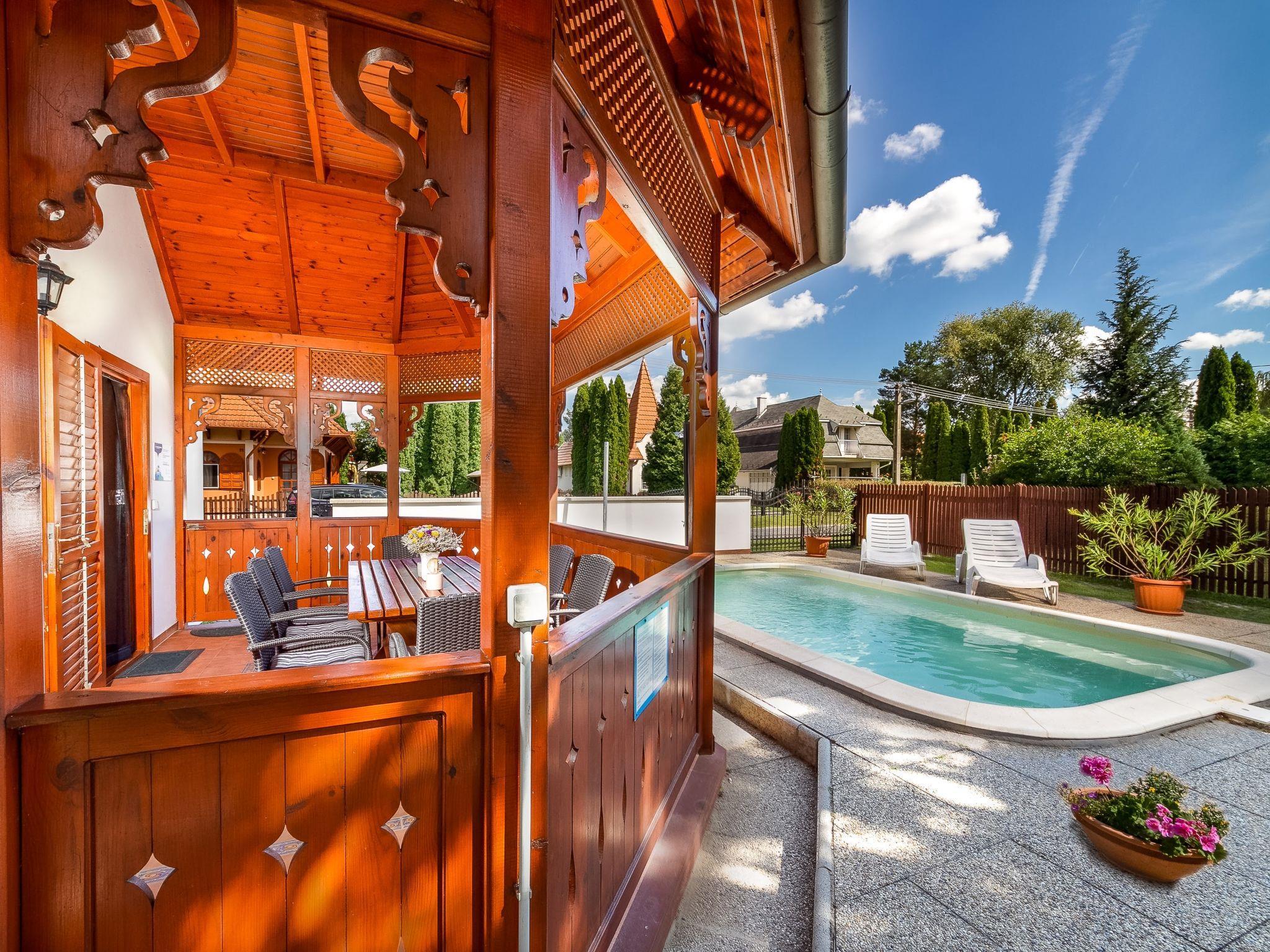 Balatonberény: Beautiful, cosy semi-detached house "Ruby 1", built in 1999, renovated in 2005. On the outskirts, 250 m from the lake. Private: well-kept garden 200 m2 (fenced), lawn for sunbathing, swimming pool angular (12 m2, depth 90 cm, seasonal availability: 15.May. and 15.Sep.) with internal staircase. Outdoor shower. In the house: WiFi, air conditioning. Available: bicycles (2). Grocery, restaurant 300 m, outdoor swimming pool 250 m, public bathing area 1.2 km. Please note: fishing [permit required].