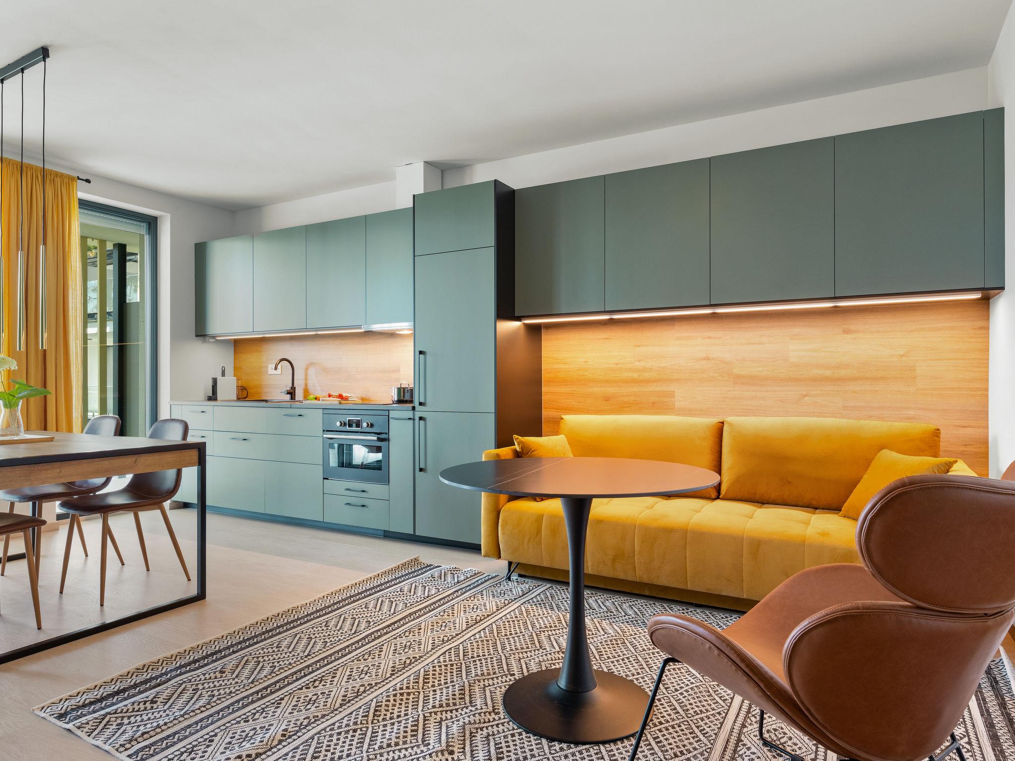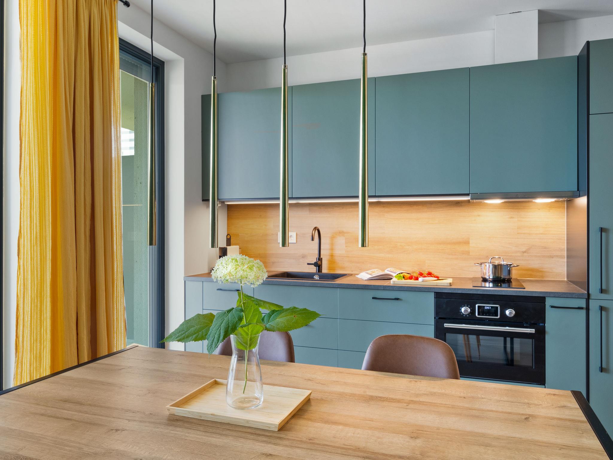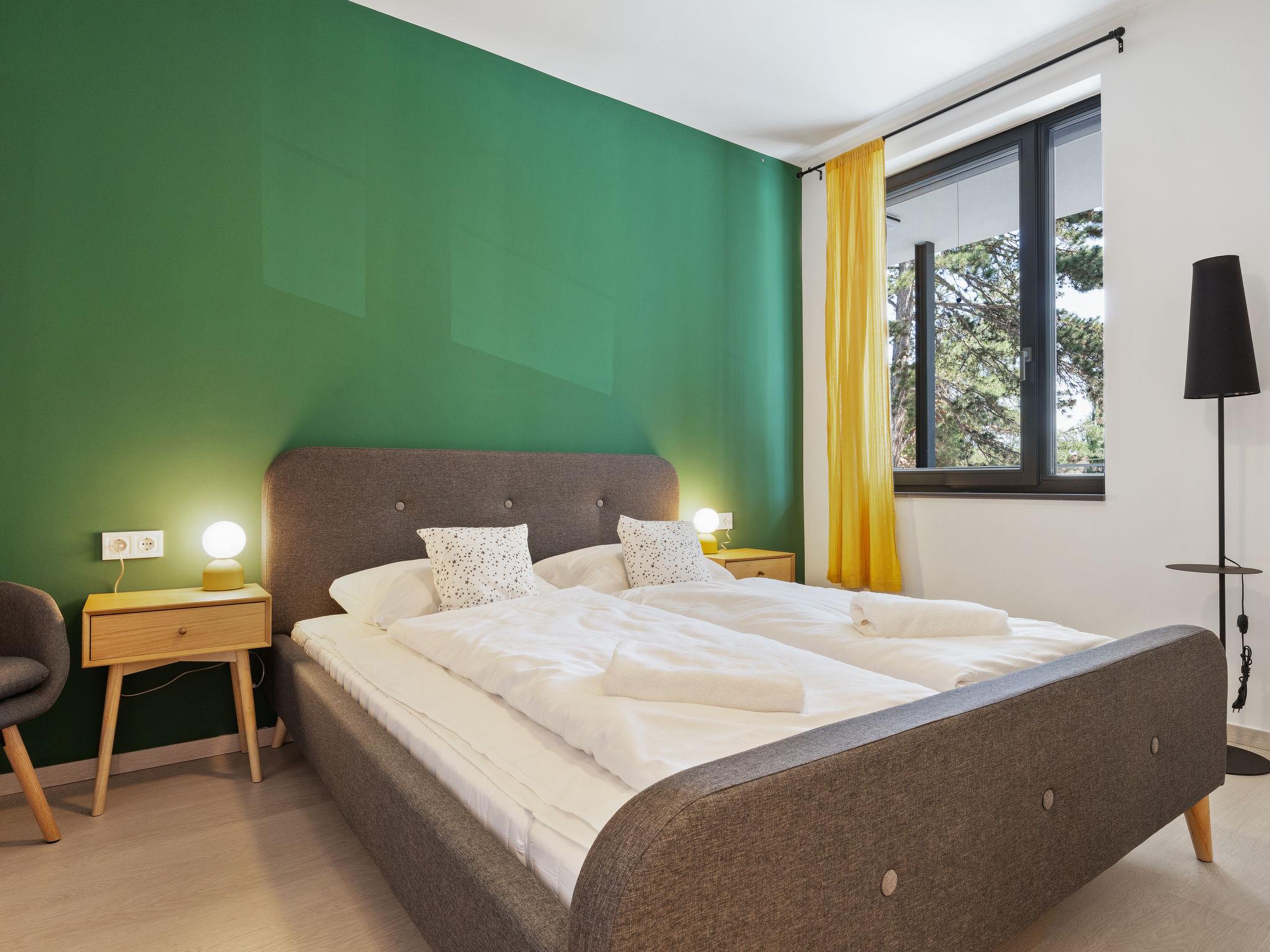 "Marina Lelle", 3-room apartment on 1st floor. Modern and stylish furnishings: open living/dining room with dining table, cable TV and international TV channels (flat screen), air conditioning. Exit to the balcony, north-west facing position. 2 double bedrooms, each room with 1 french bed (160 cm, length 200 cm), air conditioning. Exit south-east facing position. Balcony furniture, covered balcony. View of the swimming pool and the garden. Facilities: washing machine, mosquito net, children's high chair, baby cot (extra). Internet (WiFi). Parking space n 16 (fenced). Please note: non-smoking house. EG21000354