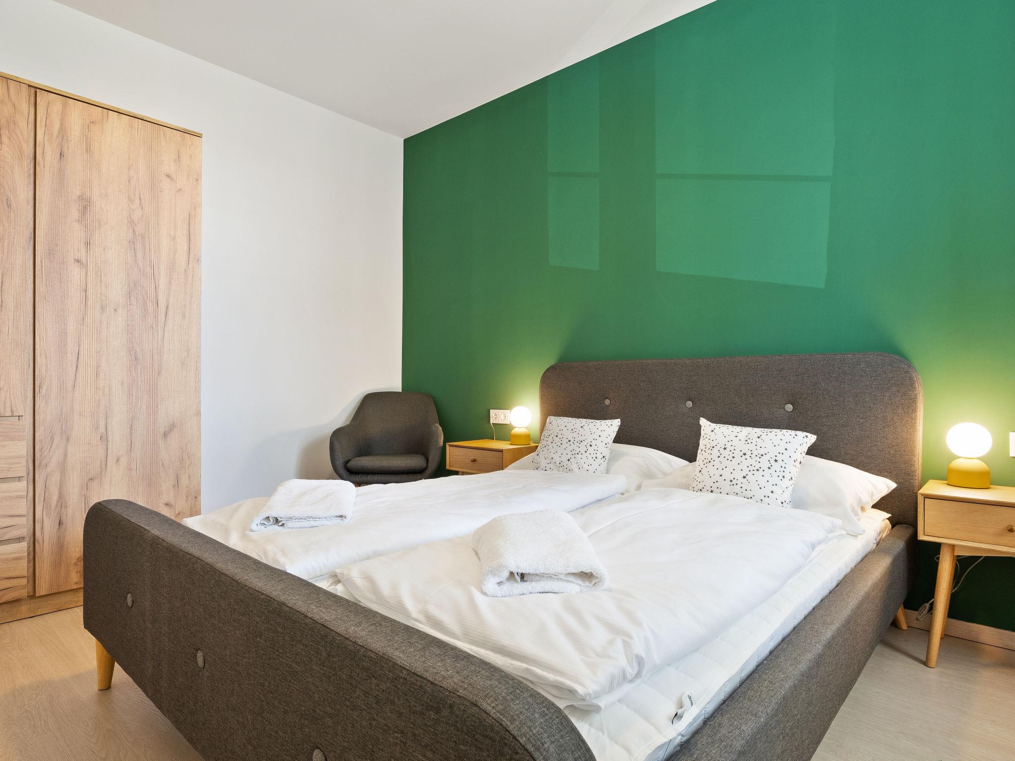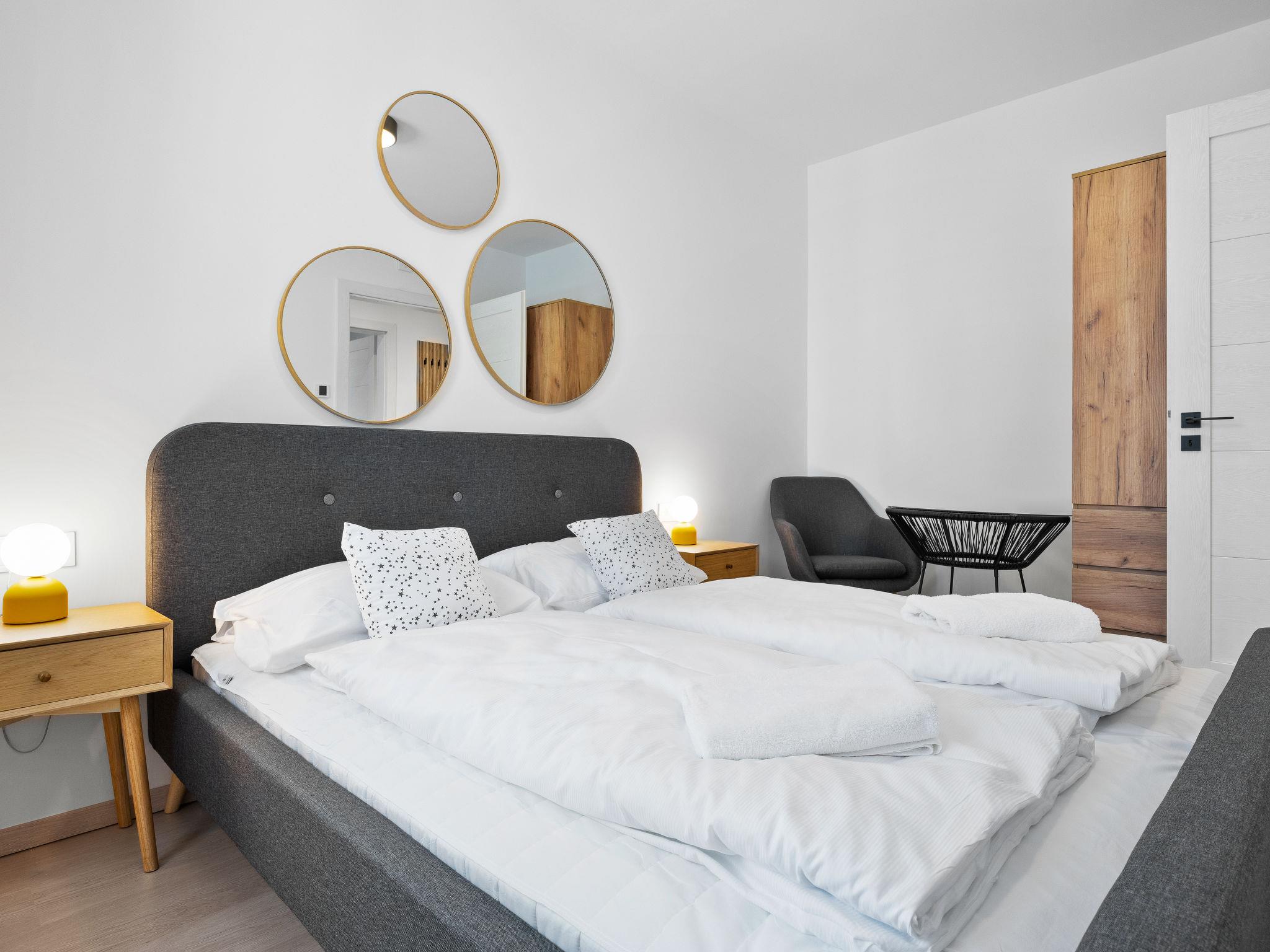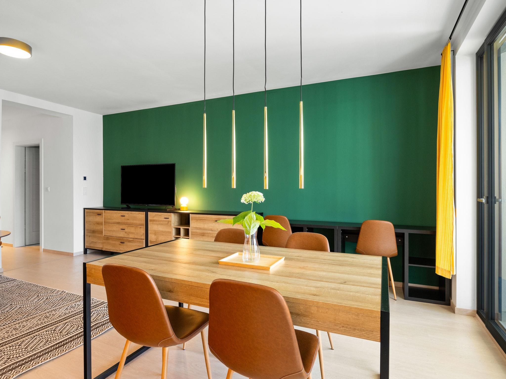 "Marina Lelle", 3-room apartment on 1st floor. Modern and stylish furnishings: open living/dining room with dining table, cable TV and international TV channels (flat screen), air conditioning. Exit to the balcony, north-west facing position. 2 double bedrooms, each room with 1 french bed (160 cm, length 200 cm), air conditioning. Exit south-east facing position. Balcony furniture, covered balcony. View of the swimming pool and the garden. Facilities: washing machine, mosquito net, children's high chair, baby cot (extra). Internet (WiFi). Parking space n 16 (fenced). Please note: non-smoking house. EG21000354