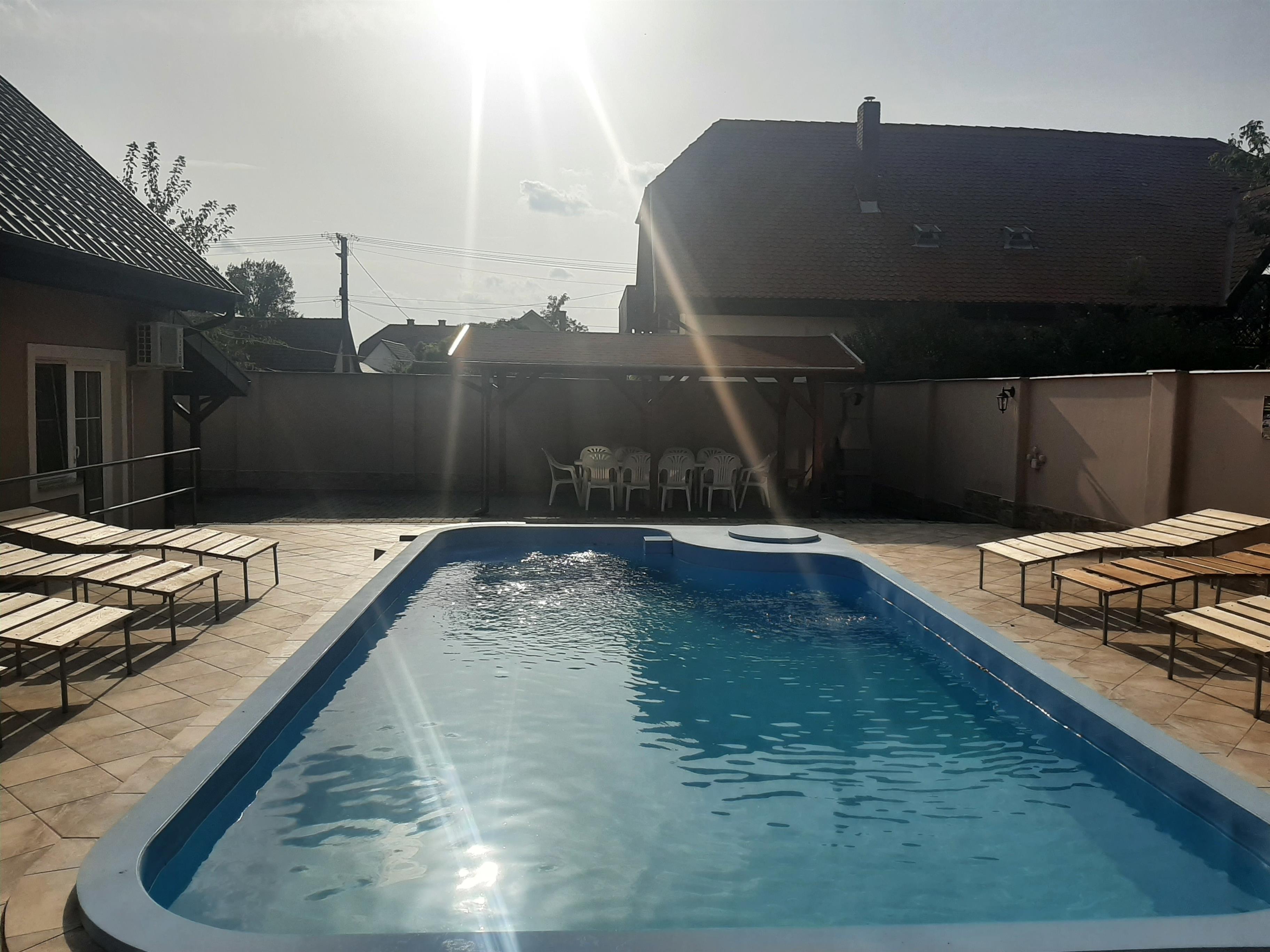Hinter dem Haus gibt es ein Pool Mitbenutzung (nicht zur alleinigen Nutzung) mit Sonnenbetten, für die Gäste,Die sich durch den Urlaub ausruhen möchten.Neben dem Pool befindet sich ein bedecktes Pavillion,unter dem die Urlauber grillen und Zeit verbringen können.