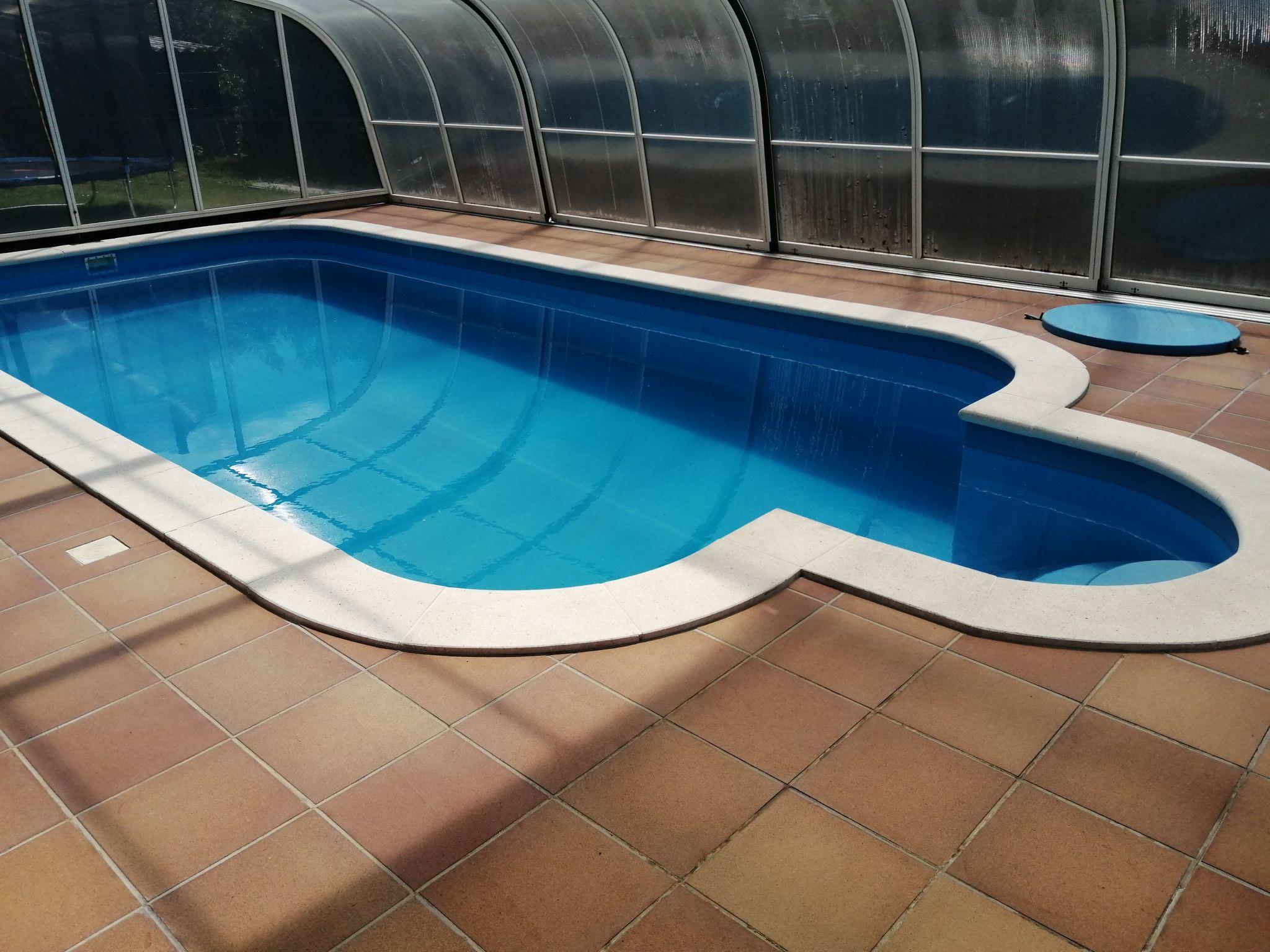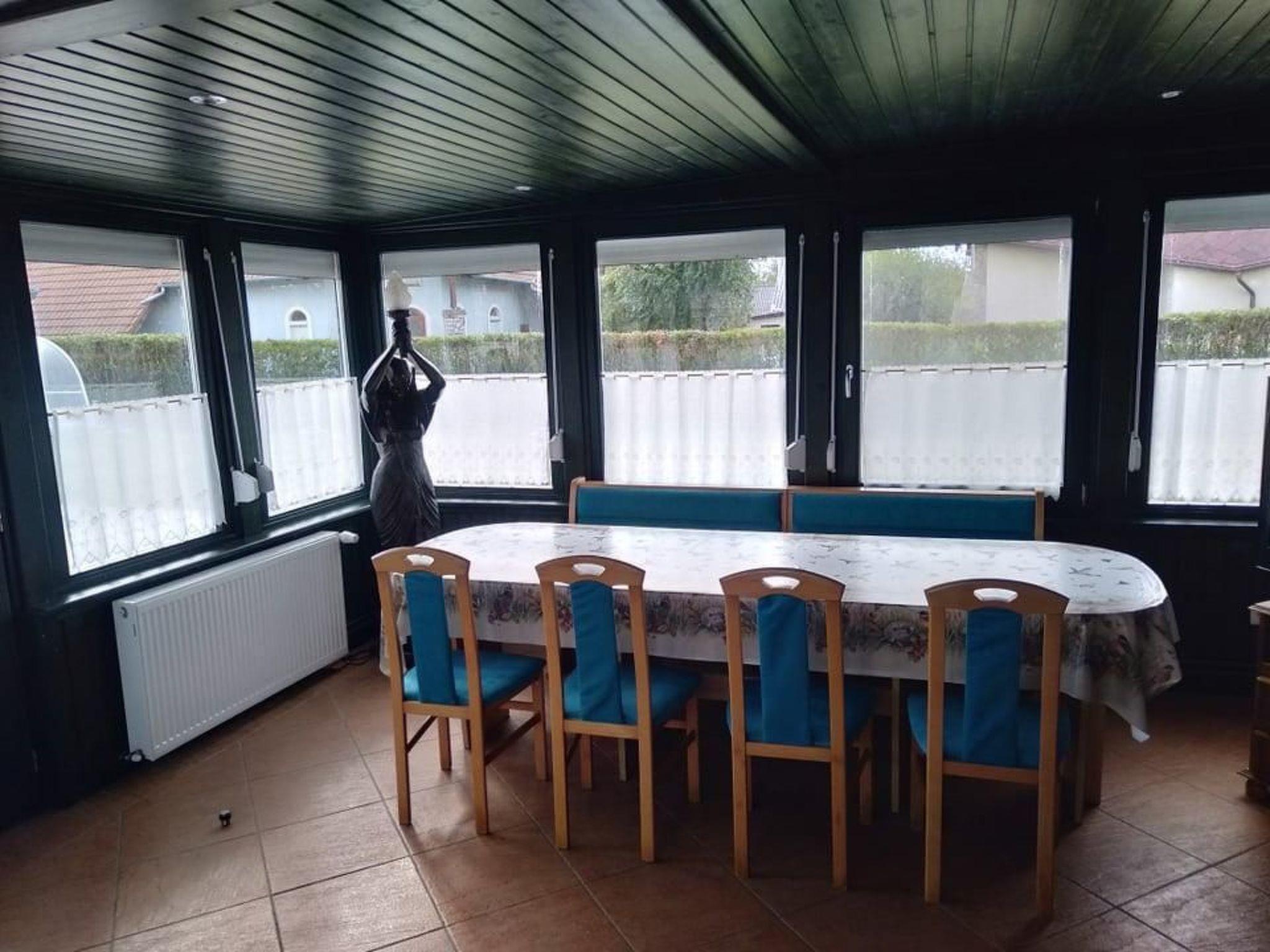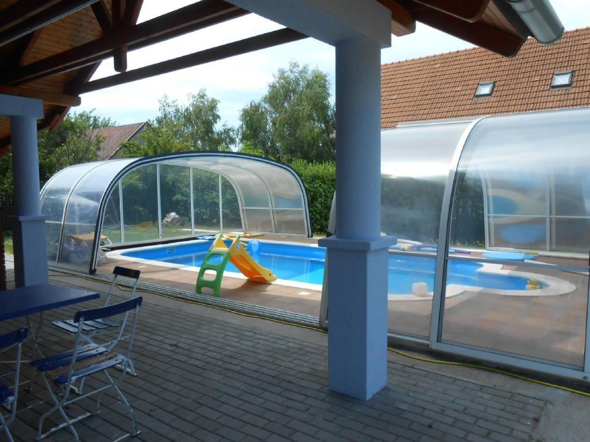 The holiday home with pool is in Balatonmariafürdö on the south shore about 28 km to the thermal spa Heviz is for your exclusive use.the house is surrounded by a 700 square metre, enclosed garden plot with a partial hedge and completely surrounded by a fenceThe entire property is equipped with surveillance cameras.the covered outdoor pool makes swimming possible even outside the main season with pleasant temperatures. In bad weather, the roof remains closed and you can bathe in the warm pool water. Pool dimensions 7.00 x 3.25 x 1.50 Pool maintenance and service is provided by the landlord, who lives in the neighbouring building (separated by a fence and house wall) and will be happy to help you with any questions. Pool open continuously from the beginning of May to the end of September Garden equipment: garden tables, garden chairs, parasols, sun loungers and barbecue area in the covered garden pavilion electronic darts (please bring your own darts) There are also several secure parking spaces in the property (outdoor area). The house is designed for up to 8 people, has 130 square metres of living space and has 2 floors. Ground floor: Winter garden with large sofa bed, coffee table, large seating area for 8 people, German language satellite TV, DVD and small portable stereo system (roller blinds). Kitchen: A very modern kitchen with dishwasher, 4 burner gas hob, electric oven, extractor bonnet, 160 litre fridge (with 3 ice compartments), microwave, coffee machine, toaster and kettle. Sitting area for 8 people Please bring your own tea towels. Bathroom: Very nice bathroom, bathtub with shower function (no whirlpool), washbasin and WC, with some daylight. Wardrobe, storage space, air conditioning and a bedroom with tiled stove and queen-size bed, 1 air conditioning for the entire lower area.upper floor: bathroom: washbasin, shower and WC with daylight1 bedroom (queen-size bed) with air conditioning and1 bedroom with king-size bed and balcony (pool view) with air conditioning German satellite TV and DVD player in every room.shopping facilities approx. 250 m restaurant 250 m beach playground 250 m lake 300 m railway station Szölötelep Balatonmariafürdö 100 m railway line approx. 40 m away. Before and after season arrival and departure as desired in the high season the arrival and departure is on Saturdays electricity costs per day final cleaning once on departure tourist tax per person from 18 years per night, pets are also welcome for an extra charge per animal and dayWashing machine for a fee per washShort descriptionOther : Non smoking houseShort description 1Number of kitchens : 1Living room 1Other living room equipment:Bedroom 1Other bedroom facilities: Air conditioning for the entire ground floorBedroom 2Other bedroom facilities: Air conditioningBedroom 3Other bedroom facilities: Air conditioning and balconyThe living room is the conservatoryOther living room facilities: Pull-out sofa bed, wardrobe, coffee table, table with bench and chairs, fridge freezerEnvironmentLoan facilities: Bicycle hire and car hirePossible sports in the area: Hunting, cycling, surfingSurroundings 1Opportunities for excursions: BicycleGarden and outdoor facilitiesRecreational facilities at the property: Outdoor pool for private use, Swimming poolGarden equipment: Garden furniture available, Barbecue, PavilionElectronic darts (please bring your own darts)Services 1Other: Intermediate cleaning for a fee at the guest's request
