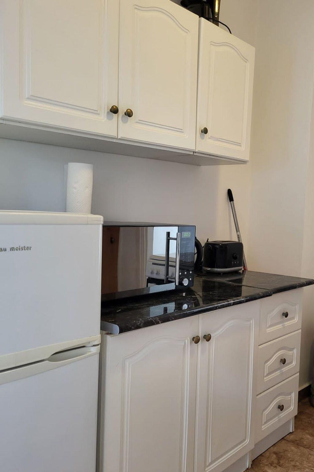 The part of the flat on the ground floor has a size of approx. 20 square metres and has a kitchen with a 2-burner gas hob, fridge, dishwasher, microwave, coffee machine and kettle. There is also a dining area and a bathroom with shower and WC.