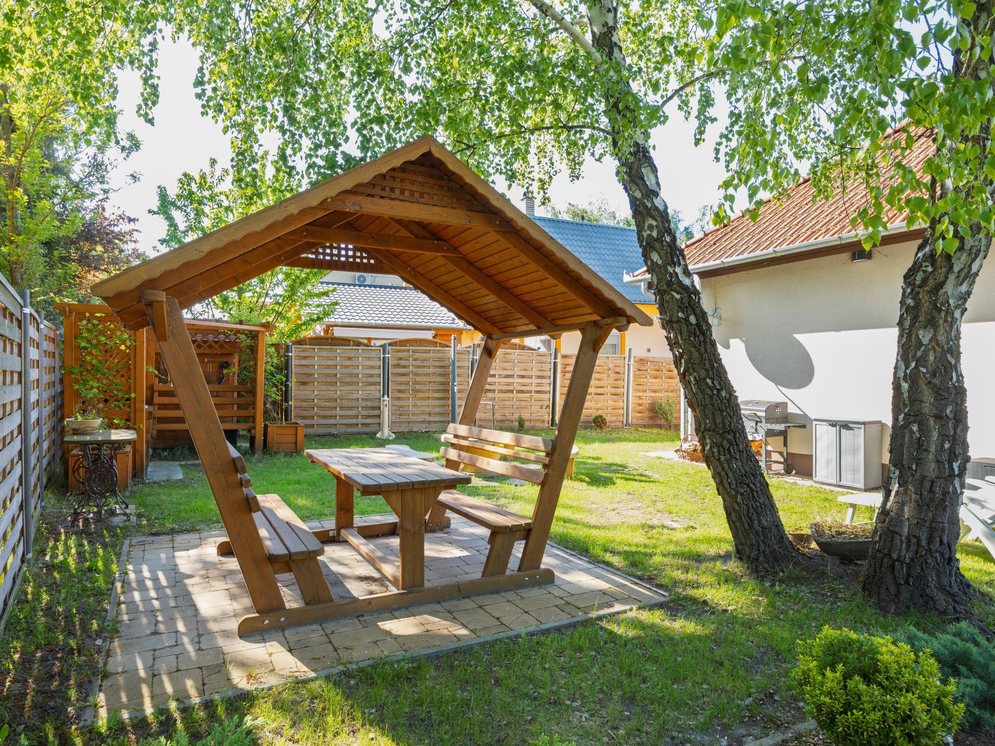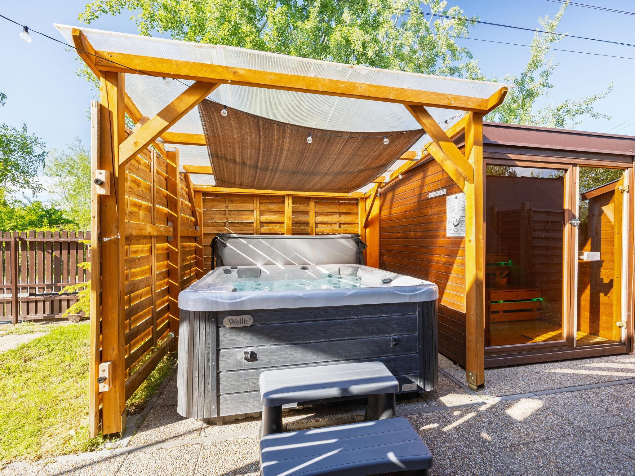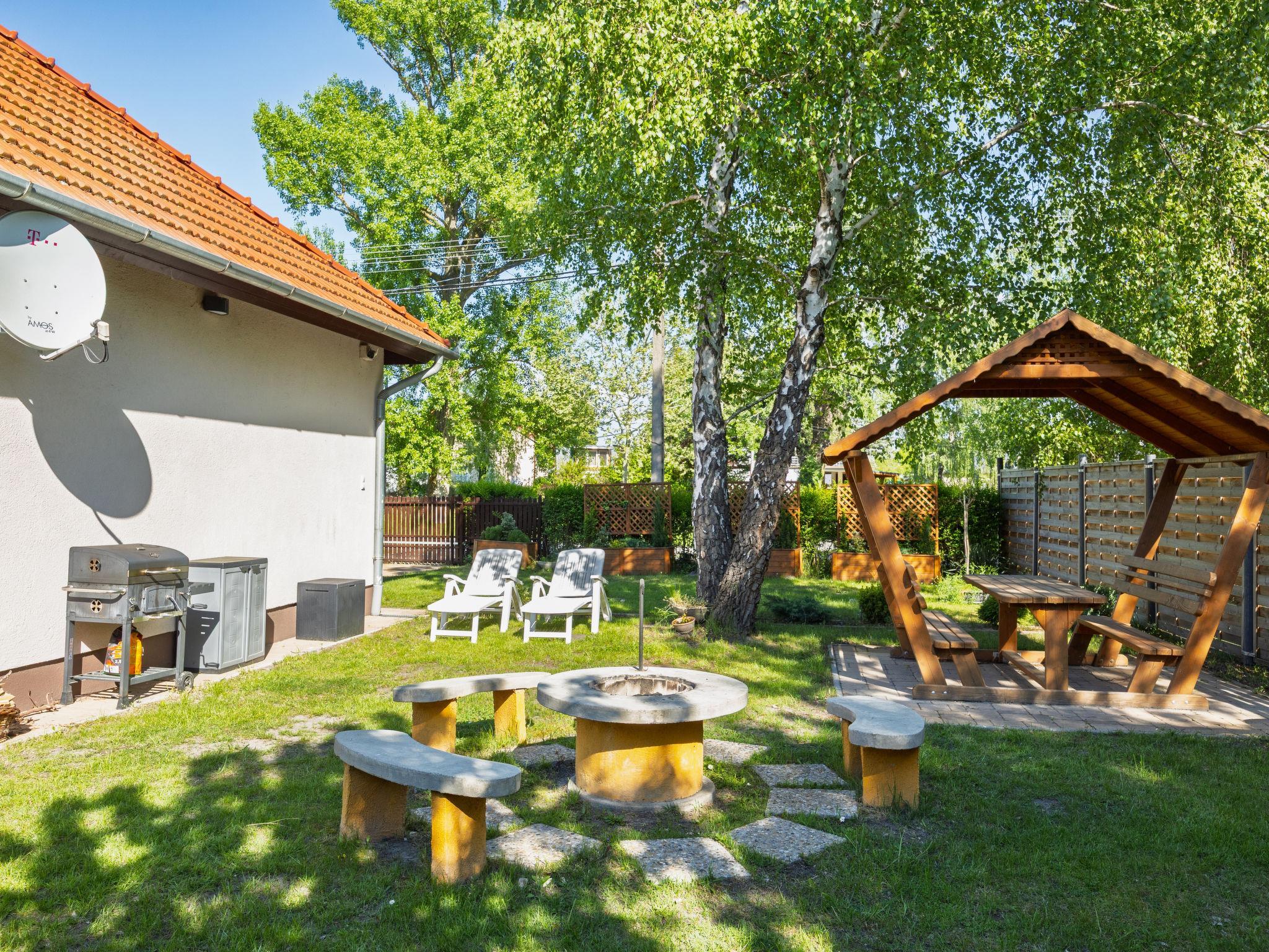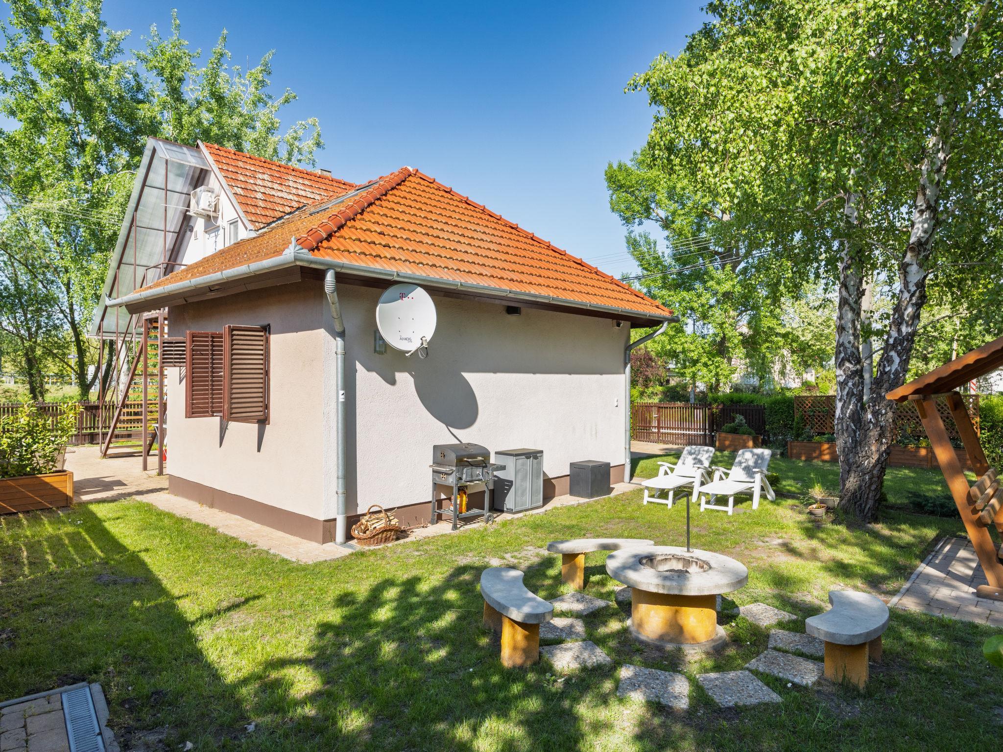 Balatonmáriafürdo 21 km from Balatonfenyves: Modern, comfortable house "Iris", 2 storeys in 2024. In the resort, 150 m from the lake, 100 m from the beach. For shared use: hot tub. Private: property (fenced), garden with lawn and trees. Outdoor shower, barbecue, fireplace. In the house: WiFi, air conditioning. Parking (for 2 cars). Grocery 160 m, restaurant 130 m, railway station "Máriaszolotelep" 160 m, thermal baths "Igal" 69 km. Tennis 4 km, riding stable 6 km, cycle lane 100 m, children's playground 1 km. Nearby attractions: Kis-Balaton Visitor Center 16 km, Hévíz Thermal Bath 28 km, Keszthely Giant Wheel 22 km, Festetics Castle 23 km, Kristinus Wine Estate 11 km, Zalacsány Adventure Park 34 km. Please note: railway line closeby.