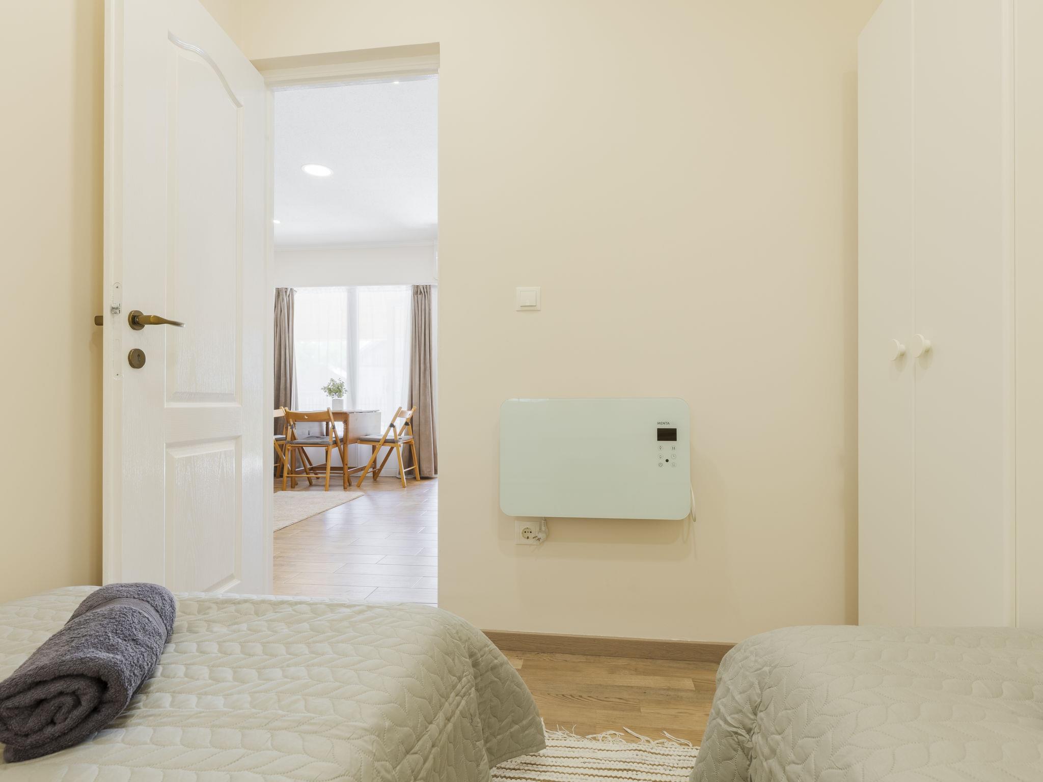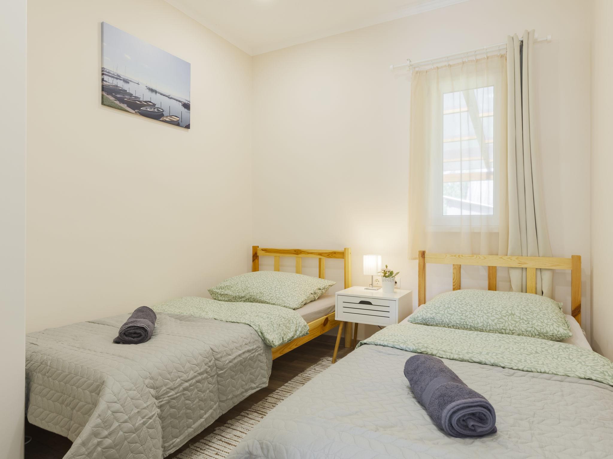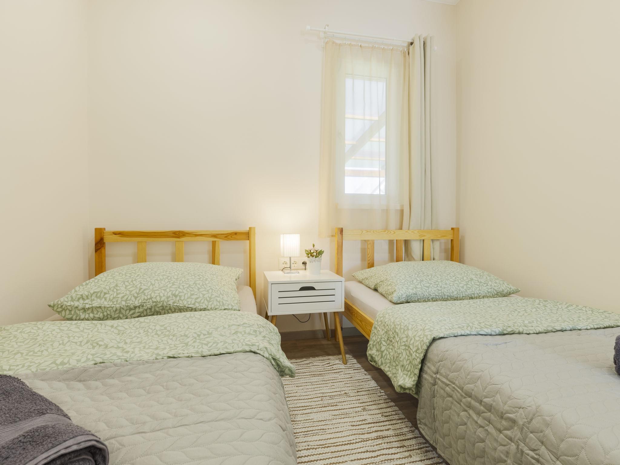 3-room semi-detached house. Comfortable and cosy furnishings: open living/dining room with dining table, kitchen corner, digital TV and air conditioning. Exit to the terrace. 1 double bedroom with 1 french bed (140 cm, length 200 cm). 1 room with 2 beds (90 cm, length 200 cm). Open kitchen (2 induction hot plates, toaster, kettle, microwave, electric coffee machine). Shower/WC. Electric heating, air-conditioning. Terrace furniture, deck chairs. Facilities: mosquito net. Internet (WiFi). Parking (fenced 2 cars).
