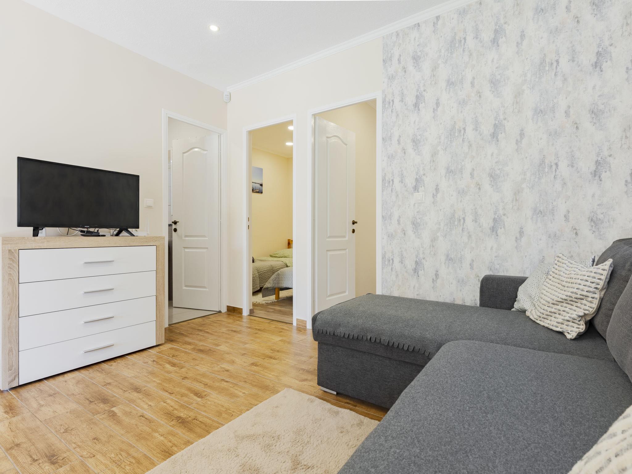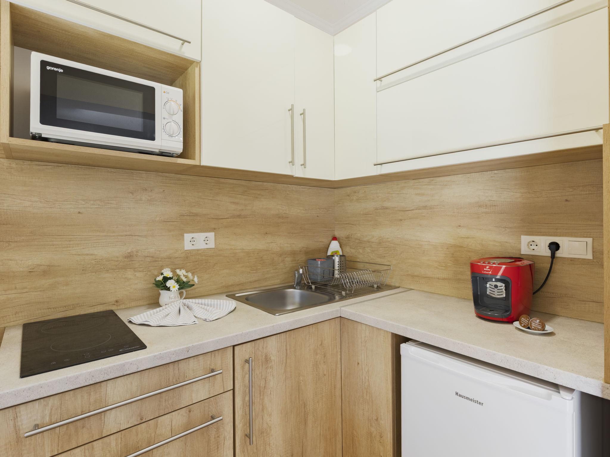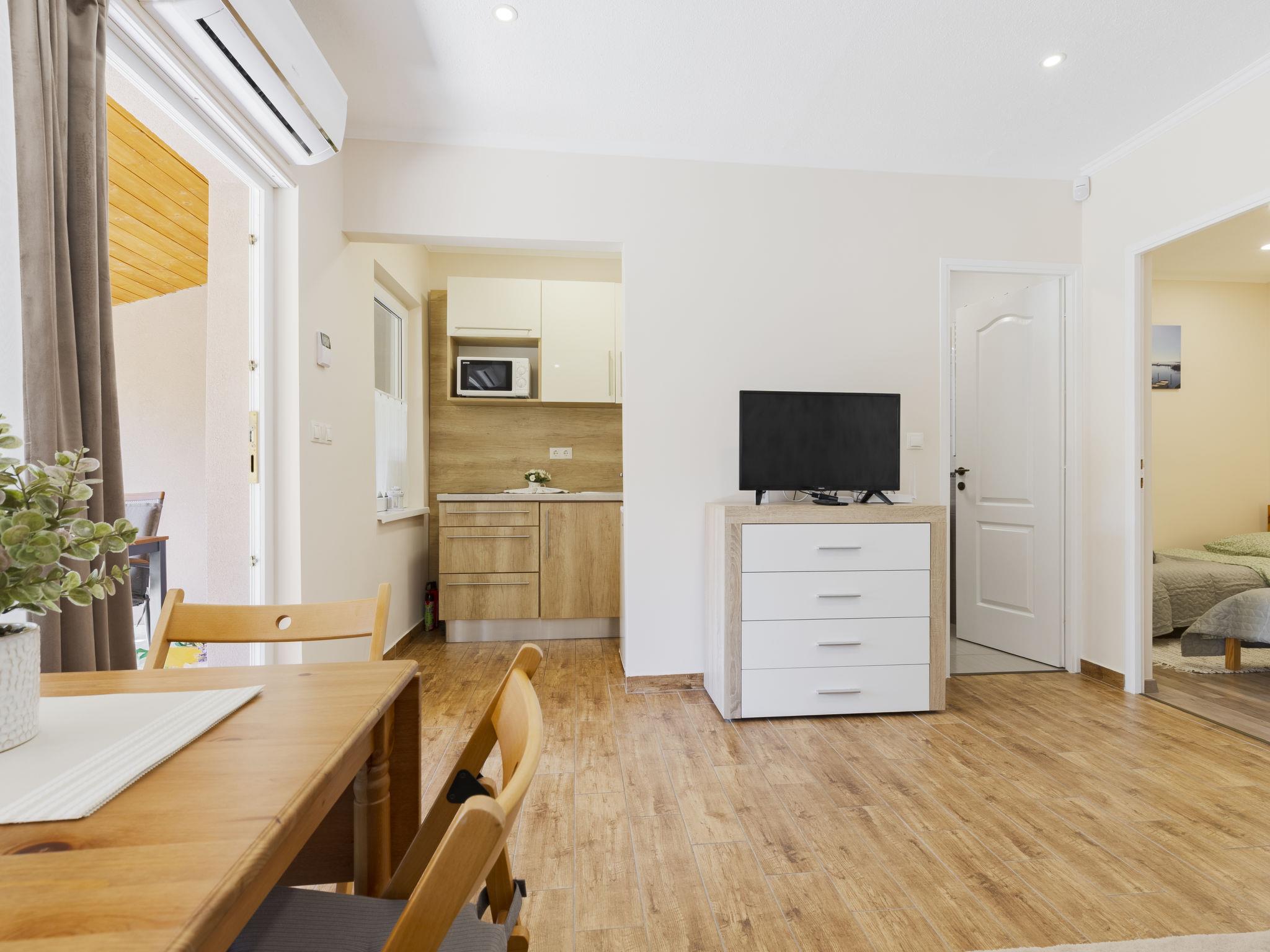 3-room semi-detached house. Comfortable and cosy furnishings: open living/dining room with dining table, kitchen corner, digital TV and air conditioning. Exit to the terrace. 1 double bedroom with 1 french bed (140 cm, length 200 cm). 1 room with 2 beds (90 cm, length 200 cm). Open kitchen (2 induction hot plates, toaster, kettle, microwave, electric coffee machine). Shower/WC. Electric heating, air-conditioning. Terrace furniture, deck chairs. Facilities: mosquito net. Internet (WiFi). Parking (fenced 2 cars).