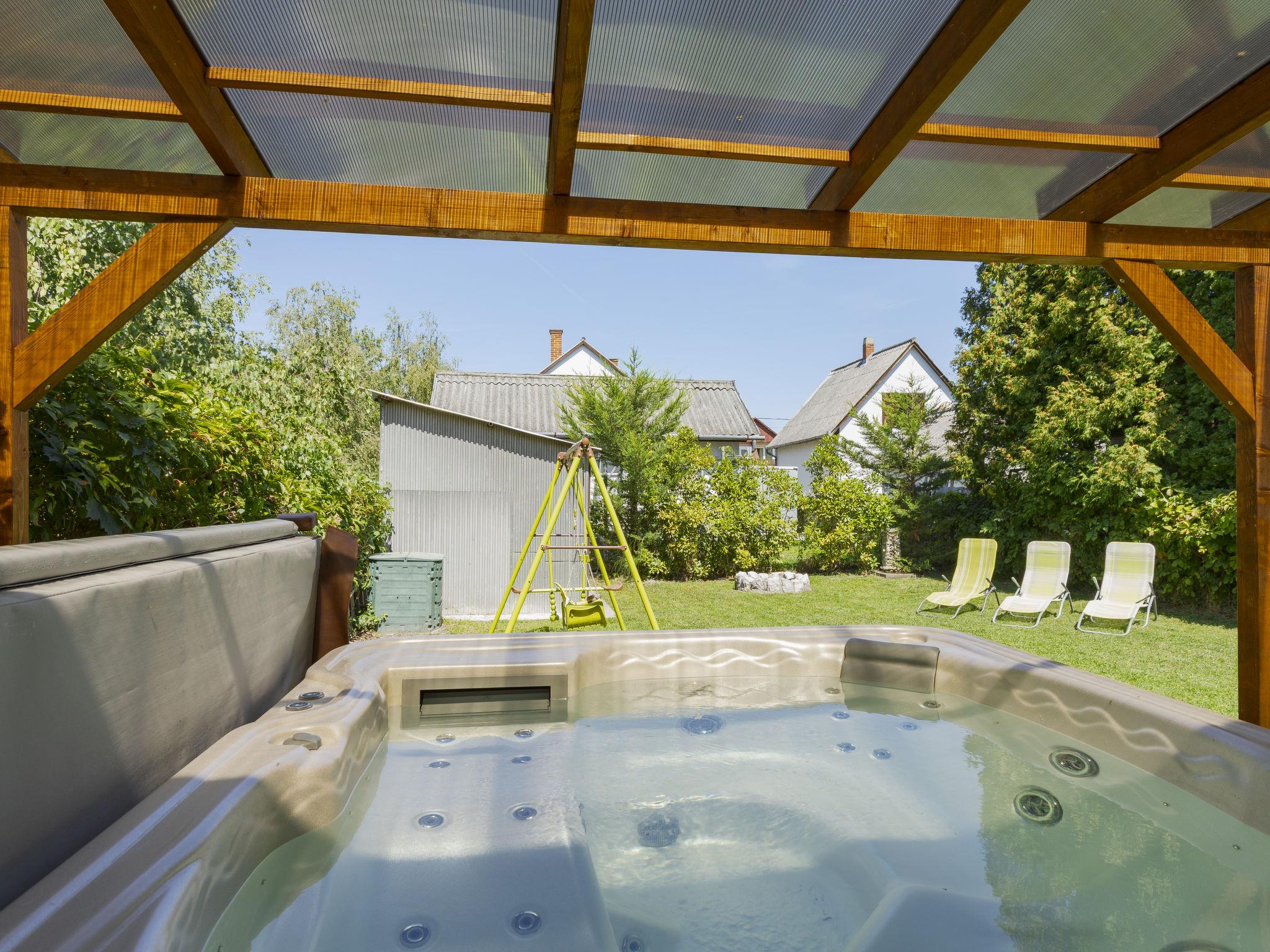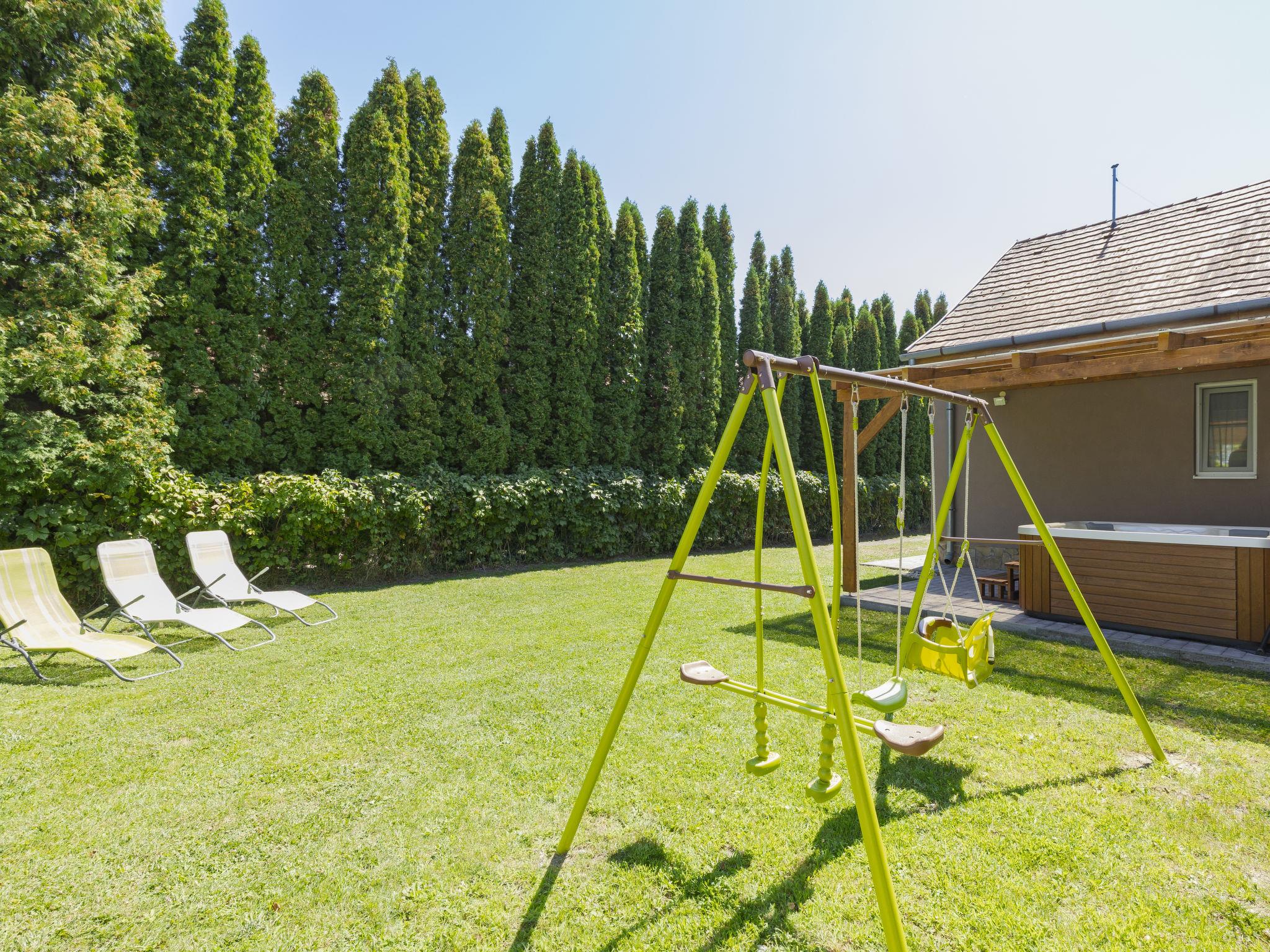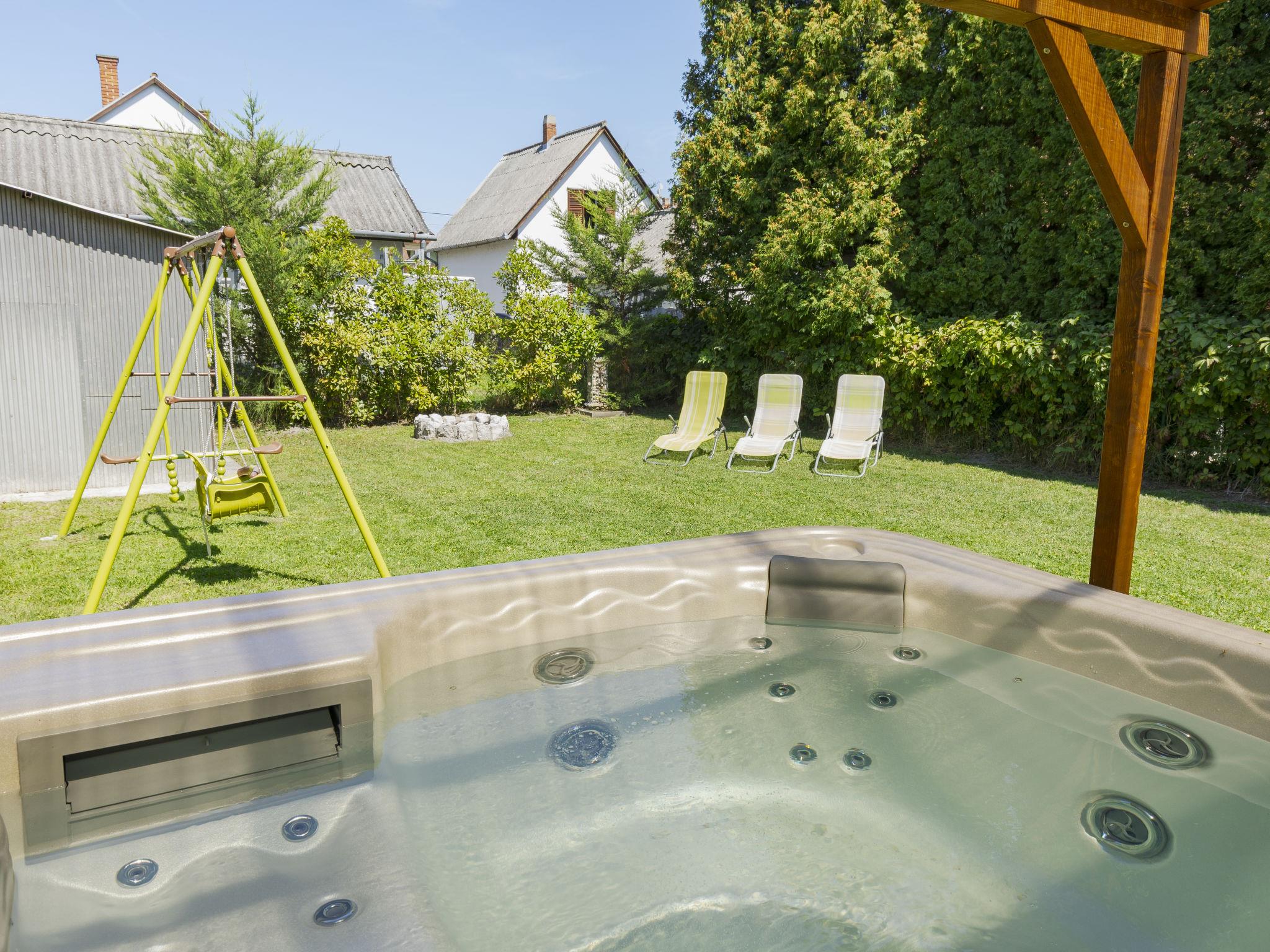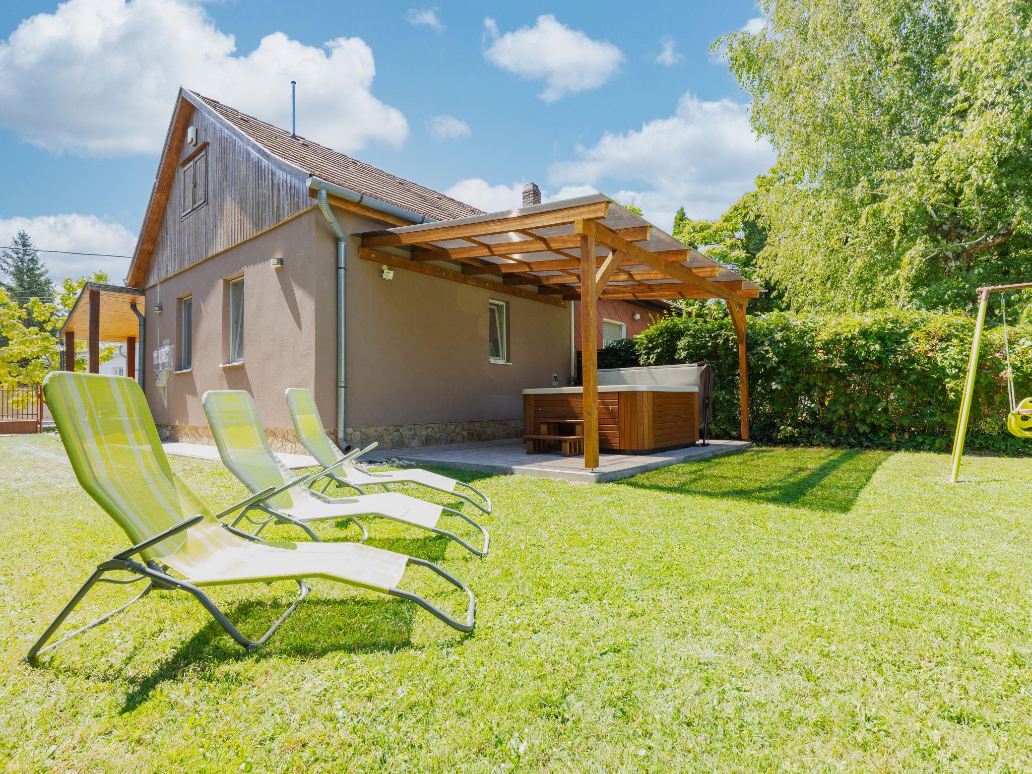 Balatonmáriafürdö 28 km from Balatonlelle: Cosy, comfortable semi-detached house "Wild Grape". In a sunny position in the residential district, 200 m from the lake, 600 m from the beach. Private: hot tub, terrace, barbecue (swing). In the house: WiFi, air conditioning. Parking (for 2 cars) on the premises. Grocery 650 m, restaurant 550 m, bicycle rental 6 km, bus stop "Balatonmáriafürdo, Bükkfa utca" 1.3 km, railway station "Balatonmáriafürdo" 2.5 km, thermal baths "Csisztafürdo" 33 km. Golf course (18 hole) 36 km, tennis 6 km, riding stable 30 km, cycle lane 200 m, children's playground 2 km. Nearby attractions: Kis-Balaton Visitor Center 14 km, Festetics Castle - Keszthely 22 km, Balatonlelle Ferris Wheel 29 km, Siófok Water Tower 62 km, Balaton Museum - Keszthely 18 km, Petting Zoo - Fenyvespuszta 29 km. Please note: railway line closeby 100 m from the property.