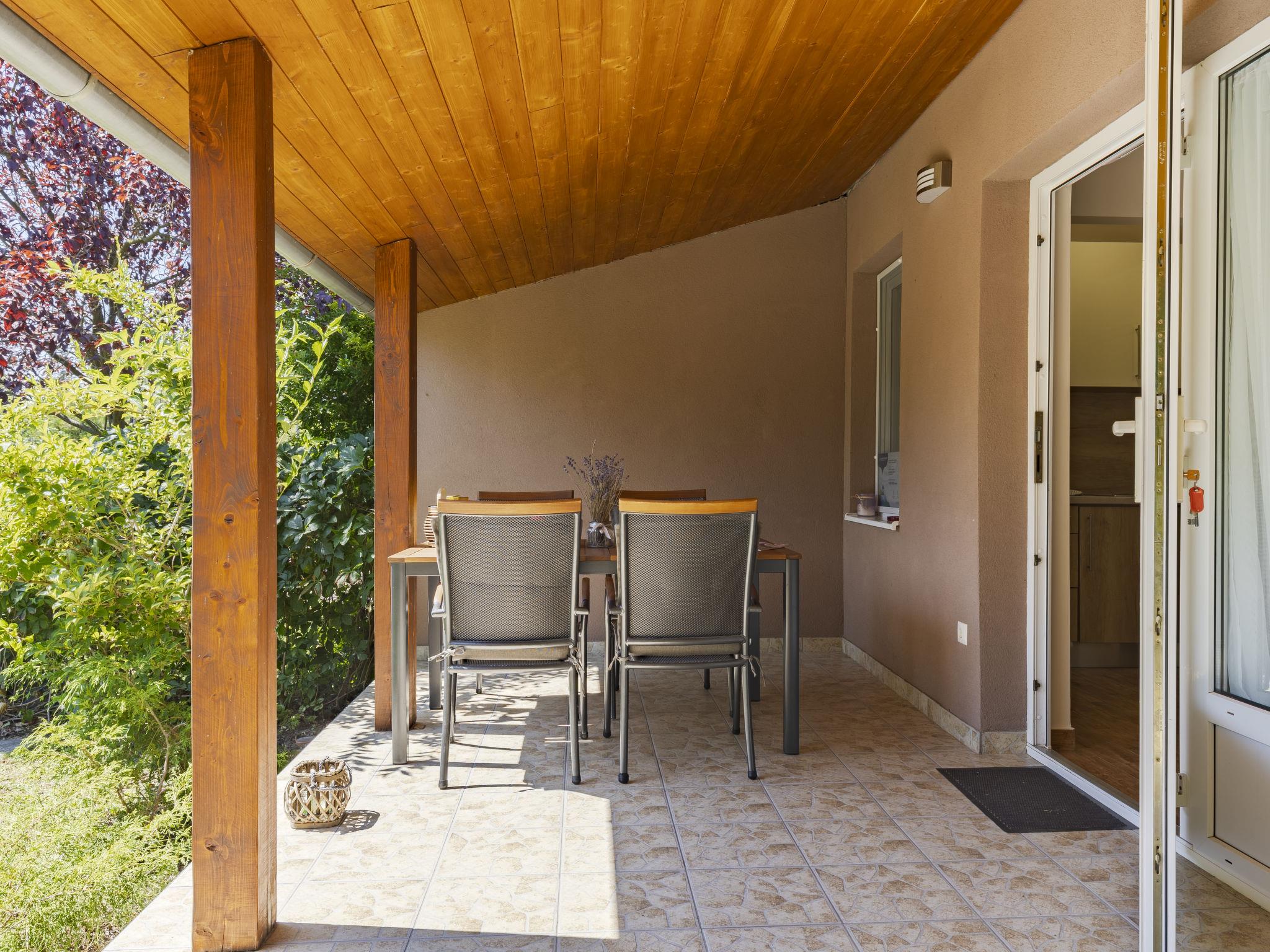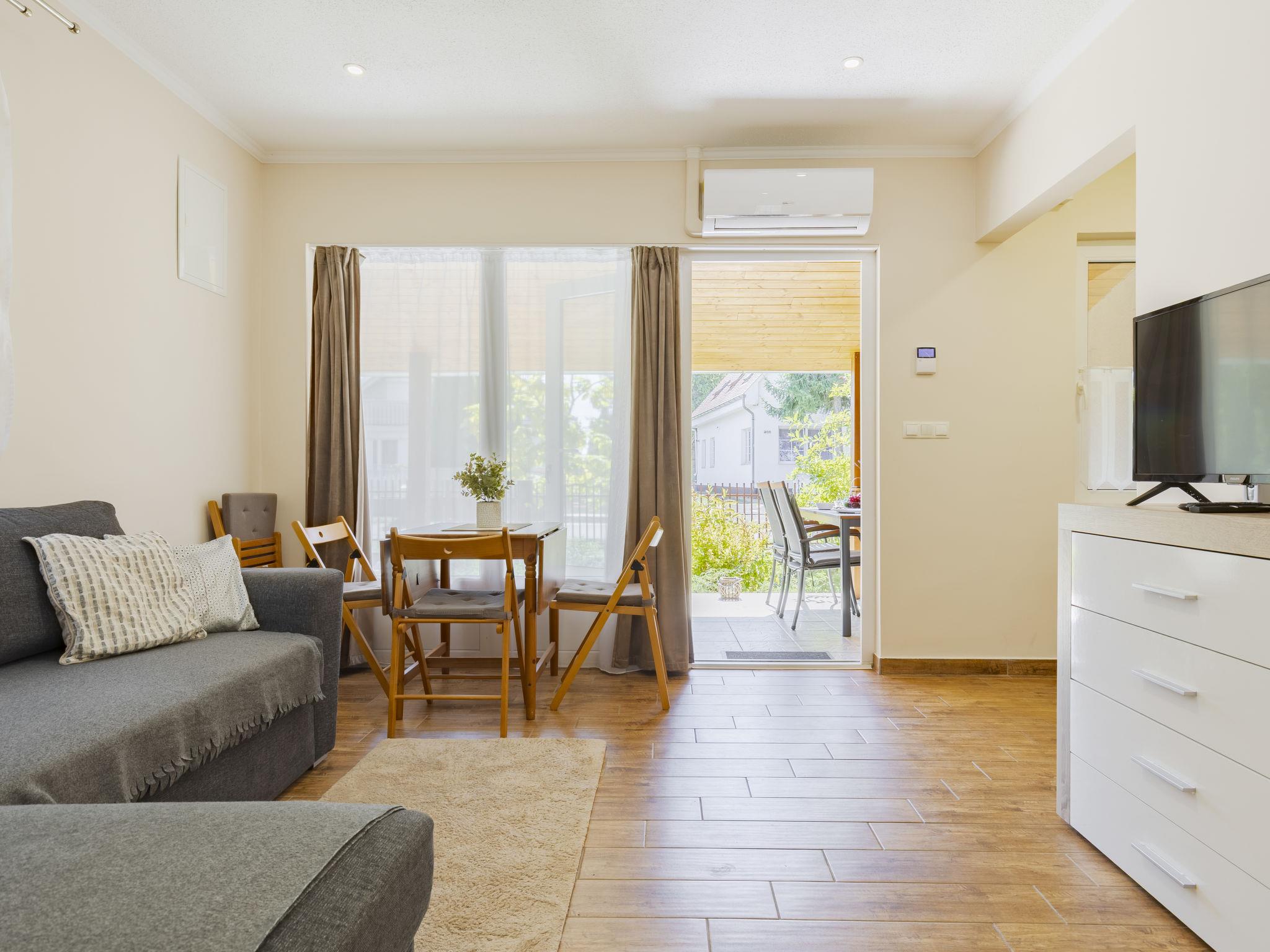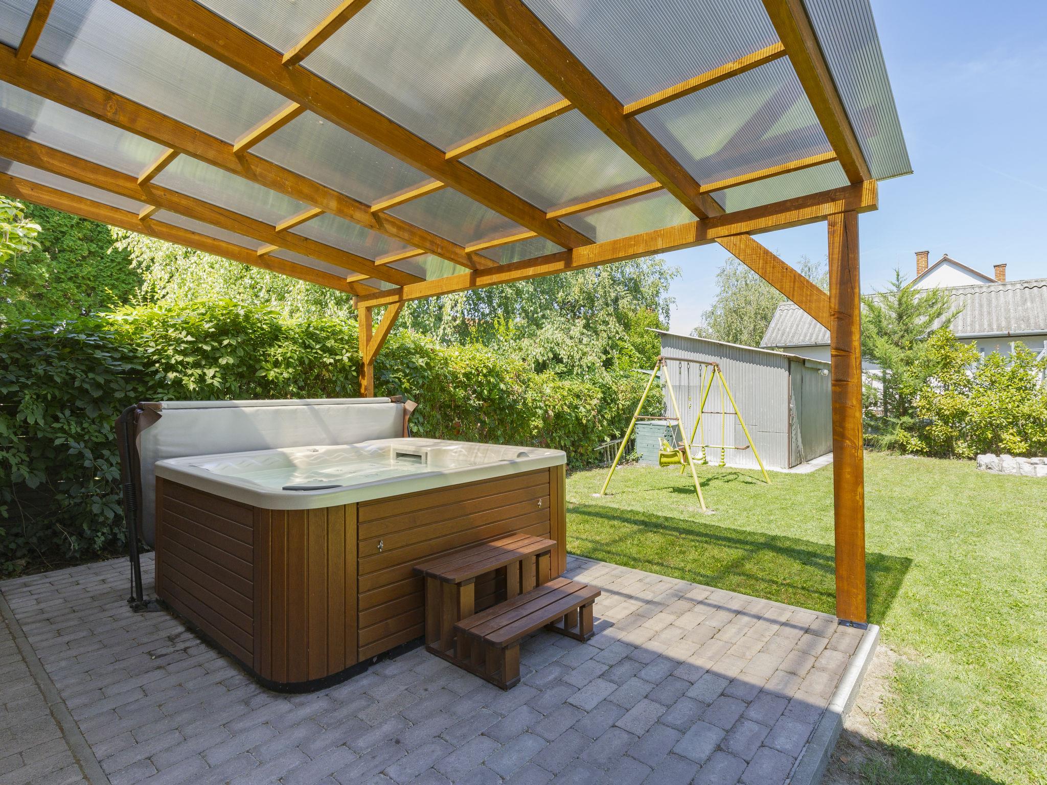 Balatonmáriafürdö 28 km from Balatonlelle: Cosy, comfortable semi-detached house "Wild Grape". In a sunny position in the residential district, 200 m from the lake, 600 m from the beach. Private: hot tub, terrace, barbecue (swing). In the house: WiFi, air conditioning. Parking (for 2 cars) on the premises. Grocery 650 m, restaurant 550 m, bicycle rental 6 km, bus stop "Balatonmáriafürdo, Bükkfa utca" 1.3 km, railway station "Balatonmáriafürdo" 2.5 km, thermal baths "Csisztafürdo" 33 km. Golf course (18 hole) 36 km, tennis 6 km, riding stable 30 km, cycle lane 200 m, children's playground 2 km. Nearby attractions: Kis-Balaton Visitor Center 14 km, Festetics Castle - Keszthely 22 km, Balatonlelle Ferris Wheel 29 km, Siófok Water Tower 62 km, Balaton Museum - Keszthely 18 km, Petting Zoo - Fenyvespuszta 29 km. Please note: railway line closeby 100 m from the property.