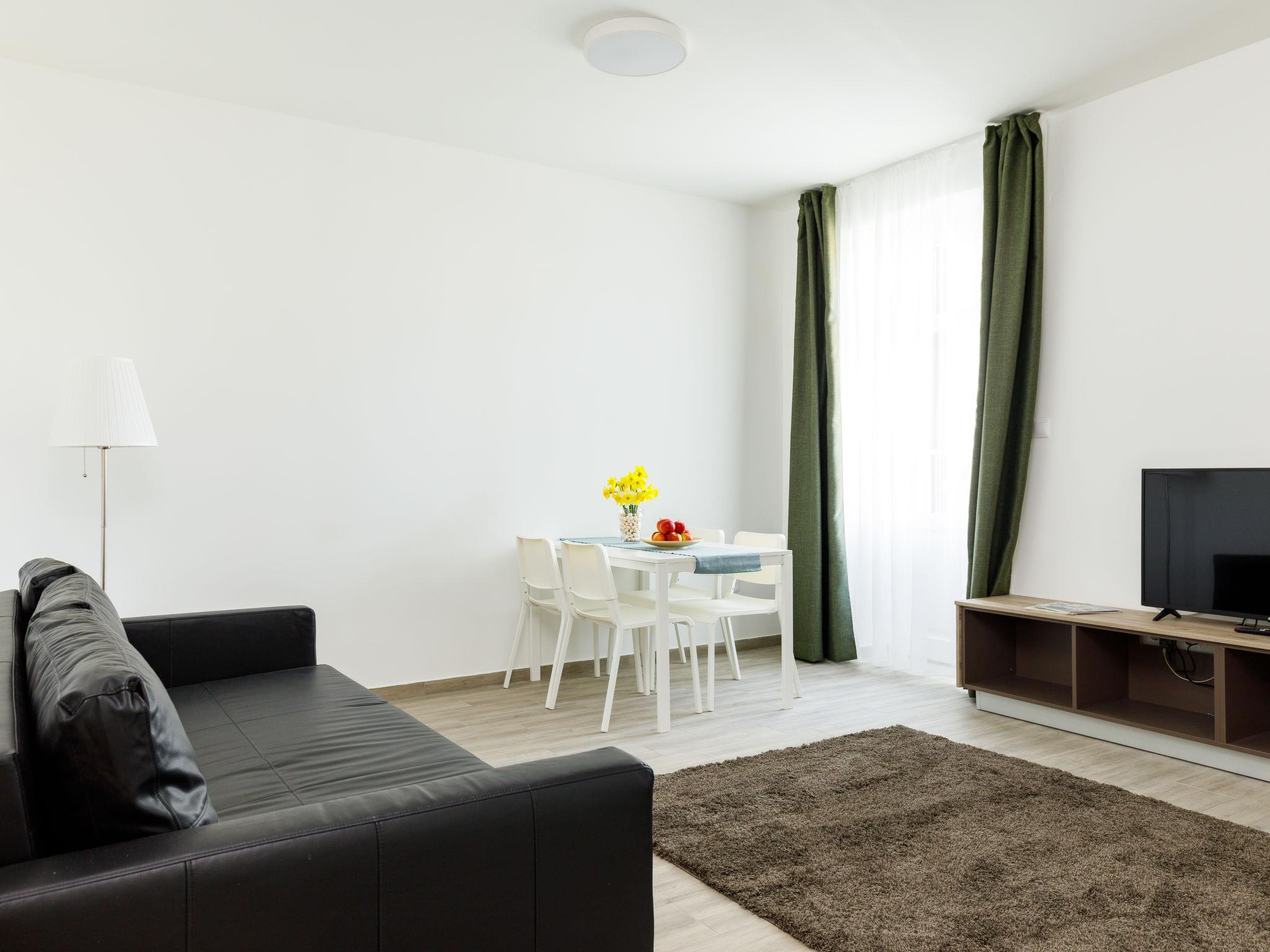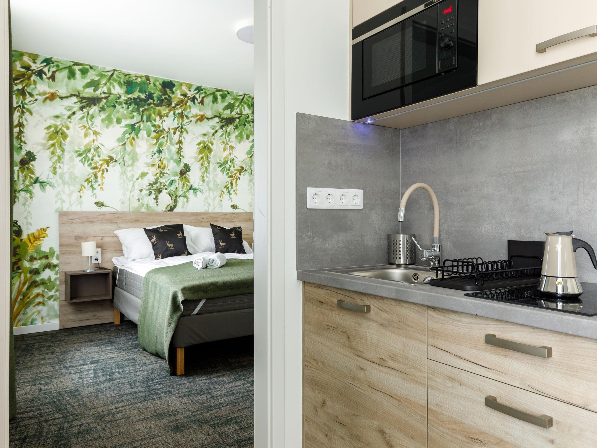 "Park 3", 2-room apartment on the ground floor. Beautiful and modern furnishings: open large living/dining room with 2 sofabeds and cable TV (flat screen). Exit to the terrace. 1 double bedroom with 1 french bed (160 cm, length 200 cm). Small, open kitchen (2 ceramic glass hob hotplates, microwave, electric coffee machine). Shower/WC. Floor heating. Solar power. Terrace, north-west facing position. Terrace furniture. Facilities: children's high chair, baby cot (extra), hair dryer. Internet (WiFi). Please note: apartment street side. Type of coffee machine: Nespresso.