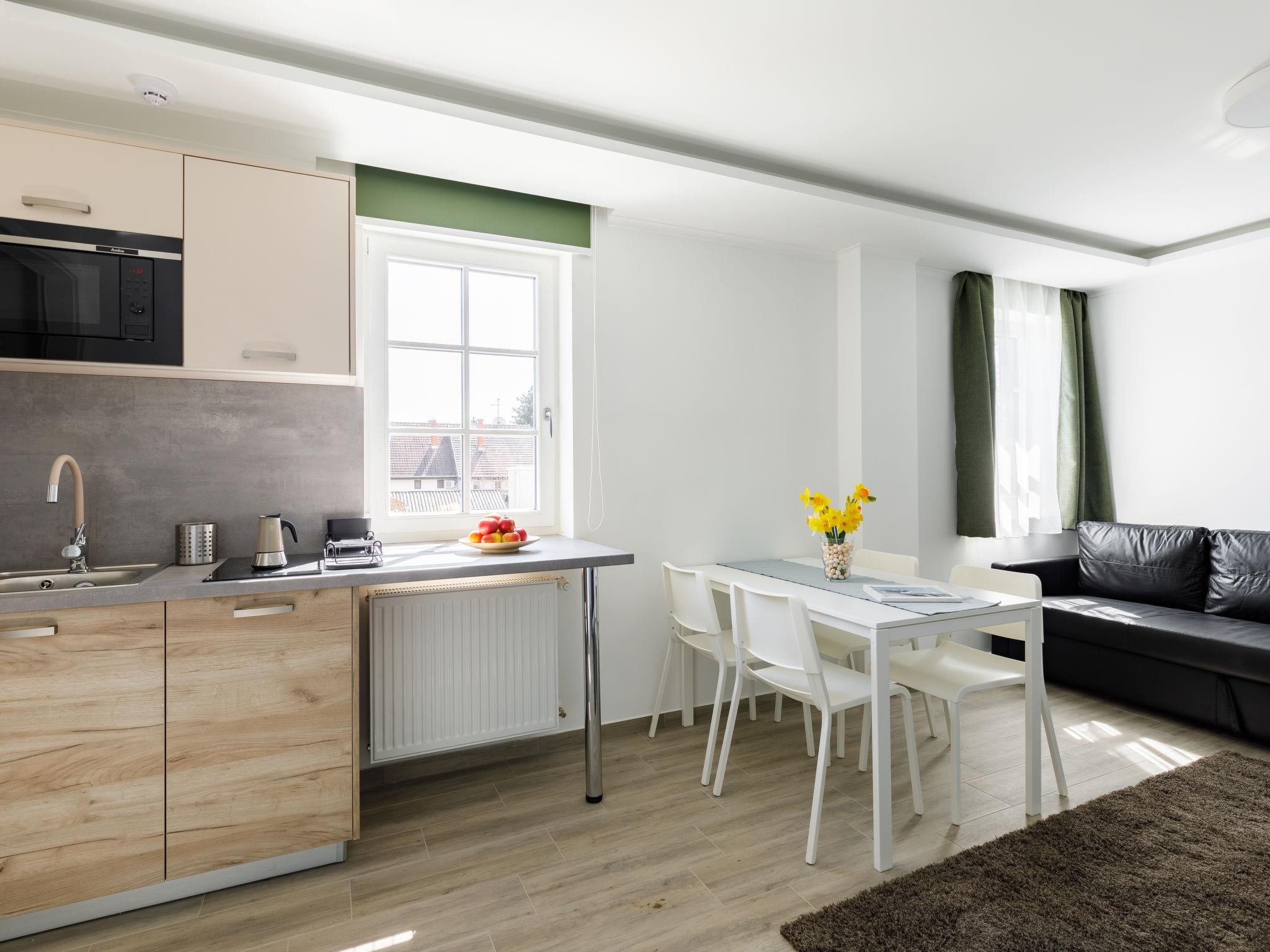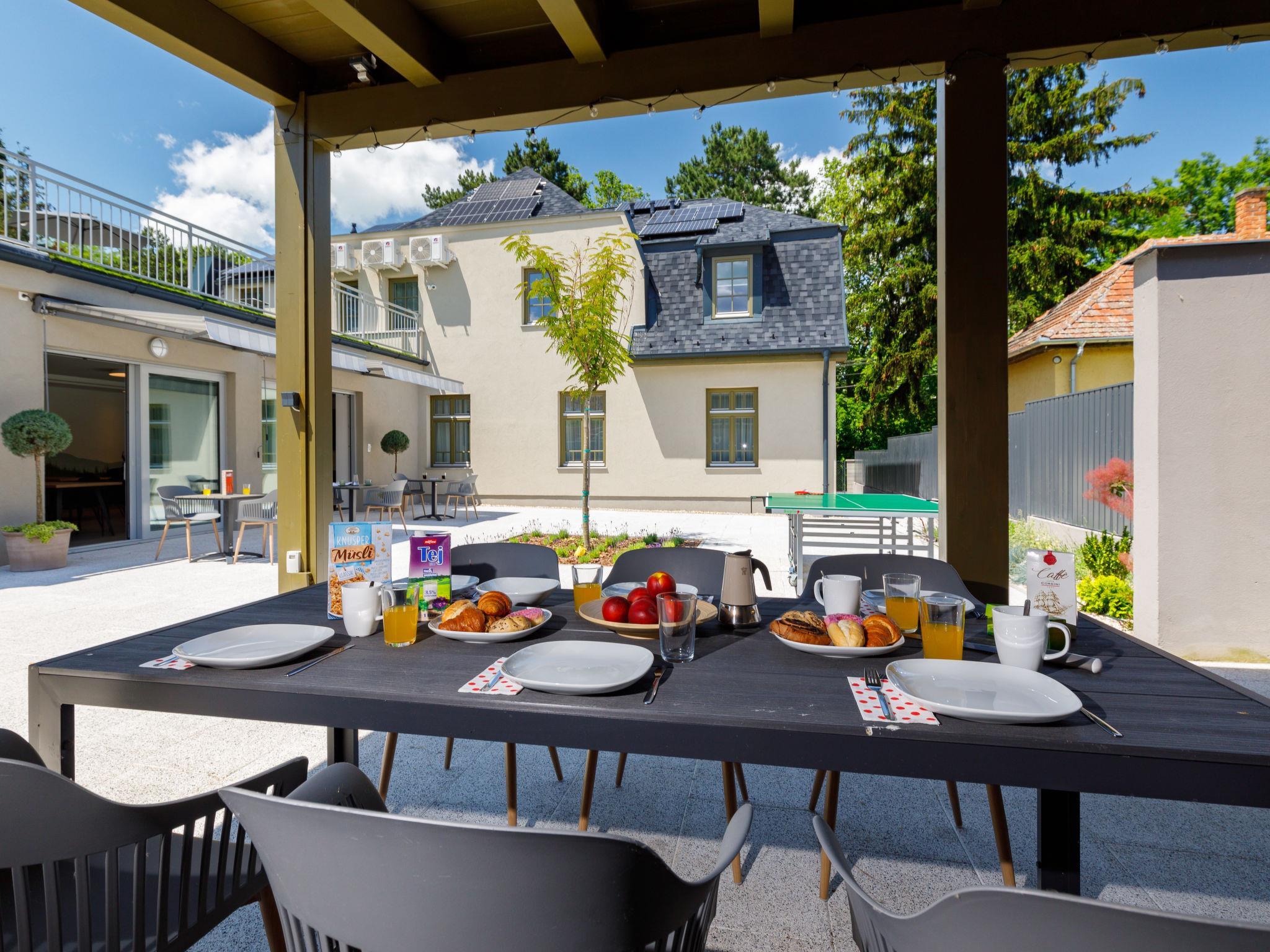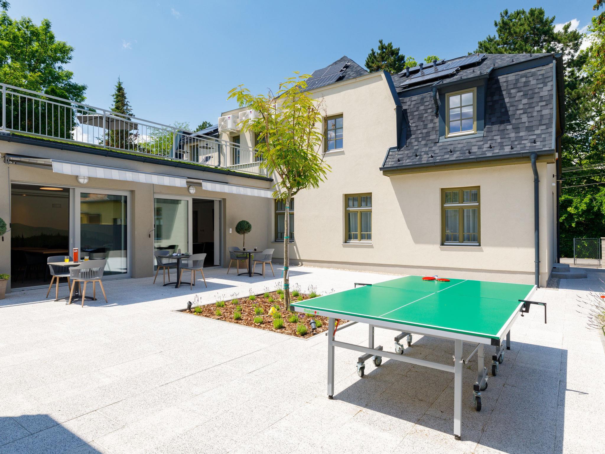 "Park Residence 19", 10-room villa on 2 levels. Beautiful and modern furnishings: open living/dining room, window onto the courtyard with 1 sofabed, dining table, kitchen corner, shower/WC and cable TV (flat screen). 1 double bedroom with 1 french bed (160 cm, length 200 cm). Studio, window onto the courtyard with 1 french bed (160 cm, length 200 cm), dining nook, kitchen corner, shower/WC and cable TV (flat screen). Open living/dining room with 1 double sofabed, dining table, kitchen corner, shower/WC and cable TV (flat screen). Exit to the terrace. 1 double bedroom with 1 french bed (160 cm, length 200 cm). Billiard room with dining table, kitchen corner, separate WC and cable TV (flat screen). Exit to the terrace. Small kitchenette (2 hot plates, microwave). Upper floor: open living/dining room with dining table, kitchen corner, shower/WC and cable TV (flat screen). 1 double bedroom with 1 french bed (160 cm, length 200 cm). Open living/dining room with dining table, kitchen corner, shower/WC and cable TV (flat screen). 2 double bedrooms, each room with 1 french bed (160 cm, length 200 cm). Open kitchen (microwave, electric coffee machine). Air-conditioning, floor heating. Solar power. Facilities: children's high chair, baby cot (extra), hair dryer. All apartments are equipped with an electric coffee maker, microwave and double hotplates.