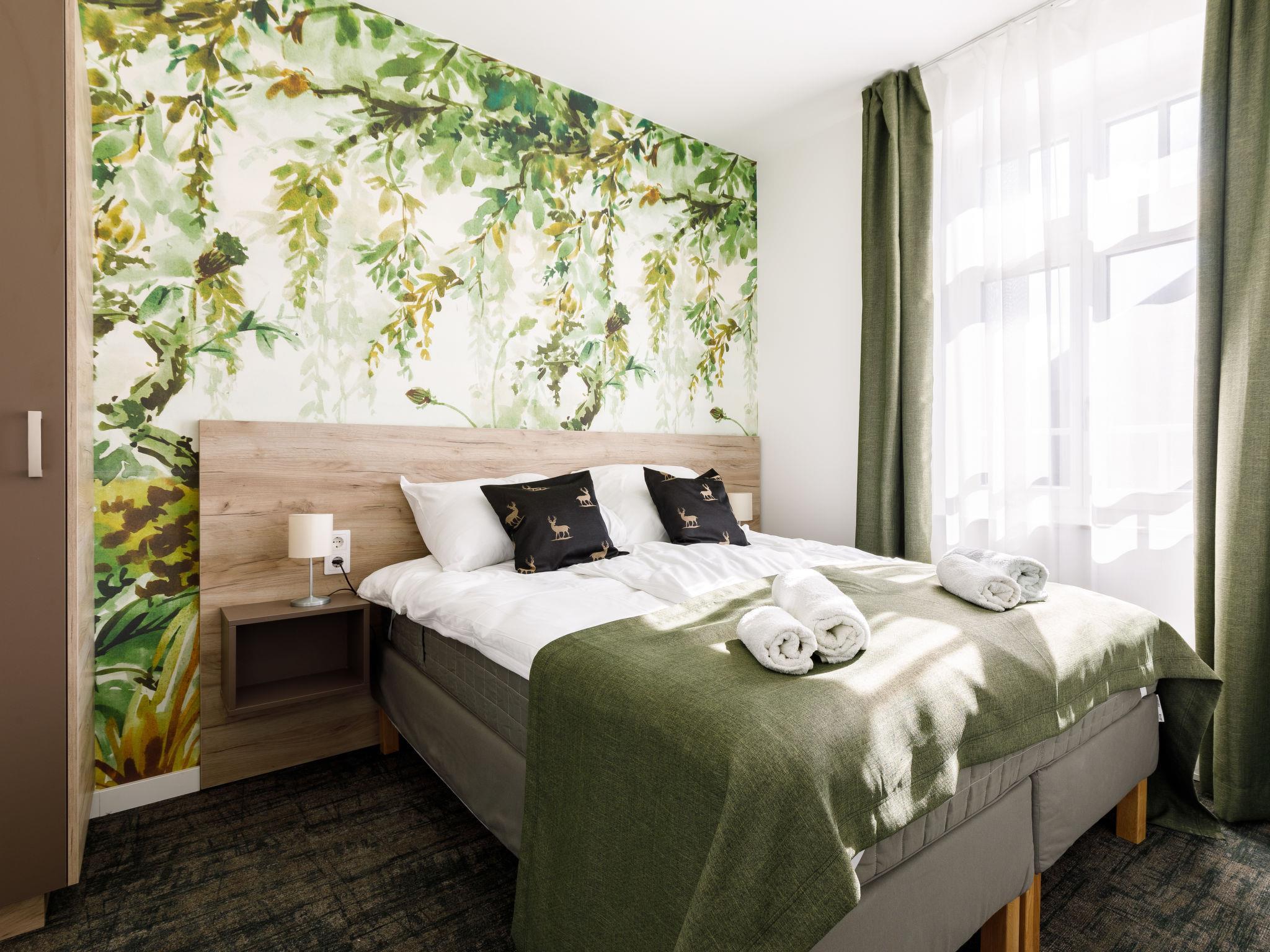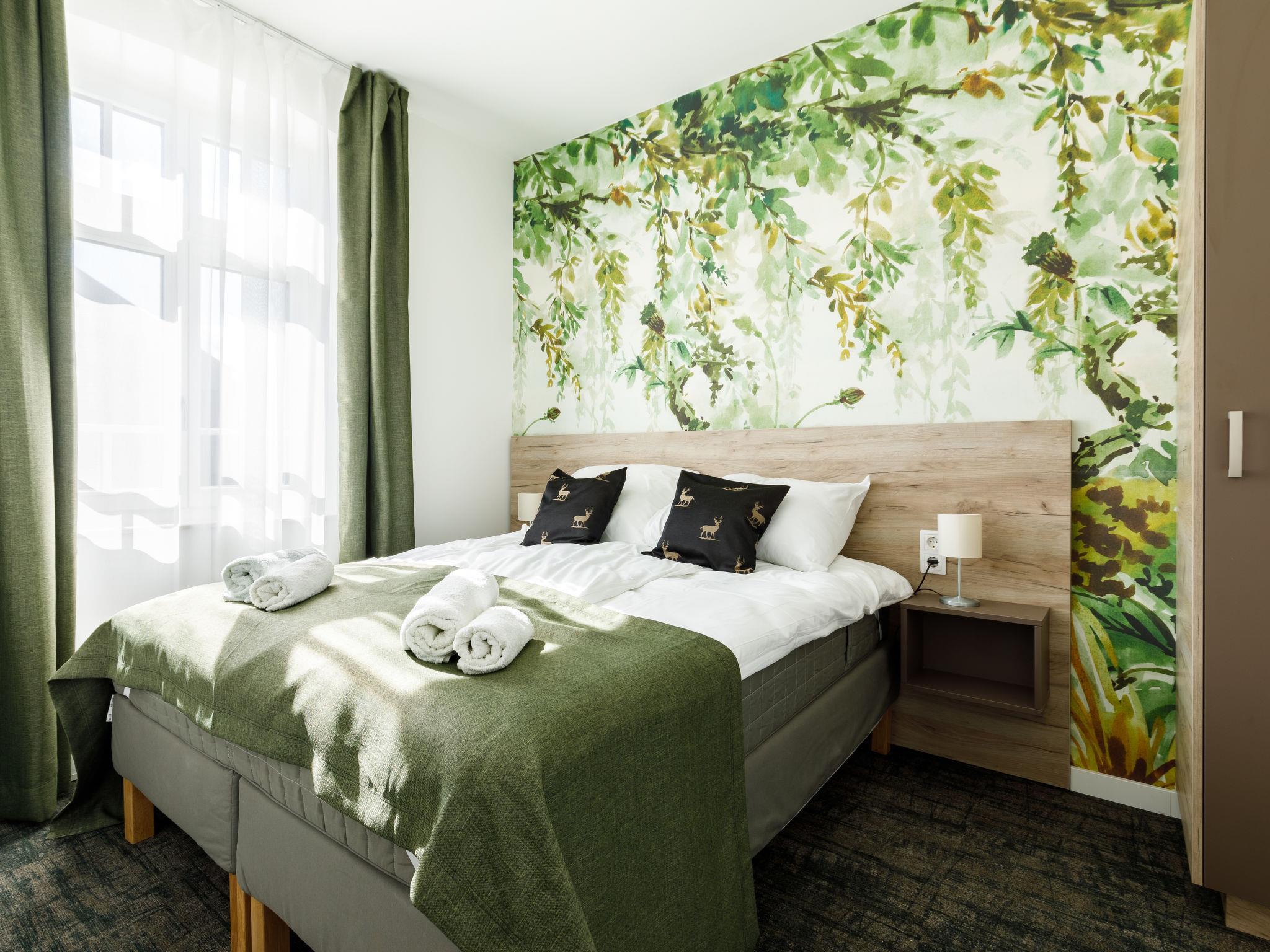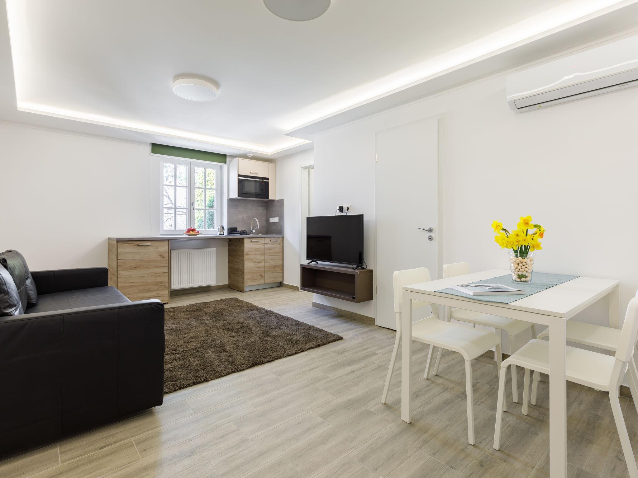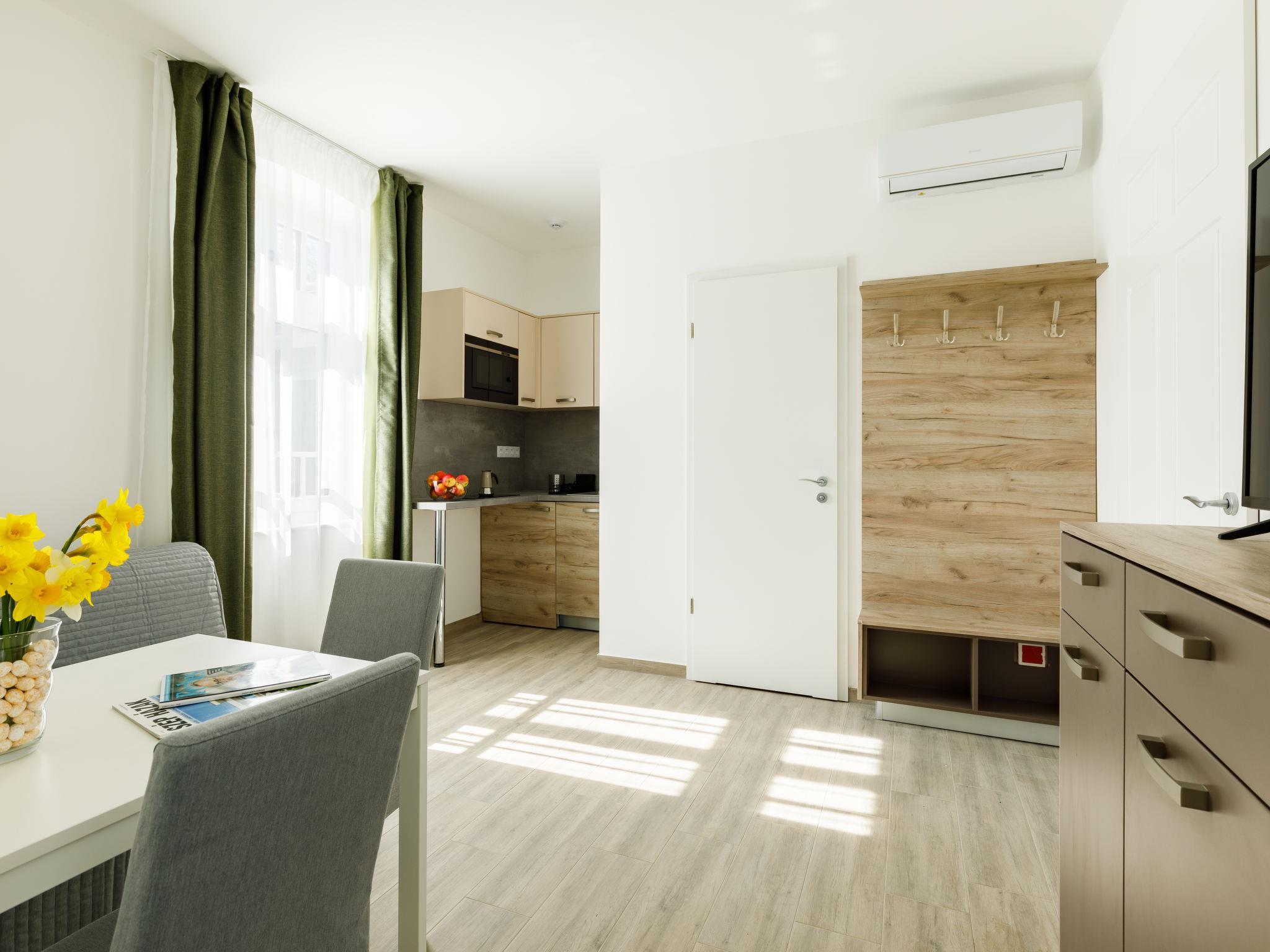 "Park Residence 19", 10-room villa on 2 levels. Beautiful and modern furnishings: open living/dining room, window onto the courtyard with 1 sofabed, dining table, kitchen corner, shower/WC and cable TV (flat screen). 1 double bedroom with 1 french bed (160 cm, length 200 cm). Studio, window onto the courtyard with 1 french bed (160 cm, length 200 cm), dining nook, kitchen corner, shower/WC and cable TV (flat screen). Open living/dining room with 1 double sofabed, dining table, kitchen corner, shower/WC and cable TV (flat screen). Exit to the terrace. 1 double bedroom with 1 french bed (160 cm, length 200 cm). Billiard room with dining table, kitchen corner, separate WC and cable TV (flat screen). Exit to the terrace. Small kitchenette (2 hot plates, microwave). Upper floor: open living/dining room with dining table, kitchen corner, shower/WC and cable TV (flat screen). 1 double bedroom with 1 french bed (160 cm, length 200 cm). Open living/dining room with dining table, kitchen corner, shower/WC and cable TV (flat screen). 2 double bedrooms, each room with 1 french bed (160 cm, length 200 cm). Open kitchen (microwave, electric coffee machine). Air-conditioning, floor heating. Solar power. Facilities: children's high chair, baby cot (extra), hair dryer. All apartments are equipped with an electric coffee maker, microwave and double hotplates.